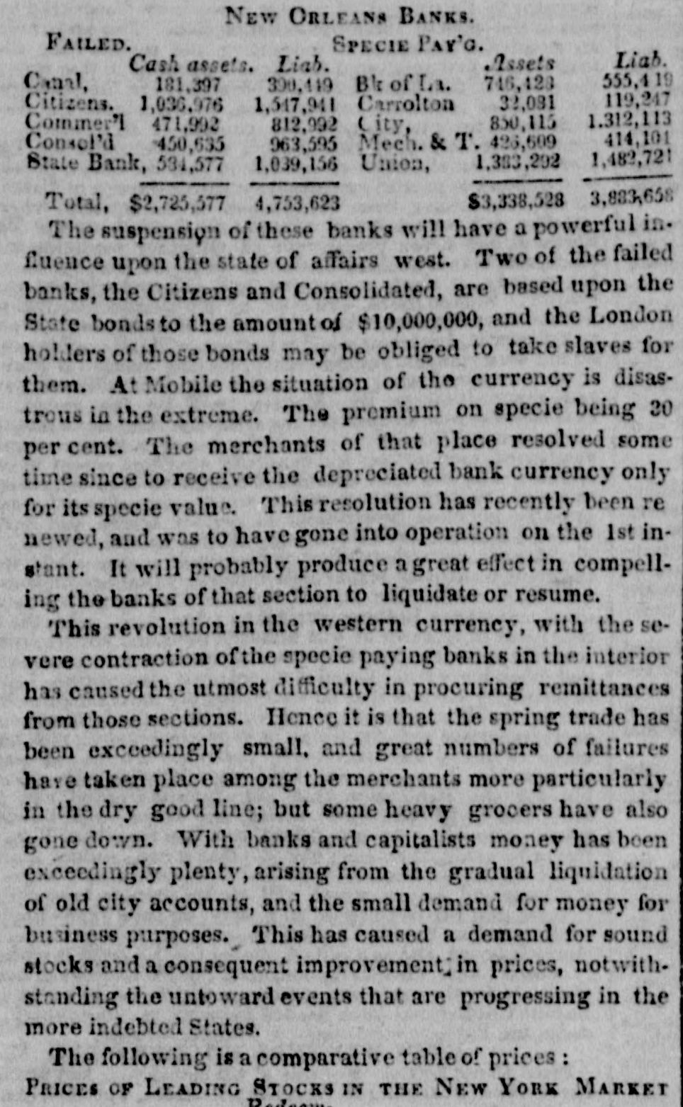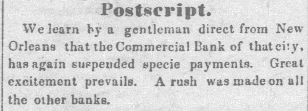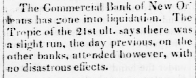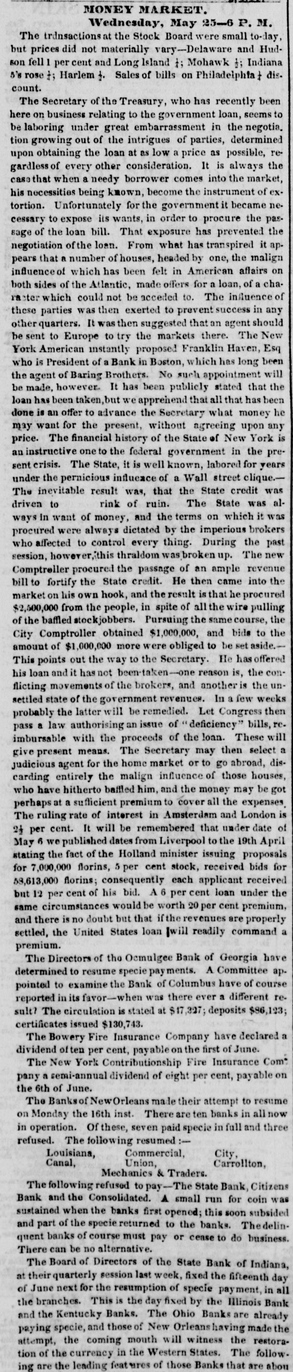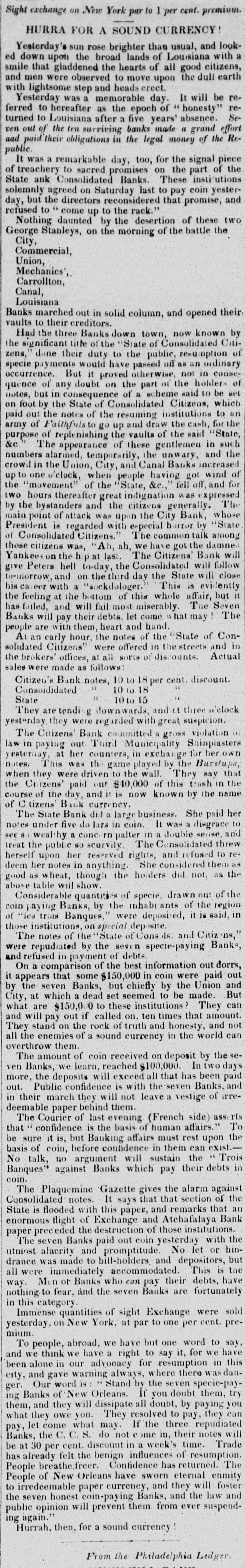 HURRA FOR A SOUND CURRENCY Yesterday's sun rose brighter than usual, and looked down upon the broad lands of Louisiana with a smile that gladdened the hearts of all good citizens, and men were observed to move upon the dull earth with lightsome step and heads erect. be reYesterday was a memorable day. It will ferred to hereafter as the epoch of " honesty" returned to Louisiana after a five years' absence. Seven out of the ten surviving banks made a grand effort aad paid their obligations in the legal money of the Republic. It was a remarkable day, too, for the signal piece of treachery to sacred promises on the part of the State ank Consolidated Banks. These institutions solemnly agreed on Saturday last to pay coin yesterday, but the directors reconsidered that promise, and refused to come up to the rack." two Nothing daunted by the desertion of these George Stanleys, on the morning of the battle the City, Commercial, Union, Mechanics' Carrollton, Canal, Louisiana Banks marched out in solid column, and opened their vaults to their creditors. Had the three Banks down town, now known by the significant title of the 'State of Consolidated Citizens, done their duty to the public, resumption of specie payments would have passed of as an ordinary occurrence. But it proved otherWise, not in consequence of any doubt on the part of the holder of notes, but in consequence of a scheme said to be set on foot by the State of Consolidated Citizens, which paid out the notes of the resuming institutions to an army of Faithfuls to go up and draw the cash, for the purpose of replenishing the vaults of the said "State, &c The appearance of these gentlemen in such numbers alarmed, temporarily, the unwary, and the crowd in the Union, City, and Canal Banks increased up one o'clock, when people having got wind of the "movement" of the "State, &c., fell off and for two hours thereafter great indignation was expressed by the bystanders and the citizens generally. The main point of attack was upon the City Bank, whose President is regarded with especial horror by "State of Consolidated Citizens." The common talk among those citizens was, Ah, ah, we have got damne. Yankees on the hip at last. The Citizens' Bank will give Peters hell to-day, the Consolidated will follow to-morrow, and on the third day the State will close his weer with a "sockdologer.' This is evidently the feeling at the bottom of this whole affair, but It has failed, and will fail most miserably. The Seven Banks will pay their debts, let come hat may The people are with them, heart and hand. Au early hour, the notes of the "State of Consolidated Citizens" were offered in the streets and in the brokers' offices, at all sorts of discounts. Actual were made as follows Citizen's Bank notes, 10 to 18 per cent. discount. Consoididated " 10 to 18 State 101515 They are tendi downwards, and it three clock yesterday, they were regarded with great suspicion. is The Citizens' Bank committed gross violation law in paying out Third Municipality Shinpiasters yesterday, at her counters, in exchange for her own notes. This was th game played by the Burstups, when they were driven to the wall. They say that the Citizens' paid out $40,000 of this trash in the course of the day, and " is now known by the name of Citizens Bank currency. The State Bank did large business. She paid her notes under five do lara in coin. It was a disgrace to see S wealthy a conc rn palter in a double serise. and treat the public so scurvily The Consolidated threw herself upon her reserved rights, and refused to redeem her notes in anything. She considered them as good as wheat, though the holders did not, as the above table will show. Considerable quantities of specie, drawn out of the coin paying Banks, by the inhabiants of the region of "les trois Banques," were deposited, it is said, in those institutions, on special deposite. The notes of the "State of Cons ls. and Citiz ns, were repudiated by the seven specie-paying Bank and refused in payment of debts On a comparison of the best information out dorrs, it appears that some $150,000 in coin were paid out by the seven Banks, but chiefly by the Union and City, at which a dead set seemed to be made. But what are $150,000 to these institutions? They can and will pay out if called on. ten times that amount They stand on the rock of truth and honesty, and not all the enemies of a sound currency in the world can overthrow them. The amount of coin received on deposit by the seven Banks, we learn, reached $100,000. two days more, the deposits will exceed all that has been paid out. Public confidence is with the-seven Banks, and in their march they will not leave a vestige of irredeemable paper behind them. The Courier of last evening (French side) asserts that " confidence is the basis of human affairs." To be sure it is, but Banking affairs must rest upon the basis of coin, before confidence in them can exist.No talk, no argument will sustain the " Trois Banques" against Banks which pay their debts in coin. The Plaquemine Gazette gives the alarm against Consolidated notes. It says that that section of the State is flooded with this paper, and remarks that an enormous flight of Exchange and Atchafalaya Bank iper preceded the destruction of those institutions. The seven Banks paid out coin yesterday with the utmost alacrity and promptitude. No let or hindrance was made to bill-holders and depositors, but all were immediately accommodated. This is the way. Men or Banks who can pay their debts, have nothing to fear, and the seven Banks are fortunately in this category. Immense quantities of sight Exchange were sold yesterday, on New York, at par to one per cent. premium. To people, abroad, we have but one word to say, and we think we have a right to say it, for we have been alone in our advocacy for resumption in this city, and gave warning always, where there was danger. Our word is Stand by the seven specie-paying Banks of New Orleans. if you 
