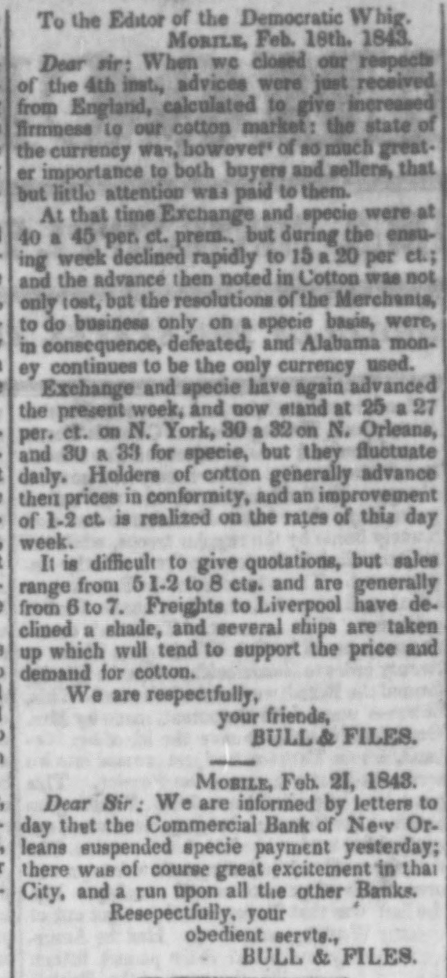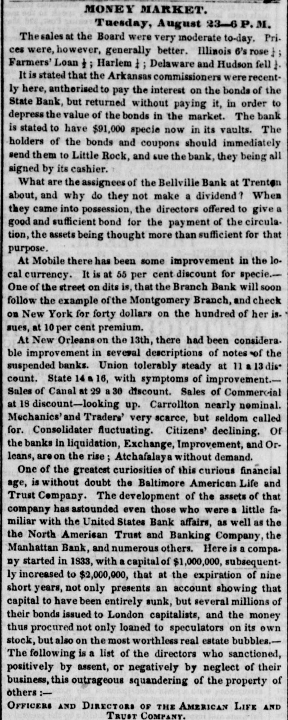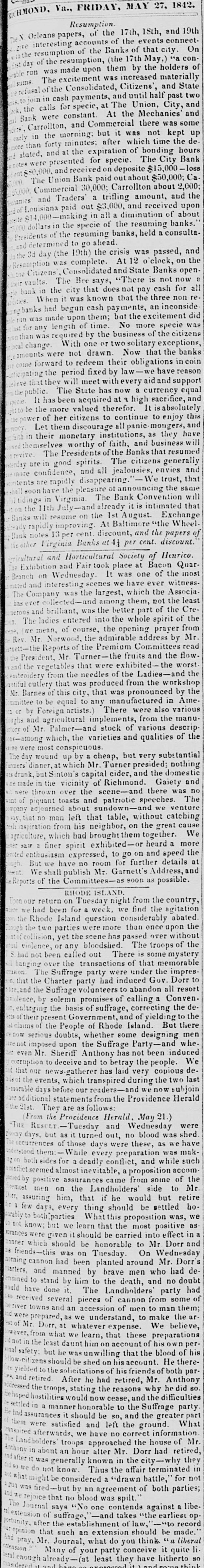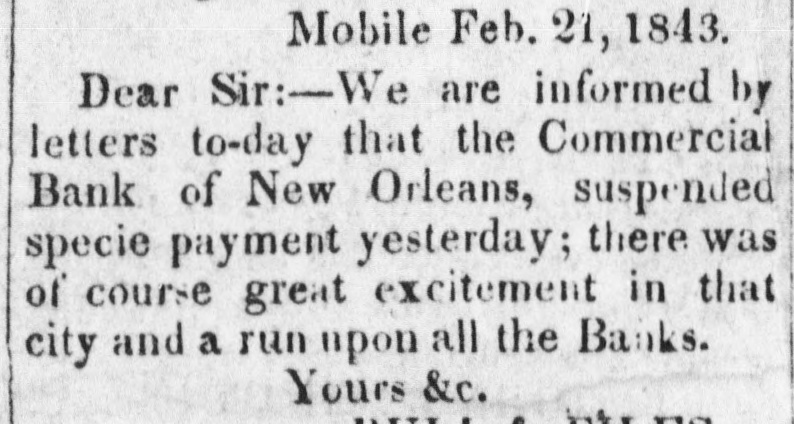 HURRA FOR A SOUND CURRENCY Yesterday's sun rose brighter than usual, and looked down upon the broad lands of Louisiana with a smile that gladdened the hearts of all good citizens, and men were observed to move upon the dull earth with lightsome step and heads erect. be reYesterday was a memorable day. It will ferred to hereafter as the epoch of " honesty" returned to Louisiana after a five years' absence. Seven out of the ten surviving banks made a grand effort aad paid their obligations in the legal money of the Republic. It was a remarkable day, too, for the signal piece of treachery to sacred promises on the part of the State ank Consolidated Banks. These institutions solemnly agreed on Saturday last to pay coin yesterday, but the directors reconsidered that promise, and refused to come up to the rack." two Nothing daunted by the desertion of these George Stanleys, on the morning of the battle the City, Commercial, Union, Mechanics' Carrollton, Canal, Louisiana Banks marched out in solid column, and opened their vaults to their creditors. Had the three Banks down town, now known by the significant title of the 'State of Consolidated Citizens, done their duty to the public, resumption of specie payments would have passed of as an ordinary occurrence. But it proved otherWise, not in consequence of any doubt on the part of the holder of notes, but in consequence of a scheme said to be set on foot by the State of Consolidated Citizens, which paid out the notes of the resuming institutions to an army of Faithfuls to go up and draw the cash, for the purpose of replenishing the vaults of the said "State, &c The appearance of these gentlemen in such numbers alarmed, temporarily, the unwary, and the crowd in the Union, City, and Canal Banks increased up one o'clock, when people having got wind of the "movement" of the "State, &c., fell off and for two hours thereafter great indignation was expressed by the bystanders and the citizens generally. The main point of attack was upon the City Bank, whose President is regarded with especial horror by "State of Consolidated Citizens." The common talk among those citizens was, Ah, ah, we have got damne. Yankees on the hip at last. The Citizens' Bank will give Peters hell to-day, the Consolidated will follow to-morrow, and on the third day the State will close his weer with a "sockdologer.' This is evidently the feeling at the bottom of this whole affair, but It has failed, and will fail most miserably. The Seven Banks will pay their debts, let come hat may The people are with them, heart and hand. Au early hour, the notes of the "State of Consolidated Citizens" were offered in the streets and in the brokers' offices, at all sorts of discounts. Actual were made as follows Citizen's Bank notes, 10 to 18 per cent. discount. Consoididated " 10 to 18 State 101515 They are tendi downwards, and it three clock yesterday, they were regarded with great suspicion. is The Citizens' Bank committed gross violation law in paying out Third Municipality Shinpiasters yesterday, at her counters, in exchange for her own notes. This was th game played by the Burstups, when they were driven to the wall. They say that the Citizens' paid out $40,000 of this trash in the course of the day, and " is now known by the name of Citizens Bank currency. The State Bank did large business. She paid her notes under five do lara in coin. It was a disgrace to see S wealthy a conc rn palter in a double serise. and treat the public so scurvily The Consolidated threw herself upon her reserved rights, and refused to redeem her notes in anything. She considered them as good as wheat, though the holders did not, as the above table will show. Considerable quantities of specie, drawn out of the coin paying Banks, by the inhabiants of the region of "les trois Banques," were deposited, it is said, in those institutions, on special deposite. The notes of the "State of Cons ls. and Citiz ns, were repudiated by the seven specie-paying Bank and refused in payment of debts On a comparison of the best information out dorrs, it appears that some $150,000 in coin were paid out by the seven Banks, but chiefly by the Union and City, at which a dead set seemed to be made. But what are $150,000 to these institutions? They can and will pay out if called on. ten times that amount They stand on the rock of truth and honesty, and not all the enemies of a sound currency in the world can overthrow them. The amount of coin received on deposit by the seven Banks, we learn, reached $100,000. two days more, the deposits will exceed all that has been paid out. Public confidence is with the-seven Banks, and in their march they will not leave a vestige of irredeemable paper behind them. The Courier of last evening (French side) asserts that " confidence is the basis of human affairs." To be sure it is, but Banking affairs must rest upon the basis of coin, before confidence in them can exist.No talk, no argument will sustain the " Trois Banques" against Banks which pay their debts in coin. The Plaquemine Gazette gives the alarm against Consolidated notes. It says that that section of the State is flooded with this paper, and remarks that an enormous flight of Exchange and Atchafalaya Bank iper preceded the destruction of those institutions. The seven Banks paid out coin yesterday with the utmost alacrity and promptitude. No let or hindrance was made to bill-holders and depositors, but all were immediately accommodated. This is the way. Men or Banks who can pay their debts, have nothing to fear, and the seven Banks are fortunately in this category. Immense quantities of sight Exchange were sold yesterday, on New York, at par to one per cent. premium. To people, abroad, we have but one word to say, and we think we have a right to say it, for we have been alone in our advocacy for resumption in this city, and gave warning always, where there was danger. Our word is Stand by the seven specie-paying Banks of New Orleans. if you 