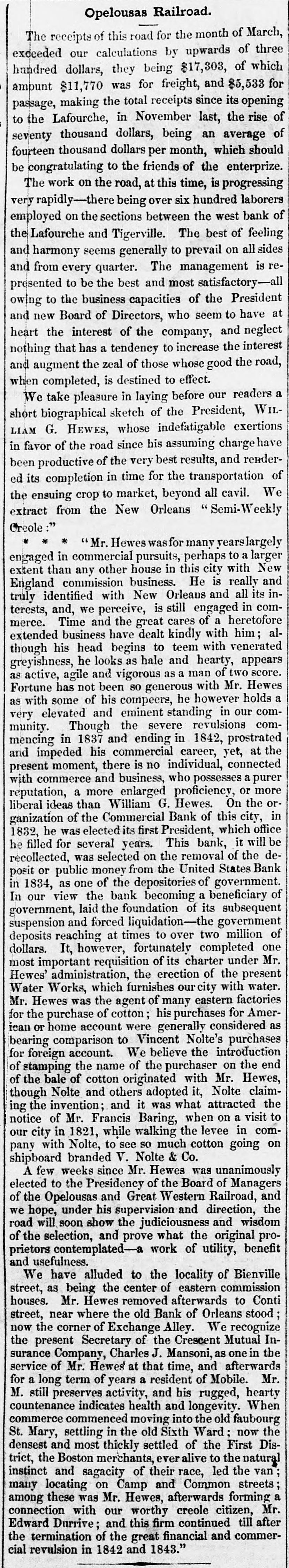Opelousas Railroad. The receipts of this road for the month of March, exceeded our calculations by upwards of three hundred dollars, they being $17,303, of which amount $11,770 was for freight, and $5,533 for passage, making the total receipts since its opening to the Lafourche, in November last, the rise of seventy thousand dollars, being an average of fourteen thousand dollars per month, which should be congratulating to the friends of the enterprize. The work on the road, at this time, is progressing very rapidly-there being over six hundred laborers employed on the sections between the west bank of the Lafourche and Tigerville. The best of feeling and harmony seems generally to prevail on all sides and from every quarter. The management is represented to be the best and most satisfactory-all owing to the business capacities of the President and new Board of Directors, who seem to have at heart the interest of the company, and neglect nothing that has a tendency to increase the interest and augment the zeal of those whose good the road, when completed, is destined to effect. We take pleasure in laying before our readers a short biographical sketch of the President, WILLIAM G. HEWES, whose indefatigable exertions in favor of the road since his assuming charge have been productive of the very best results, and rendered its completion in time for the transportation of the ensuing crop to market, beyond all cavil. We extract from the New Orleans Semi-Weekly Creole Mr. Hewes was for many years largely engaged in commercial pursuits, perhaps to a larger extent than any other house in this city with New England commission business. He is really and truly identified with New Orleans and all its interests, and, we perceive, is still engaged in commerce. Time and the great cares of a heretofore extended business have dealt kindly with him; although his head begins to teem with venerated greyishness, he looks as hale and hearty, appears as active, agile and vigorous as a man of two score. Fortune has not been SO generous with Mr. Hewes as with some of his compeers, he however holds a very elevated and eminent standing in our community. Though the severe revulsions commencing in 1837 and ending in 1842, prostrated and impeded his commercial career, yet, at the present moment, there is no individual, connected with commerce and business, who possesses a purer reputation, a more enlarged proficiency, or more liberal ideas than William G. Hewes. On the organization of the Commercial Bank of this city, in 1832, he was elected its first President, which office he filled for several years. This bank, it will be recollected, was selected on the removal of the deposit or public money from the United States Bank in 1834, as one of the depositories of government. In our view the bank becoming a beneficiary of government, laid the foundation of its subsequent suspension and forced liquidation-the government deposits reaching at times to over two million of dollars. It, however, fortunately completed one most important requisition of its charter under Mr. Hewes' administration, the erection of the present Water Works, which furnishes our city with water. Mr. Hewes was the agent of many eastern factories for the purchase of cotton; his purchases for American or home account were generally considered as bearing comparison to Vincent Nolte's purchases for foreign account. We believe the introduction of stamping the name of the purchaser on the end of the bale of cotton originated with Mr. Hewes, though Nolte and others adopted it, Nolte claiming the invention; and it was what attracted the notice of Mr. Francis Baring, when on a visit to our city in 1821, while walking the levee in company with Nolte, to see SO much cotton going on shipboard branded V. Nolte & Co. A few weeks since Mr. Hewes was unanimously elected to the Presidency of the Board of Managers of the Opelousas and Great Western Railroad, and we hope, under his supervision and direction, the road will soon show the judiciousness and wisdom of the selection, and prove what the original proprietors contemplated-a work of utility, benefit and usefulness. We have alluded to the locality of Bienville street, as being the center of eastern commission houses. Mr. Hewes removed afterwards to Conti street, near where the old Bank of Orleans stood now the corner of Exchange Alley. We recognize the present Secretary of the Crescent Mutual Insurance Company, Charles J. Mansoni, as one in the service of Mr. Hewes at that time, and afterwards for a long term of years a resident of Mobile. Mr. M. still preserves activity, and his rugged, hearty countenance indicates health and longevity. When commerce commenced moving into the old faubourg St. Mary, settling in the old Sixth Ward now the densest and most thickly settled of the First District, the Boston merchants, ever alive to the natural instinct and sagacity of their race, led the van; many locating on Camp and Common streets among these was Mr. Hewes, afterwards forming a connection with our worthy creole citizen, Mr. Edward Durrive; and this firm continued till after the termination of the great financial and commercial revulsion in 1842 and 1843."