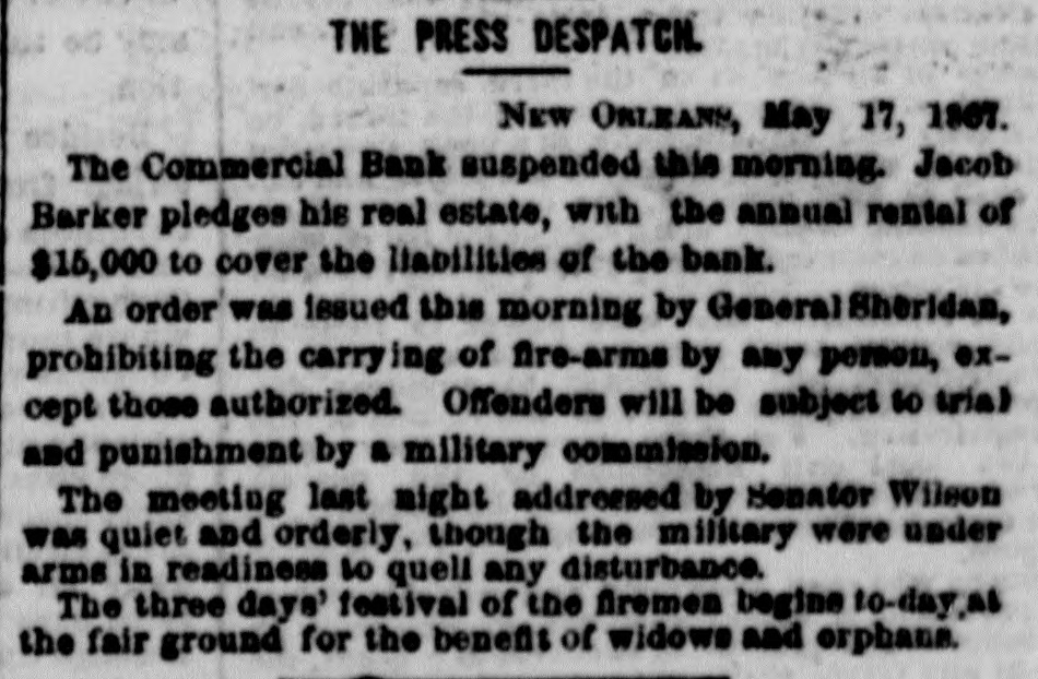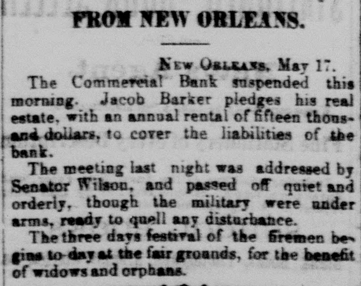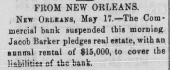 -The Commercial Bank of New-Orleans suspended payment Thursday morning. Jacob Barker pledges his real estate and an annual rental of $15,000 to cover the liabilities.
