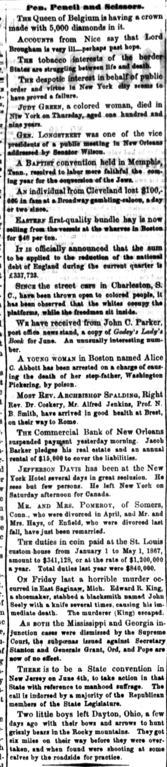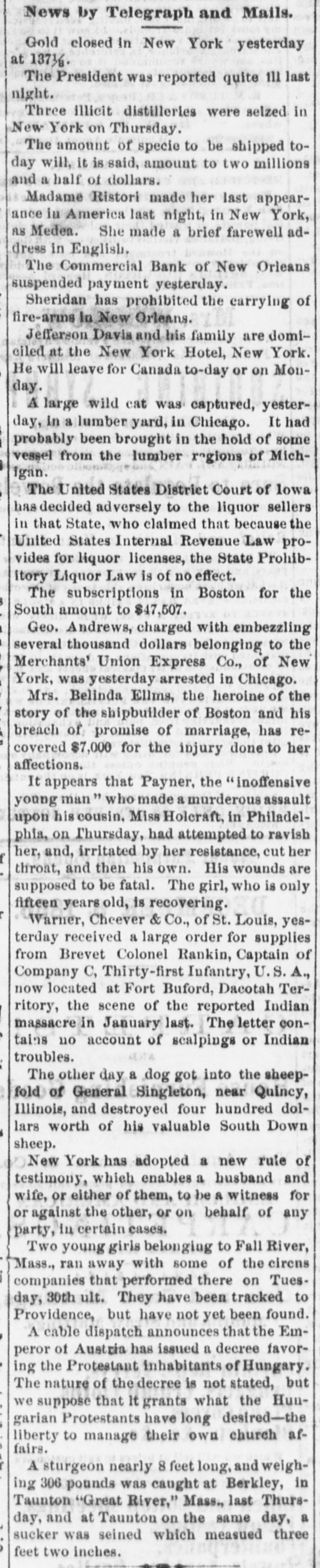 -Last week a fellow in Chicago attempted to commit a rape on a little girl, 12 years old. Being caught, he saved a trial by cutting his own throat.