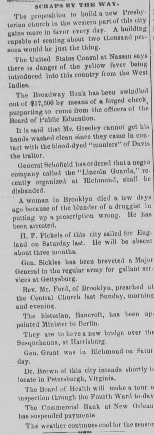 -On Wednesday of last week, a colored man in Harrisburg, had his head completely severed from his body, by a locomotive. His name was Francis Derm.