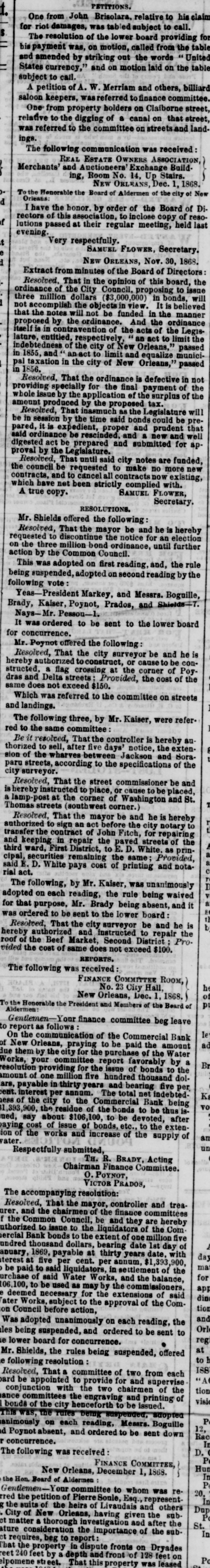 T 01 Pelative uqof most euo $ calling 01 SUM 'seSemep Total 10] The resolution of the lower board providing for table bis payment was, on motion, called from the United sprom the ano sq pepueurs pas the uo monton no pus States call 01 100 A petition of A. W. Merriam and others, billiard saloon keepers, was referred to finance committee. One from property holders on Claiborne street, 100.00 [pue] shat uo canal . jo the 04 relative no committee the 03 referred SUM ings. The following communication was received REAL ESTATE OWNERS Build- ASSOCIATION, Merchants' and Auctioneer Exchange Stairs. dn '11 ON Rood *8981 'I Dee. 'SNVATHO NEW MON 10 ally eqs 10 jo Board the Honorbble Total P I Orleans: have the honor. by order of the Board of of Di- reso, 1881 Adoo incluse 01 this 10 pley meeting regular their 18 pessed rectors [ $ Very respectfully. SAMUEL FLOWER, Secretary. P '8981 '08 *AON ORLEANS, Man Directors JO Board the JO millines more Resolved, That in the opinion of this board, issue the 01 Countili OHO the JO ordinance million dollars ($3,000,000) in bonds, will three accomplish the objects in view. It is believed ordinatio the up pepuni eq you IIIM notes the the you em puv ordination the sq pesodord the the JO action the jo III of limit 01 105 us entited, lature, indebtedness of the city of New Orleans," passed 1855, and an act to limit and equalize munici'9981 III pessed MON JO To the up the [ed at Resolved, That the ordinance is defective in not em the JO jo land the JOJ appetally Providers sujdins em Je application the 4q enset whole 'X81 pesodord eq: sq peopord income IIIM em 88 THE Resolaced that -end eq could spuoq **** emp the 4q session at eq IIem pus product pus redord st " 'pered ordinance be rescinded, and new de 10J pus persded be 108 pies 'pepunj 0.18 setou alla pies Into 1841 em Resolaced 4q Meu ou make 01 eq councill the existing мои contracts II" cancell 01 pas which have net been strictly complied with. .Adoo one V FLORER'S SANUEL Secretary. "SNOLLATIOSE Mr. Shields offered the following: Resolved, That the mayor be and he is election hereby requested to discontinue the notice for an Junther mun ordinate puoq million three em uo action by the Common Council. rale the 'pus 18.rg uo adopted SUM This the sq receipt puoces uo sdopted 'pepuedsns being : 010A John Yeas- President Markey, and Messrs. Boguille, Brady, Kaiser, Poynot, Prados, and Shields-7. It was Nays- Mr. ordered to Pessou-1. be sent to the lower board John the Pought -N 103 Resolved, That the city surveyor be and he is -000 be 04 JO authorized Pog JO corner eye 18 Crossing Seg 8 structed bereby em JO 1800 the states Delia pus serve *091$ peesxe you seed seme pus streets uo committee em 01 referred SEM Which The following three, by Mr. Kaiser, were refer. same the 04 red Be it resolved, That the controller is hereby au exten the notice ever after ""II" 01 thorezed 8108 pus Jackson mistres equal JO surveyor. City the 10 secilistions the 04 secording streets parting Resolved, That the street commissioner be and placed, be 01 esneo 10 place, 04 instructed 48 pus Mashington JO corner the 18 hereby si 8 Thomas streets (southwest corner.) hereby s! eq pus eq MAROT em 184L Resolaed 01 notary ally the before 108 us transfer authorized the to sign contract of John Fitch, for repairing the JO streets person em -mad SB Milter 'a "I 01 District repair First III beendad 'prem pus third securities remaining the same; Provided, 108 This notal pus Printing JO 1800 pays Mille 'a Я pies SUM Katisty ** 4q The " mained being rule equal required cash no adopted pus absent, Baing Brady Will that JOJ was ordered to be sent to the lower board Resolved, That the city surveyor be and he is the repatr 01 pus anthorized .0.ld District puoces Market Beer the hereby 10 *001$ peeoxe you seep eurss JO 1800 the papia 1001 REFORTS* The following was received FINANCE COMMITTEE ROOM, q '11"H AND 23 'ON '8981 'I *pert MeN id To the Honorable the President and Members of the Beard of Aldermen: Gentlemen- Your finance committee beg leave 1 Bauk Commercial the Jo Jollow SV report 01 08 1000ms the pred be 01 the N°N "O Mater the jo Durchase the JOJ and 49 them 10 18 due committee report favorably by a the 01 spuoq jo enser the Joj Providid gour -10p pussnoqi eag millinon ene 10 3 ars, amount payable in thirty years The and total net bearing five indebted- per OA ent. of the interest city per to the annum. Commercial Bank is- being snq eq 01 spuoq eys JO resident eqs '006 399 set about $106,100, to be devoted, after JO exten the 01 **010 'spuoq JO enss! JO 0001 Bey 'pen us vater. Addns the JO increase pus SHIOM the JO not un Respectfully submitted, TH. R. BRADY, Acting Chairman Finance Committee. POTTOT 'O VICTOR PRADOS, The accompanying resolution: Resolved, That the mayor, controller and treacommittees consuy the JO chairment em pus urer. the Common Council, be and they are Com hereby f uthorized to issue to the liquidators of the eag million euo JO there the 01 spuoq Bank ercial undred thousand dollars, bearing date 1st day with of Tep '006' date. Tears thirty 18 payable *6981 BUI anuary, at five per cent. per annum, 393 the terest to said liquidators, in settlement of Joj be paid of said Water Works, and the balance, ide 01 pies eq: 4q Asm se pesn eq 01 urobase din 106,100, deemed necessary for the extensions of Comtior the JO spproval the 01 Morks, ater Council before action, pus [10 our dose no sdopted "M no Bar 01 sent . be 01 order pus 'pepuedsns being e lower board for concurrence. 18 01 Mr. Shields, the rules being suspended, offered : resolttion John e SSI Resolved, That committee of two from each supervise the pus 10J provide 01 be tion JO Jo chairment OM1 the THE pus the THIS *penser eq 01 oney the jo sprioq d paidops 'popuedens saini am 'SEM 12, This animously on each reading, Messrs. Boguille Rac имор ques eq 01 ordered pus absent Poynto P D. The following concurrence. was received d FINANCE COMMITTEE, Hut New Orleans, December 