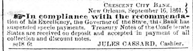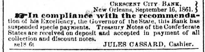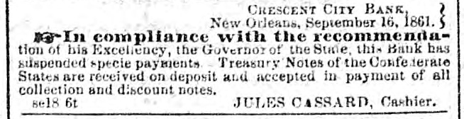 ? CRESCENT CITY BANK, } New Orleans, September 16, 1861. In compliance with the recommendation of his Excellency, the Governor of the State, this Bank has suspended specie payments Treasury Notes of the Confederate States are received on deposit and accepted in payment of all collection and discount notes. se18 6t JULES CASSARD, Cashier.