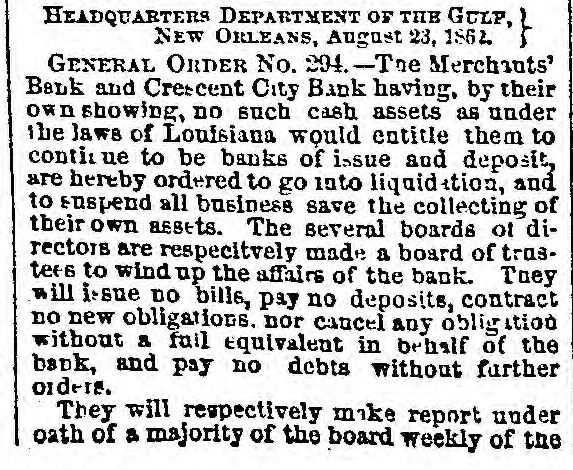 GENERAL ORDER No. 294. - The Merchants' Bank and Crescent City Bank having, by their own showing, no such cash assets ... are hereby ordered to go into liquidation, and to suspend all business save the collecting of their own assets. The several boards of directors are respectively made a board of trustees to wind up the affairs of the bank. (Headquarters Department of the Gulf, New Orleans, August 23, 1862).