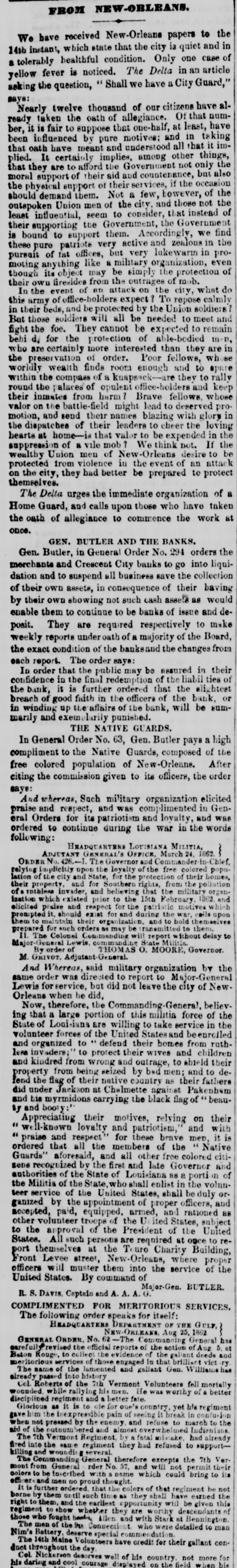 FROM NEW-ORLEANS. We have received New-Orleans papers to the 14th instant, which state that the city is quiet and in a tolerably healthful condition. Only one case of yellow fever is noticed. The Delta in an article asking the question, "Shall we have a City Guard," says: Nearly twelve thousand of our citizens have already taken the oath of allegiance. Of that number, it is fair to suppose that one-half, at least, have been influenced by pure motives; and in taking that oath have meant and understood all that it implied. It certainly implies, among other things, that they are to afford the Government not only the moral support of their aid and countenance, but also the physical support of their services, if the occasion should demand them. Not a few, however, of the outspoken Union men of the city, and those not the least influential, seem to consider, that instead of their supporting the Government, the Government is bound to support them. Accordingly, we find these pure patriots very active and zealous in the pursuit of fat offices, but very lukewarm in promoting anything like a military organization, even though its object may be simply the protection of their own firesides from the outrages of mob. In the event of an attack on the city, what do this army of office-holders expect? To repose calmly in their beds, and be protected by the Union soldiers? But those soldiers will all be needed to meet and fight the foe. They cannot be expected to remain behind for the protection of able-bodied men, who are certainly more interested than they are in the preservation of order. Poor fellows, whose worldly wealth finds room enough and to spare within the compass of a knapsack-are they to rally round the palaces of opulent office-holders and keep their inmates from harm? Brave fellows, whose valor on the battle-field might lead to deserved promotion, and send their names blazing with glory in the dispatches of their leaders to cheer the loving hearts at home-is that valor to be expended in the suppression of a vile mob? We think not. If the wealthy Union men of New Orleans desire to be protected from violence in the event of an attack on the city, they had better be prepared to protect themselves. The Delta urges the immediate organization of a Home Guard, and calls upon those who have taken the oath of allegiance to commence the work at once. GEN. BUTLER AND THE BANKS. Gen. Butler, in General Order No. 294 orders the merchants and Crescent City banks to go into liquidation and to suspend all business save the collection of their own assets, in consequence of their having by their own showing not such cash assets as would enable them to continue to be banks of issue and deposit. They are required respectively to make weekly reports under oath of a majority of the Board, the exact condition of the banks and the changes from each report. The order says: In order that the public may be assured in their confidence in the final redemption of the liabilities of the bank, it is further ordered that the slightest breach of good faith in the officers of the bank, or in winding up the affairs of the bank, will be summarily and exemplarily punished. THE NATIVE GUARDS. In General Order No. 63, Gen. Butler pays a high compliment to the Native Guards, composed of the free colored population of New-Orleans. After citing the commission given to its officers, the order says: And whereas, Such military organization elicited praise and respect, and was complimented in General Orders for its patriotism and loyalty, and was ordered to continue during the war in the words following: HEADQUARTERS LOUISIANA MILITIA, ADJUTANT GENERAL'S OFFICE, March 24, 1862. ORDER NO. 426.-1. The Governor and Commander-in-Chief, relying implicitly upon the loyalty of the free colored population of the city and State, for the protection of their homes, their property, and for Southern rights, from the pollution of a ruthless invader, and believing that the military organization which existed prior to the 15th February, 1862, and elicited praise and respect for the patriotic motives which prompted it, should exist for and during the war, calls upon them to maintain their organization, and to hold themselves prepared for such orders as may be transmitted to them. II. The Colonel Commanding will report without delay to Major-General Lewis, commanding State Militia. By order of THOMAS O. MOORE, Governor. M. GRIVOT. Adjutant-General. And Whereas, said military organization by the same order was directed to report to Major-General Lewis for service, but did not leave the city of New-Orleans when he did, Now, therefore, the Commanding-General, believing that a large portion of this militia force of the State of Louisiana are willing to take service in the volunteer forces of the United States and beenrolled and organized to "defend their homes from ruthless invaders;" to protect their wives and children and kindred from wrong and outrage, to shield their property from being seized by bad men; and to defend the flag of their native country as their fathers did under Jackson at Chalmette against Pakenham and his myrmidons carrying the black flag of "beauty and booty:" Appreciating their motives, relying on their "well-known loyalty and patriotism," and with "praise and respect" for these brave men, it is ordered that all the members of the "Native Guards" aforesaid, and all other free colored citizens recognized by the first and late Governor and authorities of the State of Louisiana as a portion of the Militia of the State, who shall enlist in the volunteer service of the United States, shall be duly organized by the appointment of proper officers, and accepted, paid, equipped, armed, and rationed as other volunteer troops of the United States, subject to the approval of the President of the United States. All such persons are required at once to report themselves at the Touro Charity Building, Front Levee street, New-Orleans, where proper off