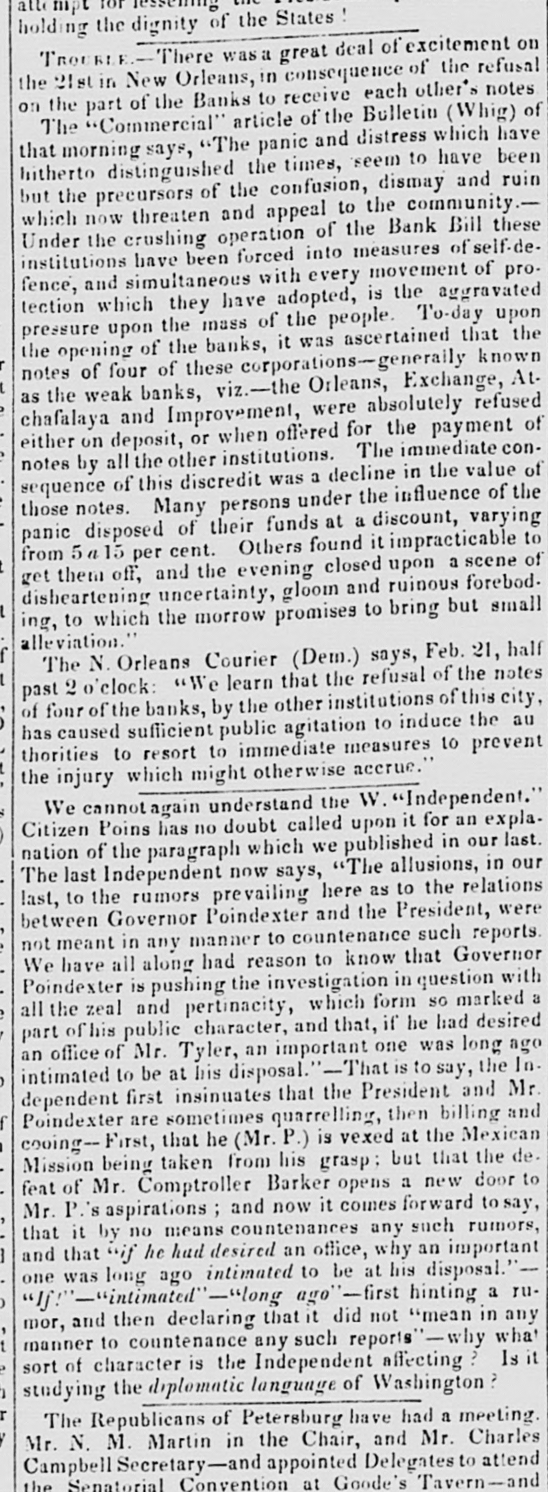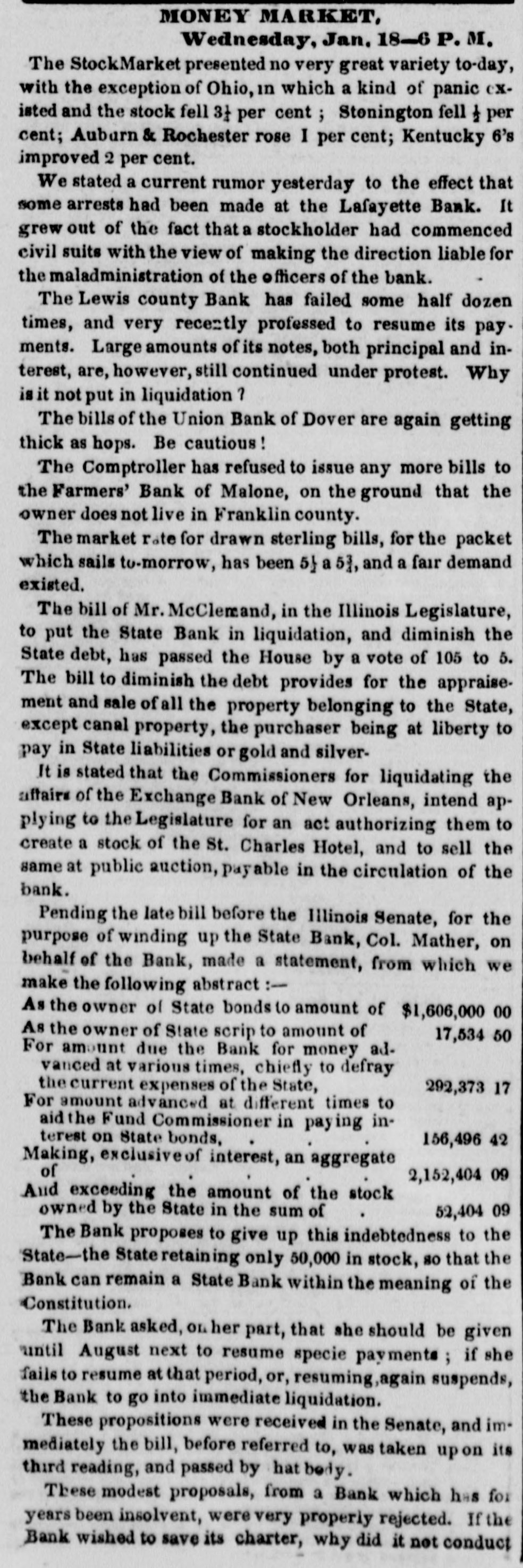 EXECUTIVE DEPARTMENT. New Orleans, 18th December 1841. Sta-1 have the honor to acknowledge the receipt of the letter which has been addressed to me yesterday, in the name of the Board of Directors over which you preside, to express their regret that, in my late annual mesange to the general assembly, "the Carrollton Bank has been classed an one of the institutotal which has encreased its liabilities during the last two years." No one could have experienced more uncasinces than I would, if through any error contained in the communication to which you allude, the Carrollton Bank, or any other, had been made undeservedly to suffer. I therefore feel happy in being able to stato and to prove that this has not been the case. In the discharge of what I considered a dutv. I have informed the legielature that the Board of Presidents have postponed the resumption of specie payments until November 1842, in order to enable the weak banks to change their position. It is not through any act of mine that your institution has been classed as a weak bank. It has been done by a resolution adopted by the Board of Presidenta in the following words: "Resolved, that the aid which may be necessary to enable the improvement, the Exchange, the Atchafalaya, the Orleans and the Carrollton Banks to resame payment in specie with the other banks, be furnished to said banks immediately, &c." Wishing to prove, by what had already taken place, that those weak banks could not expect to be benefited by a continuation of the suspension, I have given the position of each of them in October last, and in November, 1839, immediately after the second suspension; and I have shown that during the last two years, their collective cash liabilities have increased more than $780,000, and their collective cash assets have decreased $300,000. The statements on which my calculations were based, have been extracted from a document submitted officially by the Citizens' Bank to the Board of Presidents of the banks of this city, which has since been laid by that institution before the general assembly.These were the only data on which I could safely act, because the information on the situation of our monetary institutions which had requested officially from the Secretary of the Board of Presidents, could not be communicated to me, notwithstanding the willingness of that gentleman to do so, before the inceting of the legislature. In neither of the statements quoted in my message, can you find a cause of complaint, for in both of there your liabilities are smaller than those now given by yourself. Your classification with the institutions that have augmented their liabilities could not be avoided, for having undertaken to show the effect of srspension on all the banks which the Board of Presidents intended to relieve. I could not help classing you with them, without making a distinction which might appear invidious between the banks which they had thought proper to connect. I learn with much pleasure that the Carrollton Bank is preparing to resume specie payments, "at as early a period as a majority of the banks of this city may do so." I hope that the time is not far distant when the country shall be relieved from the calamities which necessarily follow the circulation of an irredeemable paper currency. Respectfully, Your obedient servant. A. B. ROMAN. (Signed) G.C. DUNCAN, President of the Carrollton Bank.