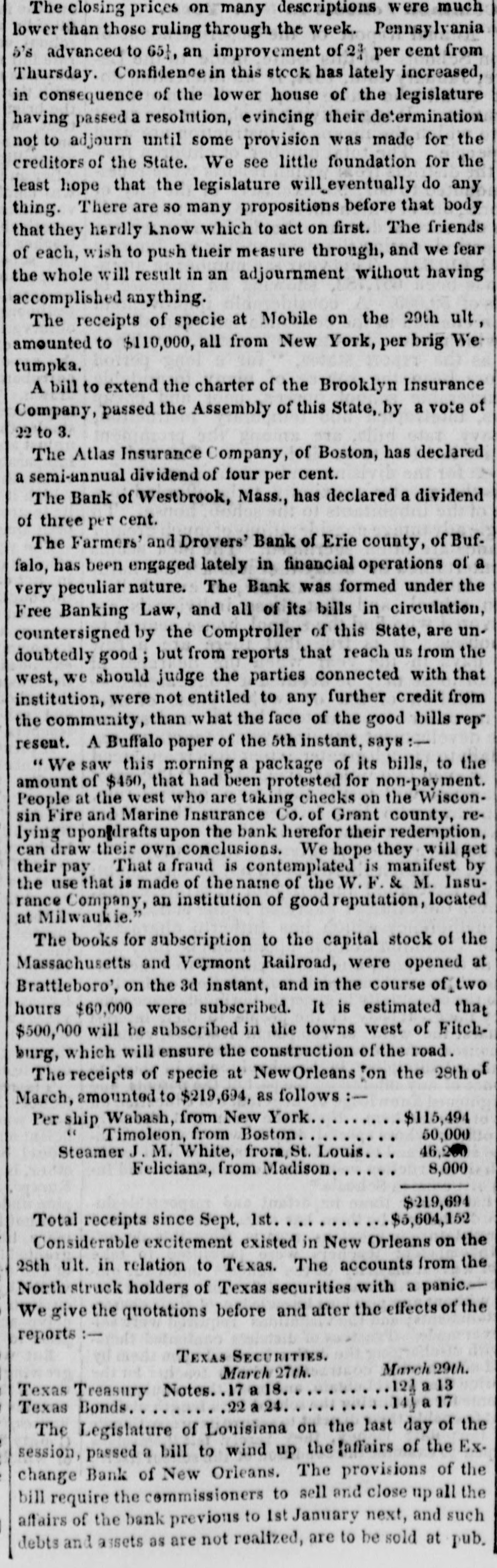 The closing prices on many descriptions were much lower than those ruling through the week. Pennsylvan 5's advanced to 651, an improvement of 21 per cent from Thursday. Confidence in this stock has lately increased, in consequence of the lower house of the legislature having passed a resolution, evincing their determination not to adjourn until some provision was made for the creditors of the State. We see little foundation for the least hope that the legislature will eventually do any thing. There are so many propositions before that body that they hardly know which to act on first. The friends of each, wish to push their measure through, and we fear the whole will result in an adjournment without having accomplished anything. The receipts of specie at Mobile on the 29th ult, amounted to $110,000, all from New York, per brig We tumpka. A bill to extend the charter of the Brooklyn Insurance Company, passed the Assembly of this State, by a vote of 22 to 3. The Atlas Insurance Company, of Boston, has declared a semi-annual dividend of four per cent. The Bank of Westbrook, Mass., has declared a dividend of three per cent. The Farmers' and Drovers' Bank of Erie county, of Buffalo, has been engaged lately in financial operations of a very peculiar nature. The Bank was formed under the Free Banking Law, and all of its bills in circulation, countersigned by the Comptroller of this State, are undoubtedly good; but from reports that reach us from the west, we should judge the parties connected with that institution, were not entitled to any further credit from the community, than what the face of the good bills rep resent. A Buffalo paper of the 5th instant, says:We saw this morning a package of its bills, to the amount of $450, that had been protested for non-payment. People at the west who are taking checks on the Wisconsin Fire and Marine Insurance Co. of Grant county, relying upondrafts upon the bank herefor their redemption, can draw their own conclusions. We hope they will get their pay That a fraud is contemplated is manifest by the use that is made of the name of the W. F. & M. Insurance Company, an institution of good reputation, located at Milwaukie." The books for subscription to the capital stock of the Massachusetts and Vermont Railroad, were opened at Brattleboro', on the 3d instant, and in the course of two hours $60,000 were subscribed. It is estimated that $500,000 will be subscribed in the towns west of Fitchwhich will ensure of at NewOrleans on burg, The receipts specie the construction of the the road. 28th March, amounted to $219,694, as follows :$115,494 Per ship Wabash, from New York 50,000 Timoleon, from Boston 46.200 Steamer J. M. White, from St. Louis 8,000 Felician2, from Madison $219,694 $5,604,152 Total receipts since Sept, 1st Considerable excitement existed in New Orleans on the 25th ult. in relation to Texas. The accounts from the North struck holders of Texas securities with a panic.We give the quotations before and after the effects of the reports :TEXAS SECURITIES. March 29th. March 27th. 121 a 13 Texas Treasury Notes. 17 a 18 14) a 17 22 a 24 Texas Bonds The Legislature of Louisiana on the last day of the session, passed a bill to wind up the affairs of the Exchange Bank of New Orleans. The provisions of the bill require the commissioners to sell and close up all the affairs of the bank previous to 1st January next, and such debts and assets as are not realized, are to be sold at pub.