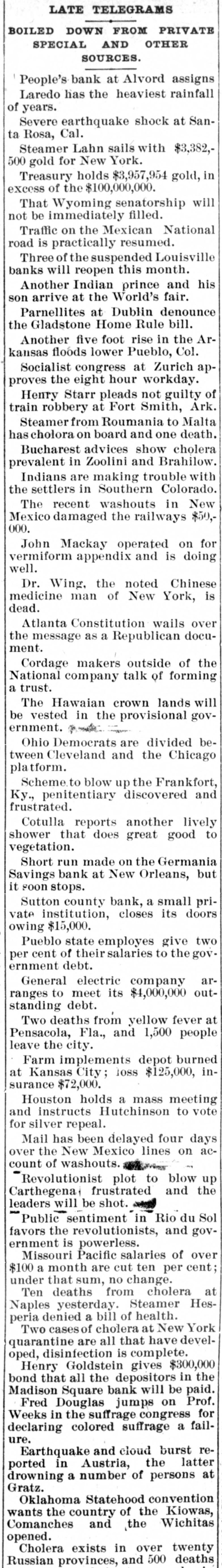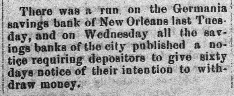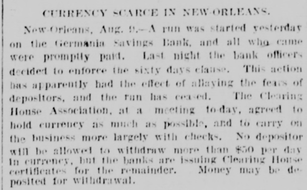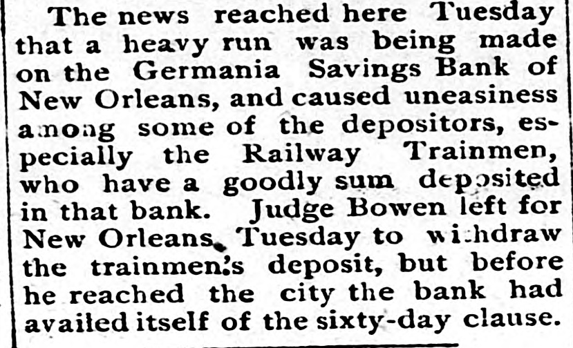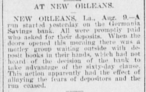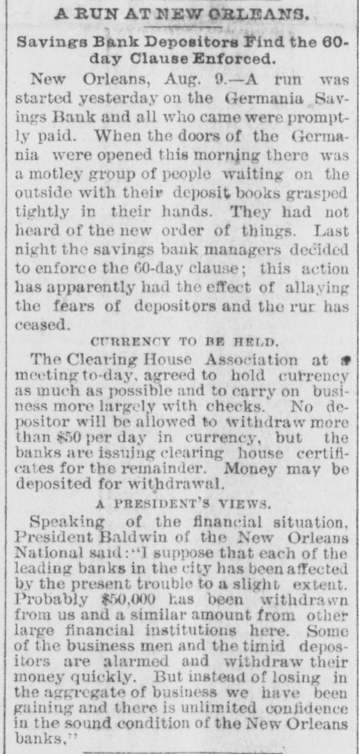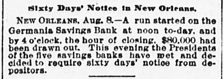 nim Summit TO selling the ore and makes monthly settlements with the holders of the stock. There are many furnaces which use this ore, and these are also divided among the heirs, Robert H. Coleman has the three Colebrook furnaces. two anthracite furnaces and the Coleman furnaces. Robert H. Coleman is also a joint owner of the North Lebanon furnaces and an important member of the firm of Coleman & Brock, manufacturers of pig iron. Other Business Troubles. MINNEAPOLIS, MINN.. August 9.The Commercial Bank of this city closed its doors this morning. NASHVILLE, TENN., August 9.-The First National Bank of this city suspended after banking hours this afternoon. A statement has not yet been given out. After the suspension of the First National Bank this afternoon the directors of the Fourth National had a meeting, those present représenting several millions of property, and signed a guaranty pledging themselves and their individual estates to the payment of all deposits. They further state that the bank is able to meet all of its obligations. The directors of the City Savings Bank held a meeting to night and unanimously decided to suspend payment for sixty days. The suspension is caused by the stringency of the money market. The bank is considered solvent. and will pay depositors and stockholders in full. Deposits, $40,707.90; assets, $151,499.92; ninety per cent. of which is good. The directors of the bank have personally pledged themselves and their estates to the payment of all deposits in full. Edgar Jones, president of the Union Bank and Trust Company, says in an interview with a reporter that his bank will open as usual to-morrow. John M. Sperry, president of the Merchants' National. in an interview says his bank will also open to-morrow as usual. PITTSBURG. PA., August 9.-The Linden Steel Company. one of the largest manufacturing concerns in Pittsburg has suspended operations on account of the stringency of the times and the difficulty in procpring discounts and inability to make collections. All employees, about eighty, have been discharged. ROCHESTER, MINN., August 9.-The Union National Bank closed temporarily this morning. There is no statement. The bank is solvent, and will resume without the appointment of a receiver. The other banks are all considered solid COLFAX. WASH., August 9.-The Bank of Colfax has closed. Capital $100,000; assets exceed liabilities two to one. MINNEAPOLIS, MINN., August 9.The Commercial Bank closed its doors this morning. The bank is a small local institution, doing business in this city. Capital, $200,000: deposits, $400,000. and its time deposits $222,000. The loans and discounts at the last statement amounted to $642,000. It is stated by the officers that depositors will be paid in full. NEW YORK, August 9.-Fuller Brothers, commission merchants at 139 Greenwich street, assigned to-day. They are said to be the largest wholesale dealers in nalls in this city, and the oldest concern in that line here. They have always been regarded as conservative and reliable. Members of the firm said that the assignment was the result of the terribly hard times. As commission merchants they had dealings with many nail mills, had made advances to them, and now were unable to collect from them. The firm had been absolutely unable to raise money to meet their obligations coming 01 su ou DATE pinoo show "anp their condition, but the totals will be large. A Run Avoided. NEW YORK, August 9.-A crowd of small depositors gathered before the doors of the closed Madison Squars Bank this morning and anxiously inquired as to the safety of their money. Large depositors, It was stated, had full confidence in the bank and were not on hand. About 11 o'clock Harry Goldstein, a son of Isaac Goldstein, a millionaire dealer of Sixty-second and Hudson streets, stated to depositors that his father had authorized him to say he would bond himself in $300,000 to pay all depositors. He did this because he was a friend of President Blant and was confident the affairs of the bank were all right. Ten minutes later the janitor appeared and stated that one of the directors was on hand with $40,000, prepared to settle with the depositors on the spot at ninety cents on the dollar. If they were willing however. to wait, every cent would be paid. No one took up the offer and the crowd dwindled away. Depositors Become Quiet. NEW ORLEANS, LA., August 9.-A run was started yesterday on the Germania Savings Bank, and all who came were promptly paid. When the doors of the Germania were opened this morning there was a motly group of people waiting on the outside with their deposit books grasped tightly in their hands. They had not heard of the new order of things. Last night the Savings Bank managers decided to enforce the sixty-day clause. This action has apparently had the effect of allaying the fears of depositors and the run has ceased.