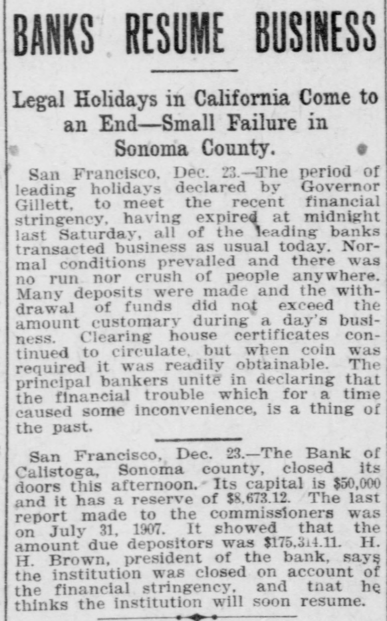 BANKS RESUME BUSINESS Legal Holidays in California Come to an End-Small Failure in Sonoma County. San Francisco, Dec. 23.-The period of leading holidays declared by Governor Gillett, to meet the recent financial stringency, having expired at midnight last Saturday, all of the leading banks transacted business as usual today. Normal conditions prevailed and there was no run nor crush of people anywhere. Many deposits were made and the withdrawal of funds did not exceed the amount customary during a day's business. Clearing house certificates continued to circulate, but when coin was required it was readily obtainable. The principal bankers unite in declaring that the financial trouble which for a time caused some inconvenience, is a thing of the past. San Francisco, Dec. 23.-The Bank of Calistoga, Sonoma county, closed its doors this afternoon. Its capital is $50,000 and it has a reserve of $8,673.12. The last report made to the commissioners was on July 31, 1907. It showed that the amount due depositors was $175,314.11. H. H. Brown, president of the bank, says the institution was closed on account of the financial stringency, and that he thinks the institution will soon resume.