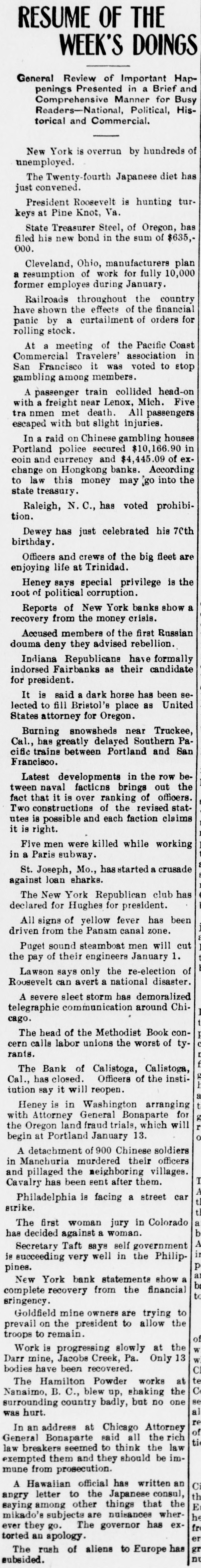 RESUME OF THE WEEK'S DOINGS General Review of Important Happenings Presented in a Brief and Comprehensive Manner for Busy Readers-National, Political, Historical and Commercial. New York is overrun by hundreds of unemployed. The Twenty-fourth Japanese diet has just convened. President Roosevelt is hunting turkeys at Pine Knot, Va. State Treasurer Steel, of Oregon, has filed his new bond in the sum of $635,000. Cleveland, Ohio, manufacturers plan a resumption of work for fully 10,000 former employes during January. Railroads throughout the country have shown the effects of the financial panic by a curtailment of orders for rolling stock. At a meeting of the Pacific Coast Commercial Travelers' association in San Francisco it was voted to stop gambling among members. A passenger train collided head-on with a freight near Lenox, Mich. Five tra nmen met death. All passengers escaped with but slight injuries. In a raid on Chinese gambling houses Portland police secured $10,166.90 in coin and currency and $4,445.09 of exchange on Hongkong banks. According to law this money may go into the state treasury. Raleigh, N. C., has voted prohibition. Dewey has just celebrated his 7Cth birthday. Officers and crews of the big fleet are enjoying life at Trinidad. Heney says special privilege is the root of political corruption. Reports of New York banks show a recovery from the money crisis. Accused members of the first Russian douma deny they advised rebellion. Indiana Republicans have formally indorsed Fairbanks as their candidate for president. It is said a dark horse has been selected to fill Bristol's place as United States attorney for Oregon. Burning snowsheds near Truckee, Cal., has greatly delayed Southern Pacific trains between Portland and San Francisco. Latest developments in the row between naval factions brings out the fact that it is over ranking of officers. Two constructions of the revised statutes is possible and each faction claims it is right. Five men were killed while working in a Paris subway. St. Joseph, Mo., started a crusade against loan sharks. The New York Republican club has declared for Hughes for president. All signs of yellow fever has been driven from the Panam canal zone. Puget sound steamboat men will cut the pay of their engineers January 1. Lawson says only the re-election of Roosevelt can avert a national disaster. A severe sleet storm has demoralized telegraphic communication around Chicago. The head of the Methodist Book concern calls labor unions the worst of tyrants. The Bank of Calistoga, Calistoga, Cal., has closed. Officers of the institution say it will reopen. Heney is in Washington arranging with Attorney General Bonaparte for the Oregon land fraud trials, which will begin at Portland January 13. A detachment of 900 Chinese soldiers in Manchuria murdered their officers and pillaged the meighboring villages. Cavalry has been sent after them. Philadelphia is facing a street car strike. t a The first woman jury in Colorado has decided against a woman. Secretary Taft says self government je succeeding very well in the Philipp pines. New York bank statements show a complete recovery from the financial to sringency. Goldfield mine owners are trying to prevail on the president to allow the troops to remain. of W Work is progressing slowly at the Darr mine, Jacobs Creek, Pa. Only 13 bodies have been recovered. C te The Hamilton Powder works at C Nanaimo, B. C., blew up, shaking the se surrounding country badly, but no one al was hurt. re In an address at Chicago Attorney of General Bonaparte said all the rich ti law breakers seemed to think the law exempted them and they should be immune from prosecution. A Hawaiian official has written an C angry letter to the Japanese consul, th saying among other things that the E