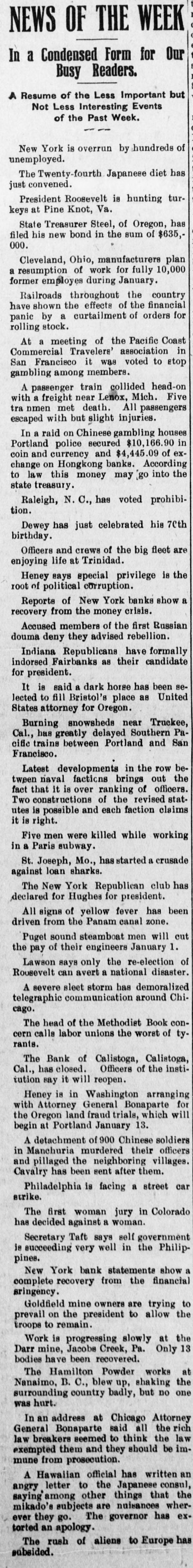 NEWS OF THE WEEK In a Condensed Form for Our Busy Readers. A Resume of the Less Important but Not Less Interesting Events of the Past Week. New York is overrun by hundreds of unemployed. The Twenty-fourth Japanese diet has just convened. President Roosevelt is hunting turkeys at Pine Knot, Va. State Treasurer Steel, of Oregon, has filed his new bond in the sum of $635,000. Cleveland, Ohio, manufacturers plan a resumption of work for fully 10,000 former employes during January. Railroads throughout the country have shown the effects of the financial panic by a curtailment of orders for rolling stock. At a meeting of the Pacific Coast Commercial Travelers' association in San Francisco it was voted to stop gambling among members. A passenger train collided head-on with a freight near Lenox, Mich. Five tra nmen met death. All passengers escaped with but slight injuries. In a raid on Chinese gambling houses Portland police secured $10,166.90 in coin and currency and $4,445.09 of exchange on Hongkong banks. According to law this money may go into the state treasury. Raleigh, N. C., has voted prohibition. Dewey has just celebrated his 7Cth birthday. Officers and crews of the big fleet are enjoying life at Trinidad. Heney says special privilege is the root of political corruption. Reports of New York banks show a recovery from the money crisis. Accused members of the first Russian douma deny they advised rebellion. Indiana Republicans have formally indorsed Fairbanks as their candidate for president. It is said a dark horse has been selected to fill Bristol's place as United States attorney for Oregon. Burning snowsheds near Truckee, Cal., has greatly delayed Southern Pacific trains between Portland and San Francisco. Latest developments in the row between naval factions brings out the fact that it is over ranking of officers. Two constructions of the revised statutes is possible and each faction claims it is right. Five men were killed while working in a Paris subway. St. Joseph, Mo., has started a crusade against loan sharks. The New York Republican club has declared for Hughes for president. All signs of yellow fever has been driven from the Panam canal zone. Puget sound steamboat men will cut the pay of their engineers January 1. Lawson says only the re-election of Roosevelt can avert a national disaster. A severe sleet storm has demoralized telegraphic communication around Chicago. The head of the Methodist Book concern calls labor unions the worst of tyrants. The Bank of Calistoga, Calistoga, Cal., has closed. Officers of the institution say it will reopen. Heney is in Washington arranging with Attorney General Bonaparte for the Oregon land fraud trials, which will begin at Portland January 13. A detachment of 900 Chinese soldiers in Manchuria murdered their officers and pillaged the neighboring villages. Cavalry has been sent after them. Philadelphia is facing a street car strike. The first woman jury in Colorado has decided against a woman. Secretary Taft says self government je succeeding very well in the Philippines. New York bank statements show a complete recovery from the financial sringency. Goldfield mine owners are trying to prevail on the president to allow the troops to remain. Work is progressing slowly at the Darr mine, Jacobs Creek, Pa. Only 13 bodies have been recovered. The Hamilton Powder works at Nanaimo, B. C., blew up, shaking the surrounding country badly, but no one was hurt. In an address at Chicago Attorney General Bonaparte said all the rich law breakers seemed to think the law exempted them and they should be immune from prosecution. A Hawaiian official has written an angry letter to the Japanese consul, saying among other things that the mikado's subjects are nuisances wherever they go. The governor has extorted an apology. The rush of aliens to Europe has subsided.