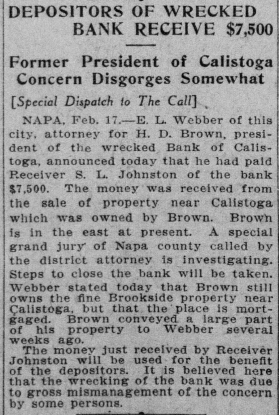 DEPOSITORS OF WRECKED BANK RECEIVE $7,500 Former President of Calistoga Concern Disgorges Somewhat [Special Dispatch to The Call] NAPA, Feb. 17.-E. L. Webber of this city, attorney for H. D. Brown, president of the wrecked Bank of Calistoga, announced today that he had paid Receiver S. L. Johnston of the bank $7,500. The money was received from the sale of property near Calistoga which was owned by Brown. Brown is in the east at present. A special grand jury of Napa county called by the district attorney is investigating. Steps to close the bank will be taken. Webber stated today that Brown still owns the fine Brookside property near Calistoga, but that the place is mortgaged. Brown conveyed a large part of his property to Webber several weeks ago. The money just received by Receiver Johnston will be used for the benefit of the depositors. It is believed here that the wrecking of the bank was due to gross mismanagement of the concern by some persons.