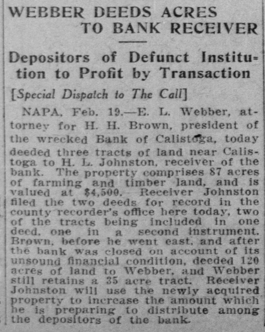 WEBBER DEEDS ACRES TO BANK RECEIVER Depositors of Defunct Institution to Profit by Transaction [Special Dispatch to The Call] NAPA, Feb. 19.-E. L. Webber, attorney for H. H. Brown, president of the wrecked Bank of Calistoga, today deeded three tracts of land near Calistoga to H. L. Johnston, receiver of the bank. The property comprises 87 acres of farming and timber land, and is valued at $4,500. Receiver Johnston filed the two deeds for record in the county recorder's office here today, two of the tracts being included in one deed. one in a second instrument. Brown, before he went east, and after the bank was closed on account of its unsound financial condition, deeded 120 acreg of land to Webber, and Webber still retains a 35 acre tract. Receiver Johnston will use the newly acquired property to increase the amount which he is preparing to distribute among the depositors of the bank.
