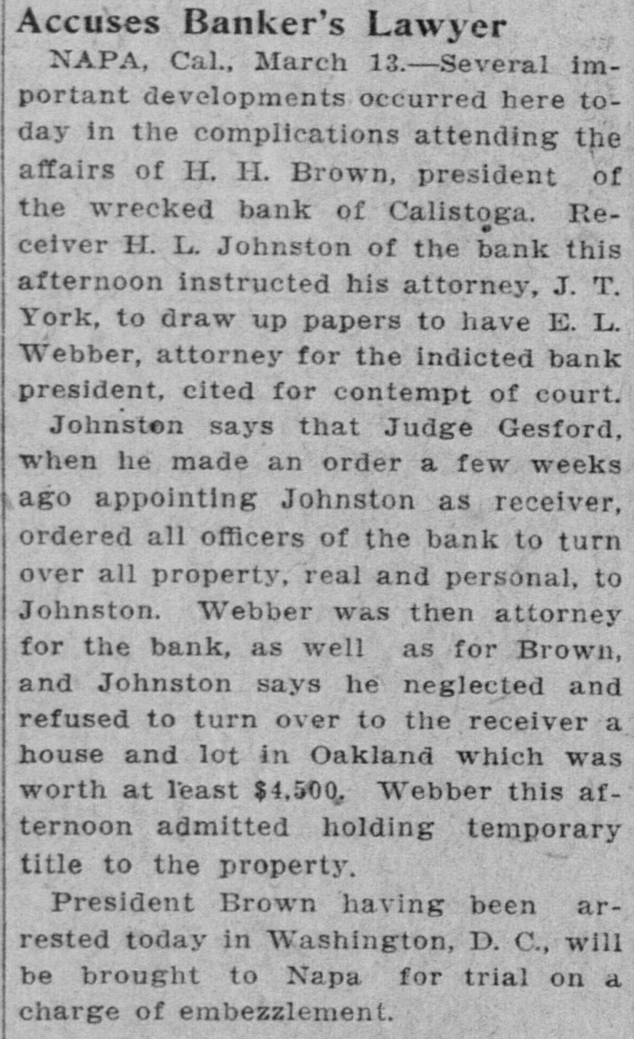 Accuses Banker's Lawyer NAPA, Cal., March 13.-Several important developments occurred here today in the complications attending the affairs of H. H. Brown, president of the wrecked bank of Calistoga. Receiver H. L. Johnston of the bank this afternoon instructed his attorney, J. T. York, to draw up papers to have E. L. Webber, attorney for the indicted bank president, cited for contempt of court. Johnston says that Judge Gesford, when he made an order a few weeks ago appointing Johnston as receiver, ordered all officers of the bank to turn over all property, real and personal, to Johnston. Webber was then attorney for the bank, as well as for Brown, and Johnston says he neglected and refused to turn over to the receiver a house and lot in Oakland which was worth at least $4,500. Webber this afternoon admitted holding temporary title to the property. President Brown having been arrested today in Washington, D. C., will be brought to Napa for trial on a charge of embezzlement.