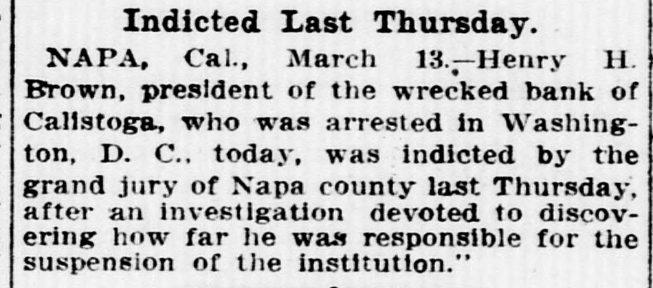 Indicted Last Thursday. NAPA, Cal., March 13. -Henry H. Brown, president of the wrecked bank of Calistoga, who was arrested in Washington, D. C., today, was indicted by the grand jury of Napa county last Thursday, after an investigation devoted to discovering how far he was responsible for the suspension of the institution."
