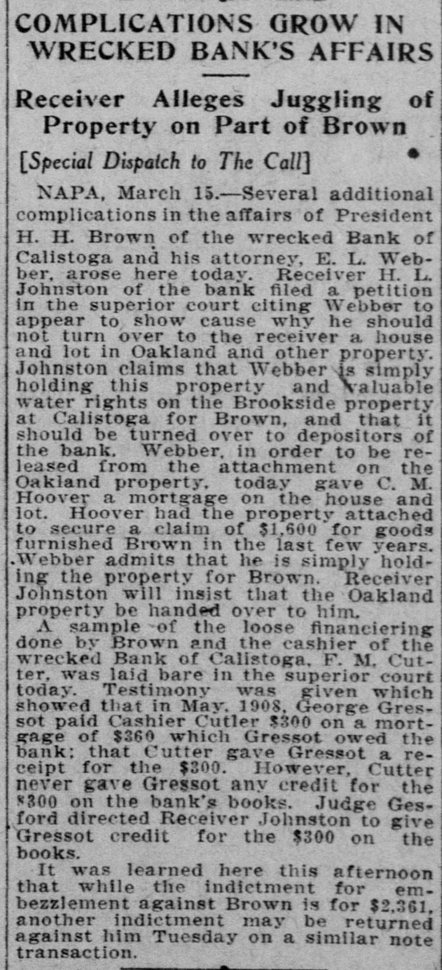 COMPLICATIONS GROW IN WRECKED BANK'S AFFAIRS Receiver Alleges Juggling of Property on Part of Brown [Special Dispatch to The Call] NAPA, March 15.-Several additional complications in the affairs of President H. H. Brown of the wrecked Bank of Calistoga and his attorney, E. L. Webber, arose here today. Receiver H. L. Johnston of the bank filed a petition in the superior court citing Webber to appear to show cause why he should not turn over to the receiver a house and lot in Oakland and other property. Johnston claims that Webber is simply holding this property and valuable water rights on the Brookside property at Calistoga for Brown, and that it should be turned over to depositors of the bank. Webber, in order to be released from the attachment on the Oakland property, today gave C. M. Hoover a mortgage on the house and lot. Hoover had the property attached to secure a claim of $1,600 for goods furnished Brown in the last few years. Webber admits that he is simply holding the property for Brown. Receiver Johnston will insist that the Oakland property be handed over to him. A sample of the loose financiering done by Brown and the cashier of the wrecked Bank of Calistoga, F. M. Cutter, was laid bare in the superior court today. Testimony was given which showed that in May. 1908, George Gressot paid Cashier Cutler $300 on a mortgage of $360 which Gressot owed the bank: that Cutter gave Gressot a receipt for the $300. However, Cutter never gave Gressot any credit for the 8300 on the bank's books. Judge Gesford directed Receiver Johnston to give Gressot credit for the $300 on the books. It was learned here this afternoon that while the indictment for embezzlement against Brown is for $2,361, another indictment may be returned against him Tuesday on a similar note transaction.