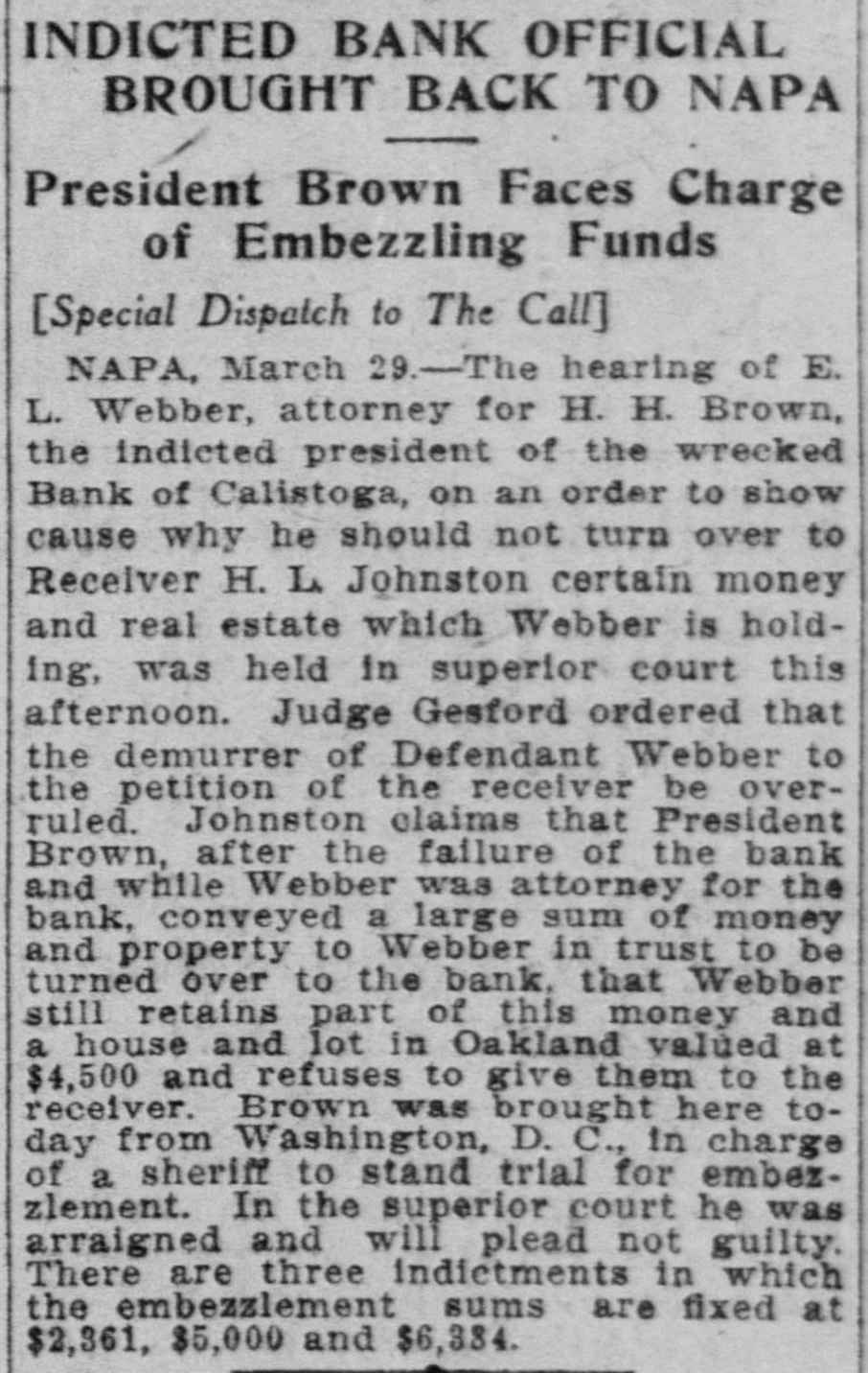 INDICTED BANK OFFICIAL BROUGHT BACK TO NAPA President Brown Faces Charge of Embezzling Funds [Special Dispatch to The Call] NAPA, March 29.-The hearing of E. L. Webber, attorney for H. H. Brown, the indicted president of the wrecked Bank of Calistoga, on an order to show cause why he should not turn over to Receiver H. L. Johnston certain money and real estate which Webber is holding, was held in superior court this afternoon. Judge Gesford ordered that the demurrer of Defendant Webber to the petition of the receiver be overruled. Johnston claims that President Brown, after the failure of the bank and while Webber was attorney for the bank, conveyed a large sum of money and property to Webber in trust to be turned over to the bank, that Webber still retains part of this money and a house and lot in Oakland valued at $4,500 and refuses to give them to the receiver. Brown was brought here today from Washington, D. C., in charge of a sheriff to stand trial for embezzlement. In the superior court he was arraigned and will plead not guilty. There are three indictments in which the embezzlement sums are fixed at $2,361, $5,000 and $6,384.