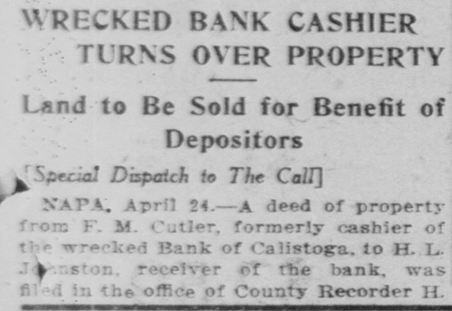 WRECKED BANK CASHIER TURNS OVER PROPERTY Land to Be Sold for Benefit of Depositors Special Dispatch to The Call] NAPA, April 24.-A deed of property from F. M. Cutler, formerly cashier of the wrecked Bank of Calistoga, to H.L. Johnston, receiver of the bank, was filed in the office of County Recorder H.