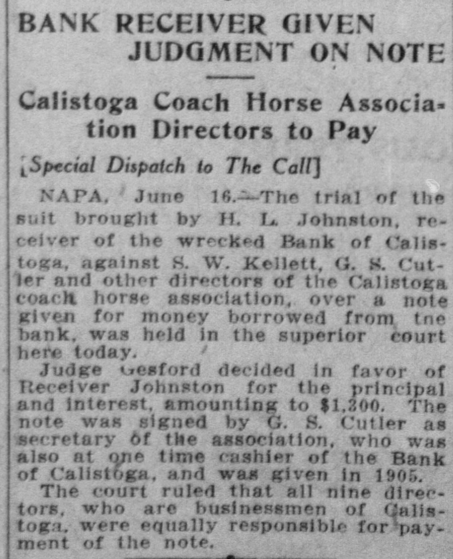 BANK RECEIVER GIVEN JUDGMENT ON NOTE Calistoga Coach Horse Association Directors to Pay [Special Dispatch to The Call] NAPA, June 16.The trial of the suit brought by H. L. Johnston, receiver of the wrecked Bank of Calistoga, against S. W. Kellett, G. S. Cutler and other directors of the Calistoga coach horse association, over a note given for money borrowed from the bank, was held in the superior court here today. Judge Gesford decided in favor of Receiver Johnston for the principal and interest, amounting to $1,300. The note was signed by G. S. Cutler as secretary of the association, who was also at one time cashier of the Bank of Calistoga, and was given in 1905. The court ruled that all nine directors, who are businessmen of Calistoga, were equally responsible for payment of the note.