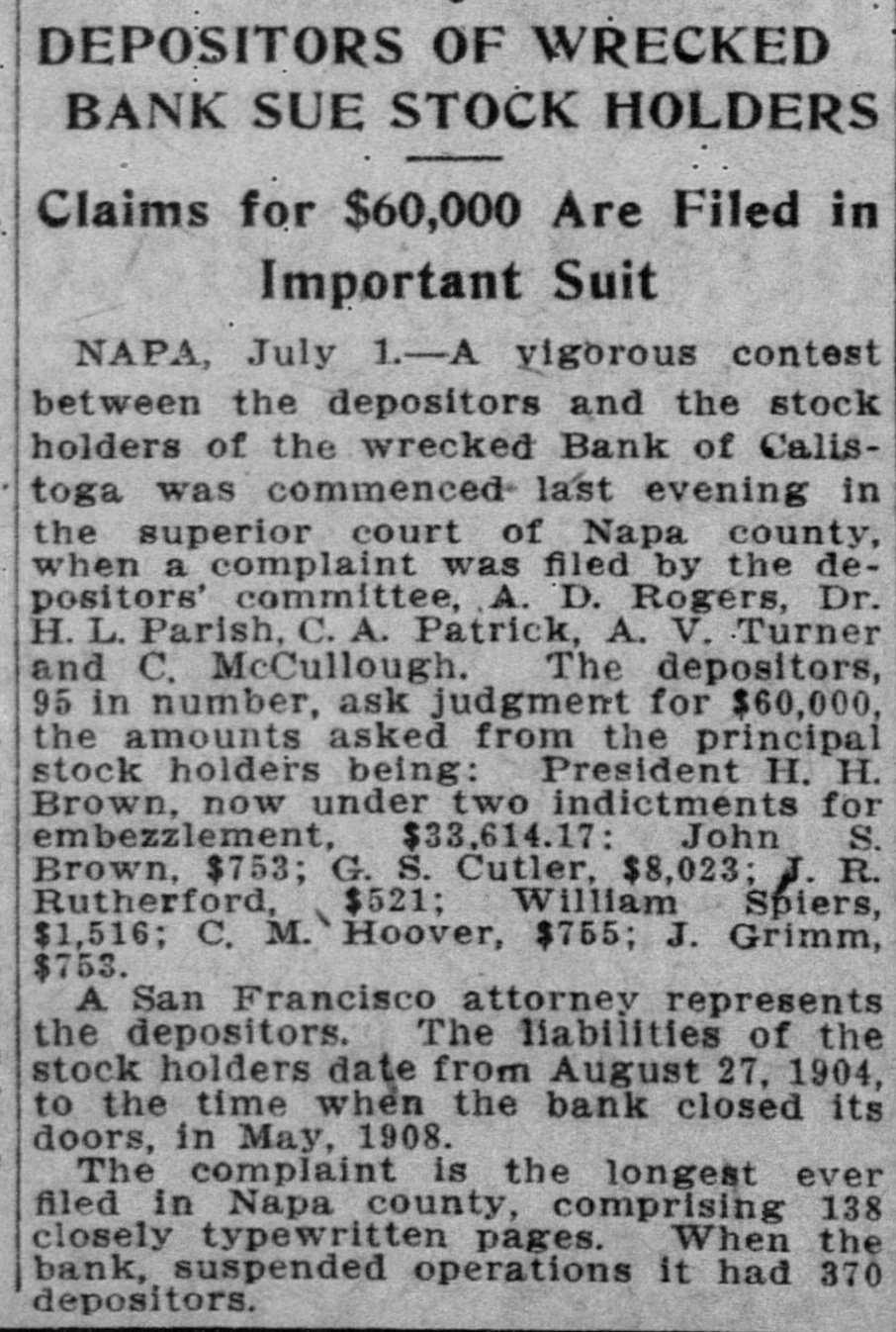 DEPOSITORS OF WRECKED BANK SUE STOCK HOLDERS Claims for $60,000 Are Filed in Important Suit NAPA, July 1.-A vigorous contest between the depositors and the stock holders of the wrecked Bank of Calistoga was commenced last evening in the superior court of Napa county, when a complaint was filed by the depositors' committee, A. D. Rogers, Dr. H. L. Parish, C. A. Patrick, A. V. Turner and C. McCullough. The depositors, 95 in number, ask judgment for $60,000, the amounts asked from the principal stock holders being: President H. H. Brown, now under two indictments for embezzlement, $33,614.17: John S. Brown, $753; G. S. Cutler, $8,023; J. R. Rutherford, $521; William Spiers, $1,516; C. M. Hoover, $755; J. Grimm, $753. A San Francisco attorney represents the depositors. The liabilities of the stock holders date from August 27, 1904, to the time when the bank closed its doors, in May, 1908. The complaint is the longest ever filed in Napa county, comprising 138 closely typewritten pages. When the bank, suspended operations it had 370 depositors.