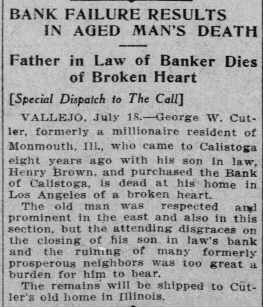 BANK FAILURE RESULTS IN AGED MAN'S DEATH Father in Law of Banker Dies of Broken Heart [Special Dispatch to The Call] VALLEJO, July 18.-George W. Cutler, formerly a millionaire resident of Monmouth, Ill., who came to Calistoga eight years ago with his son in law, Henry Brown, and purchased the Bank of Calistoga, is dead at his home in Los Angeles of a broken heart. The old man was respected and prominent in the east and also in this section, but the attending disgraces on the closing of his son in law's bank and the ruining of many formerly prosperous neighbors was too great a burden for him to bear. The remains will be shipped to Cutler's old home in Illinois.