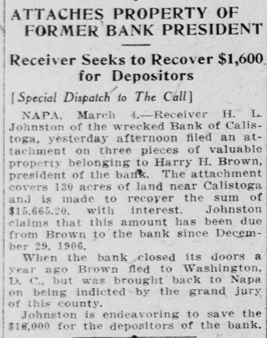 ATTACHES PROPERTY OF FORMER BANK PRESIDENT Receiver Seeks to Recover $1,600 for Depositors [ Special Dispatch to The Call] NAPA, March 4. -Receiver H. L. Johnston of the wrecked Bank of Calistoga, yesterday afternoon filed an attachment on three pieces of valuable property belonging to Harry H. Brown, president of the bank. The attachment covers 130 acres of land near Calistoga and is made to recover the sum of $15,665.20. with interest. Johnston claims that this amount has been due from Brown to the bank since December 29, 1906. When the bank closed its doors a year ago Brown fled to Washington, D. C., but was brought back to Napa on being indicted - by the grand jury of this county. Johnston is endeavoring to save the $16,000 for the depositors of the bank.