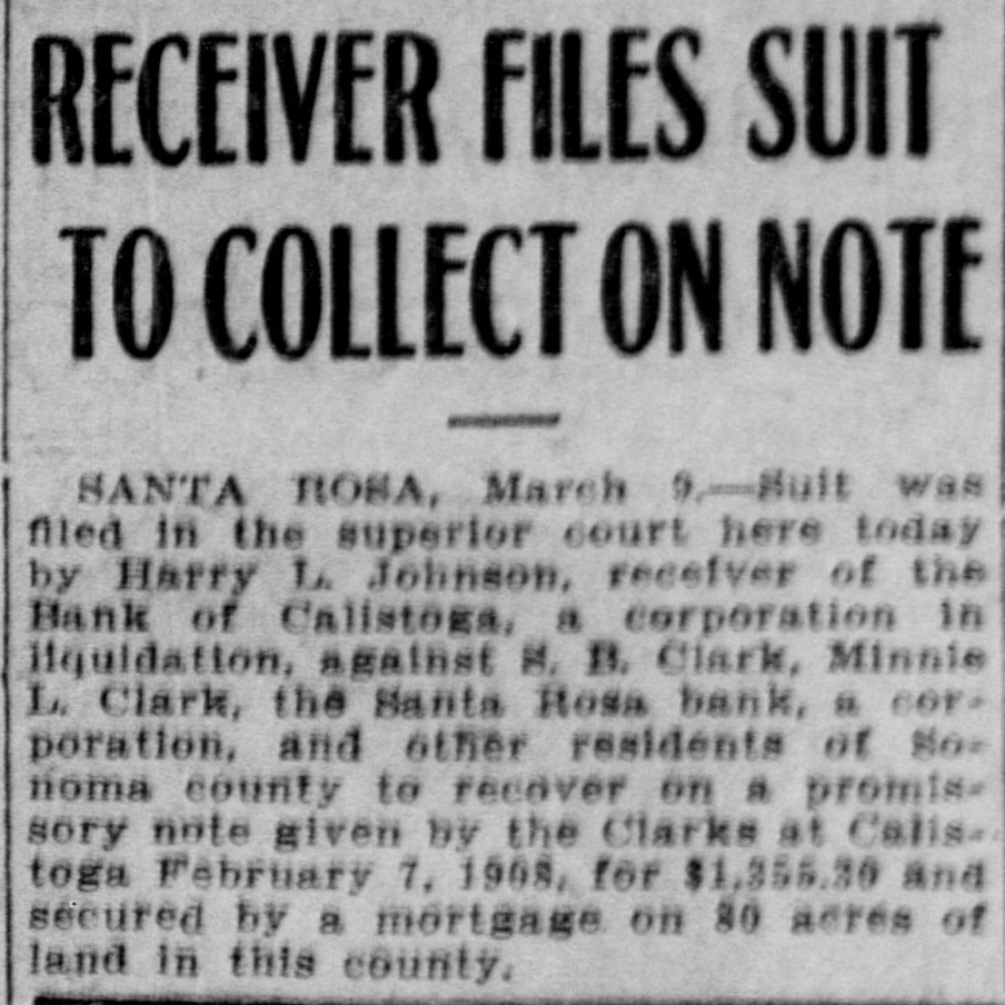 RECEIVER FILES SUIT TO COLLECT ON NOTE SANTA ROBA, March 9.-Buit was filed in the superior court here today by Harry L Johnson, receiver of the Bank of Calistoes, a corporation in liquidation, against M. n. Clark, Minnie L. Clark, the Hanta Rosa bank, # COTporation, and other residents of No. noma county to recover on # promis sory note given by the Clarks at Calistoga February 7. 1908, for $1,356.30 and secured by a mortgage on 80 acrés of land in this county,