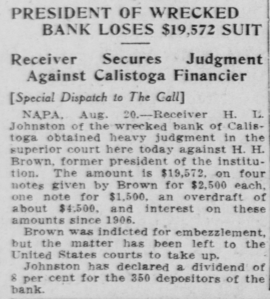PRESIDENT OF WRECKED BANK LOSES $19,572 SUIT Secures Receiver Judgment Against Calistoga Financier [Special Dispatch to The Call] NAPA, Aug. 20.-Receiver H. L. Johnston of the wrecked bank of Calistoga obtained heavy judgment in the superior court here today against H. H. Brown, former president of the institution. The amount is $19,572. on four notes given by Brown for $2,500 each, one note for $1,500, an overdraft of about $4,500, and interest on these amounts since 1906. Brown was indicted for embezzlement, but the matter has been left to the United States courts to take up. Johnston has declared a dividend of 8 per cent for the 350 depositors of the bank.