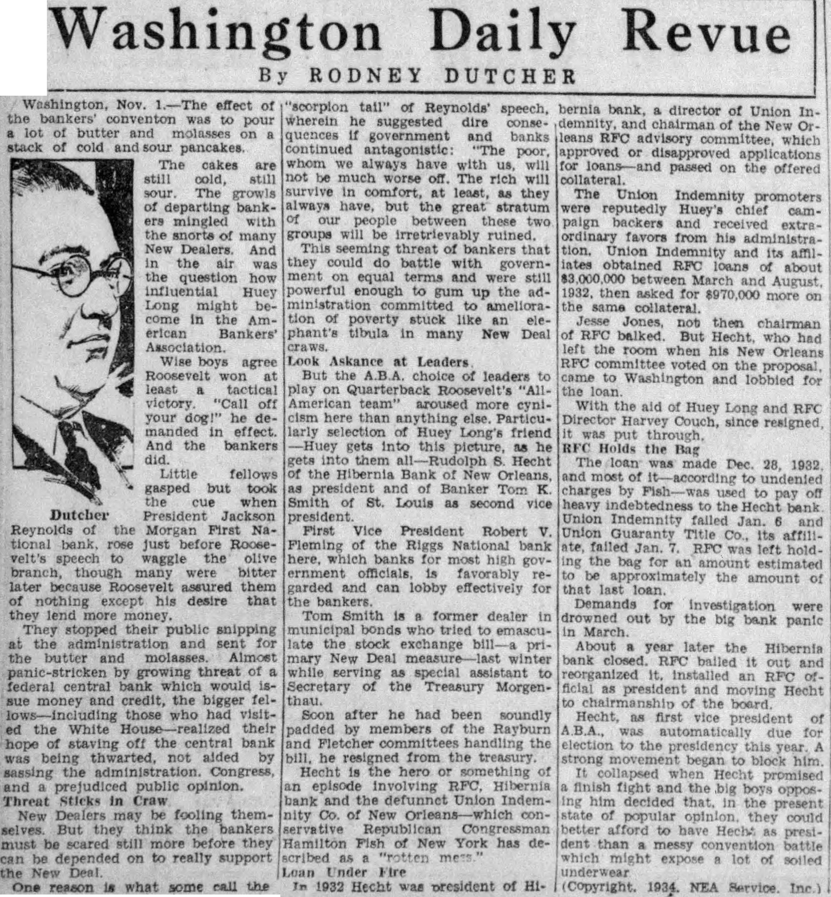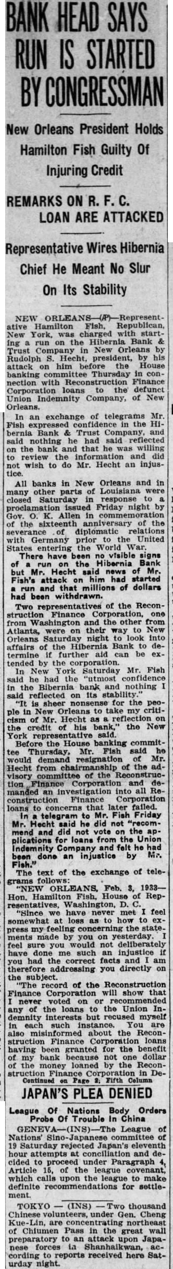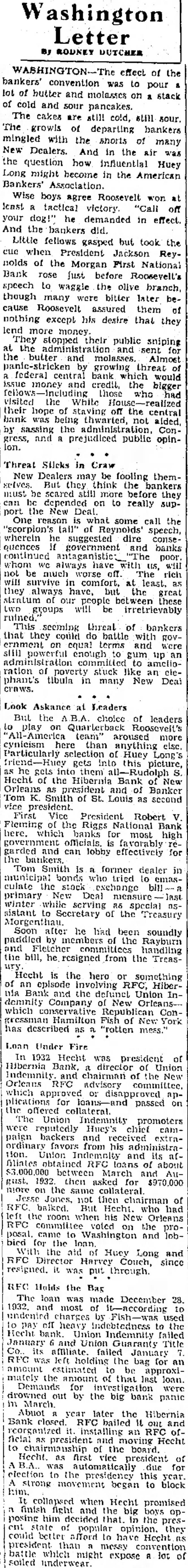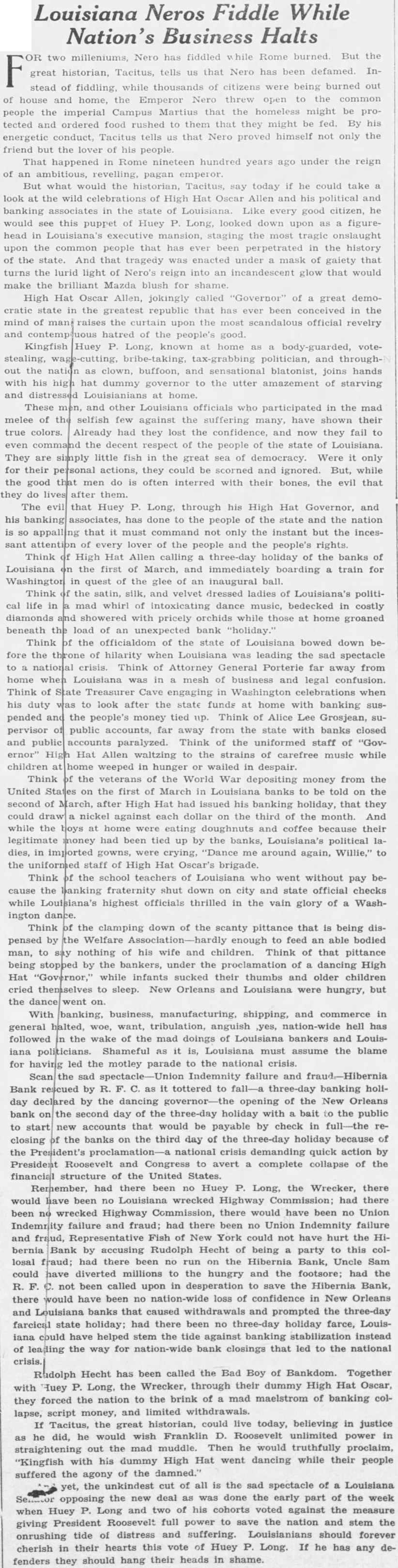 Louisiana Neros Fiddle While Nation's Business Halts two milleniums, has fiddled Rome burned. But the great historian, Tacitus, us that Nero has been defamed. Instead of fiddling, thousands citizens were being burned out house and home, the Emperor Nero threw open the common people the imperial Campus that the might protected and ordered rushed to them they might be fed. By his energetic conduct, Tacitus tells that Nero proved himself not only the friend the lover of his people. That happened Rome nineteen hundred years ago under the reign of an ambitious, revelling, pagan emperor. But what would the Tacitus, say today if he could take look at the wild of High Hat Oscar Allen and his and banking associates in the state of Louisiana. Like every good citizen, he would puppet Huey Long, looked down upon figurehead Louisiana's mansion, staging most tragic onslaught upon the common people that has ever been perpetrated in the history of the state. And that tragedy enacted under mask of gaiety that turns the lurid light of Nero's reign into an incandescent glow that would make the brilliant Mazda blush for shame High Hat Oscar Allen, jokingly called "Governor" of great democratic state the greatest republic that has ever been conceived in the mind of raises the upon the most scandalous official revelry and of the good. Kingfish Huey Long, known home as votestealing, politician, and throughout the clown, buffoon, and sensational blatonist, joins hands with his hat dummy governor to the utter amazement of starving and distressed Louisianians home These and other Louisiana officials who participated in the mad melee of selfish against the many, their true colors. Already had they lost confidence, and now they fail to command the decent respect of the people the state Louisiana. They are little fish in the great sea of democracy. Were only for their actions, they could be and ignored. But, while the good men do often interred with their bones, the evil that they do them. The that Huey Long, through his High Hat Governor, and his banking associates, has done to the people of the state and the nation that must not only the instant but the incessant of lover of the people and the people's rights. Think High Hat Allen holiday the banks of Louisiana the first March, and immediately boarding train for Washington quest the glee an inaugural ball. Think the satin, silk, and velvet dressed ladies of Louisiana's political life mad whirl of intoxicating dance music, bedecked in costly diamonds showered with pricely orchids while those home groaned beneath load of an unexpected bank Think the officialdom of the state of Louisiana bowed down before the of hilarity when Louisiana leading the sad spectacle national crisis. Think of Attorney General Porterie far away from home Louisiana mesh business legal confusion. Think Treasurer engaging Washington celebrations when his duty to look after the state funds at home with banking suspended the people's money tied up. Think of Alice Lee Grosjean, supervisor public accounts, far away from the state with banks closed and public paralyzed. Think of the uniformed staff of "Governor" Hat Allen waltzing the strains of carefree music while children weeped in hunger wailed despair. Think the veterans of the World War depositing from the United on the first March in Louisiana banks to be told on the second of High Hat had issued his banking holiday, that they could nickel against each dollar on the third of the month. And while boys at home were eating doughnuts and coffee because their legitimate money had been tied up by the banks, Louisiana's political ladies, in crying, me around again, Willie," to the uniformed staff of High Hat brigade. Think the school teachers of Louisiana who went without pay because the fraternity shut down on city and state official checks while highest officials thrilled in the vain glory of Washington Think the clamping down of the scanty pittance that is being dispensed by the Welfare enough to feed able bodied man, nothing of his wife and children. Think of that pittance being by the bankers, under the proclamation of dancing High Hat while infants sucked their thumbs older children cried to sleep. New Orleans and Louisiana hungry, but the on. With banking, business, manufacturing, shipping, and commerce in general halted, woe, want, tribulation, anguish yes, nation-wide hell followed the wake of the mad doings of Louisiana bankers and Louisiana Shameful as is, Louisiana must assume the blame for having led the motley parade the crisis. the sad Indemnity failure and Bank by as it tottered to fall-a three-day banking holiday declared by the dancing opening of the New Orleans bank second day of the three-day holiday with bait to the public to start new accounts that would be payable by check in reclosing the banks the third day the three-day holiday because of the national crisis demanding quick action by President Roosevelt and Congress to avert complete collapse of the financial structure of the United States. Remember, had there been no Huey Long, the Wrecker, there would have been Louisiana Highway had there been wrecked Highway Commission, there would have been no Union Indemrity failure fraud; had there been no Union Indemnity failure and Representative Fish of New York could not have hurt the Hibernia Bank accusing Rudolph Hecht of being party this collosal there been the Bank, Uncle could diverted millions the hungry and the footsore; had the not been called in desperation to save the Hibernia Bank, upon there would have been no nation-wide loss of confidence in New Orleans and Louisiana banks caused and prompted the three-day farcical state holiday; had there been no three-day holiday farce, Louisiana have helped stem the tide banking stabilization instead of leading the way for bank closings that led to the national crisis. Radolph Hecht been called the Bad Boy of Bankdom. Together the Wrecker, through their dummy High Hat Oscar, with