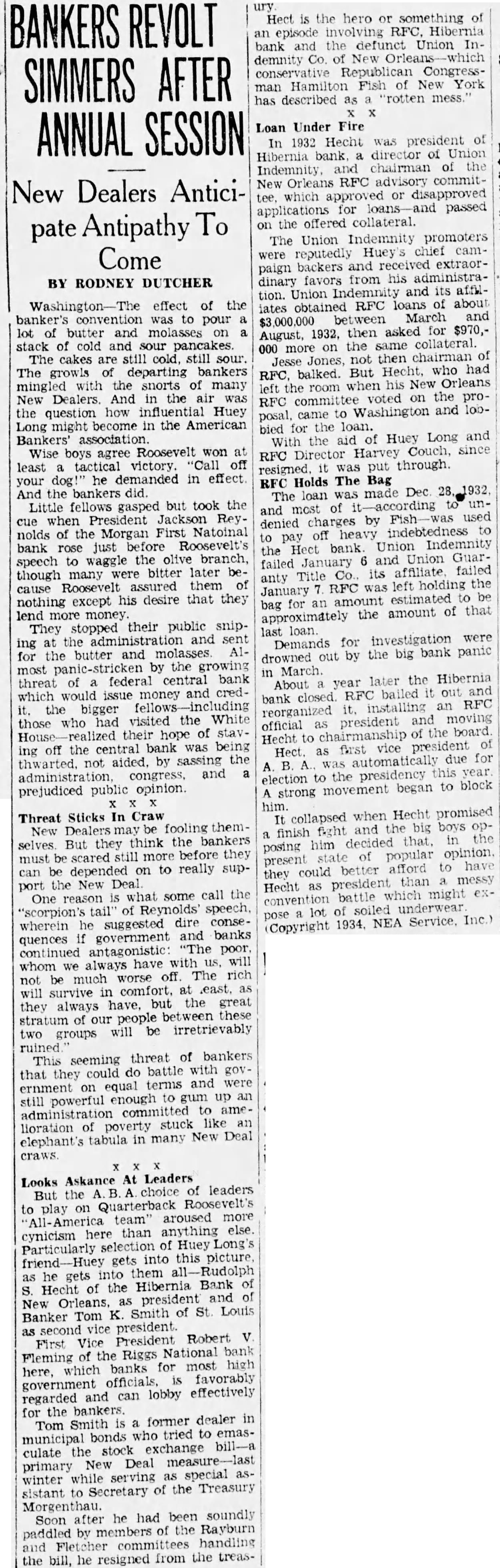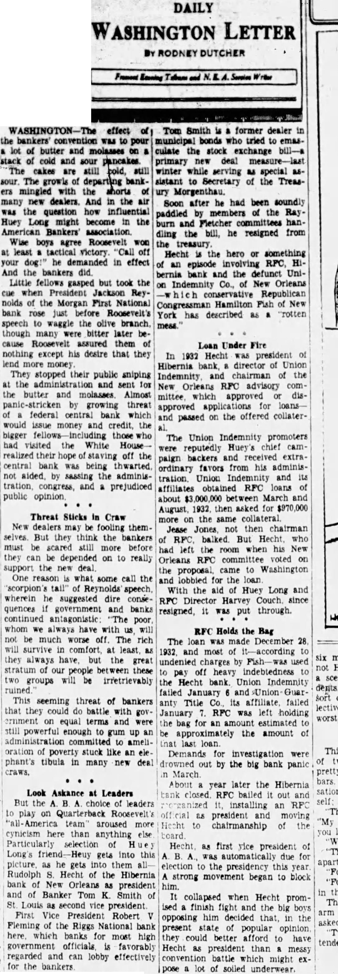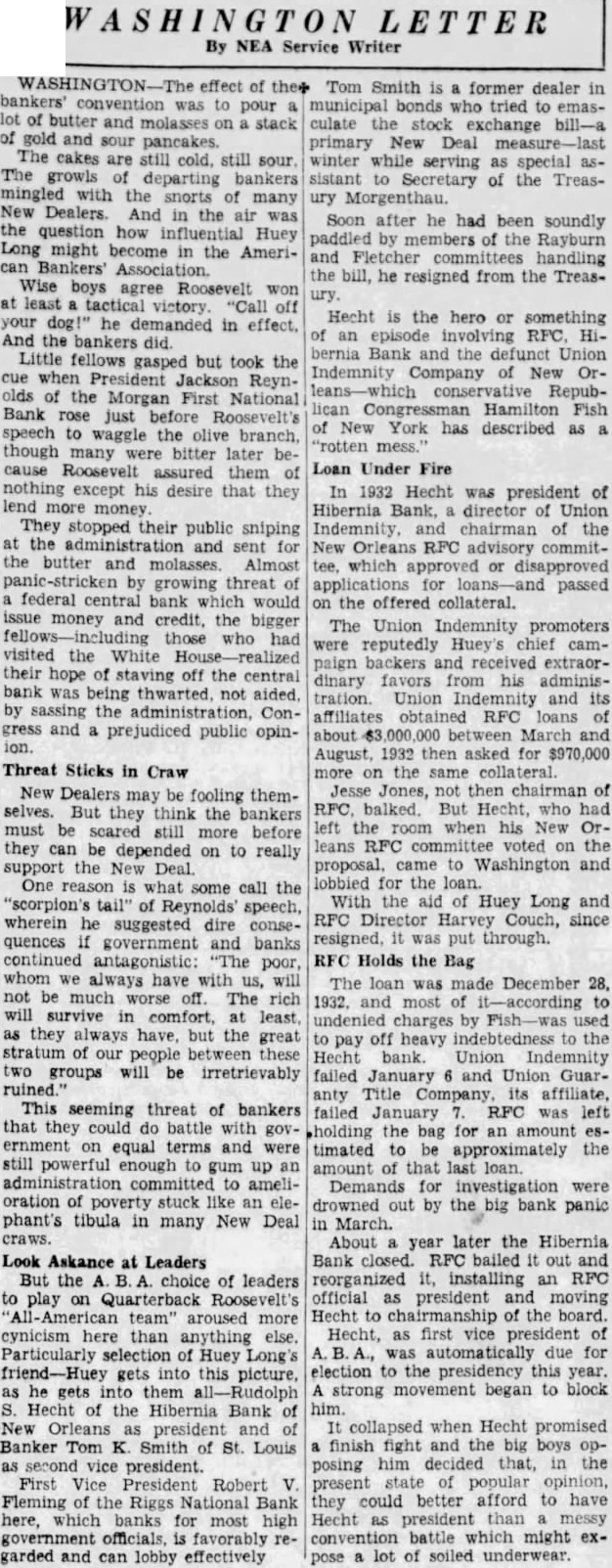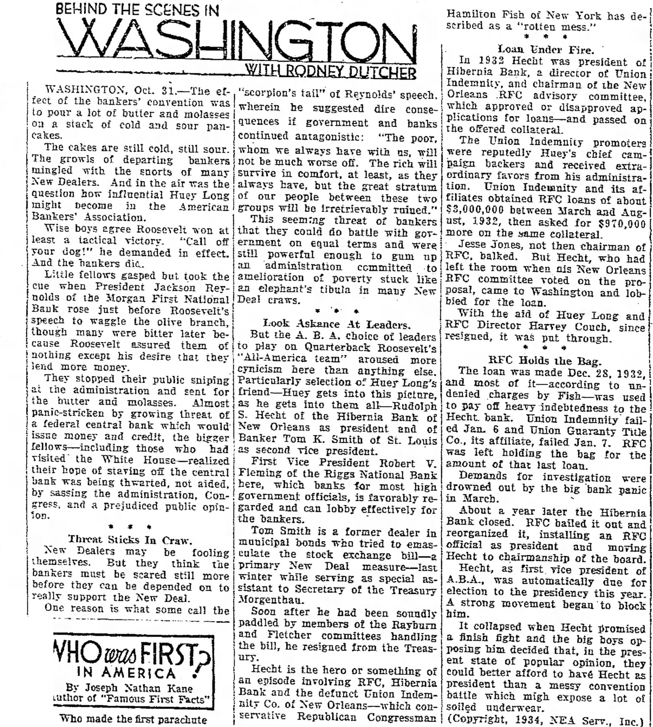 Louisiana Neros Fiddle While Nation's Business Halts two milleniums, has fiddled Rome burned. But the great historian, Tacitus, us that Nero has been defamed. Instead of fiddling, thousands citizens were being burned out house and home, the Emperor Nero threw open the common people the imperial Campus that the might protected and ordered rushed to them they might be fed. By his energetic conduct, Tacitus tells that Nero proved himself not only the friend the lover of his people. That happened Rome nineteen hundred years ago under the reign of an ambitious, revelling, pagan emperor. But what would the Tacitus, say today if he could take look at the wild of High Hat Oscar Allen and his and banking associates in the state of Louisiana. Like every good citizen, he would puppet Huey Long, looked down upon figurehead Louisiana's mansion, staging most tragic onslaught upon the common people that has ever been perpetrated in the history of the state. And that tragedy enacted under mask of gaiety that turns the lurid light of Nero's reign into an incandescent glow that would make the brilliant Mazda blush for shame High Hat Oscar Allen, jokingly called "Governor" of great democratic state the greatest republic that has ever been conceived in the mind of raises the upon the most scandalous official revelry and of the good. Kingfish Huey Long, known home as votestealing, politician, and throughout the clown, buffoon, and sensational blatonist, joins hands with his hat dummy governor to the utter amazement of starving and distressed Louisianians home These and other Louisiana officials who participated in the mad melee of selfish against the many, their true colors. Already had they lost confidence, and now they fail to command the decent respect of the people the state Louisiana. They are little fish in the great sea of democracy. Were only for their actions, they could be and ignored. But, while the good men do often interred with their bones, the evil that they do them. The that Huey Long, through his High Hat Governor, and his banking associates, has done to the people of the state and the nation that must not only the instant but the incessant of lover of the people and the people's rights. Think High Hat Allen holiday the banks of Louisiana the first March, and immediately boarding train for Washington quest the glee an inaugural ball. Think the satin, silk, and velvet dressed ladies of Louisiana's political life mad whirl of intoxicating dance music, bedecked in costly diamonds showered with pricely orchids while those home groaned beneath load of an unexpected bank Think the officialdom of the state of Louisiana bowed down before the of hilarity when Louisiana leading the sad spectacle national crisis. Think of Attorney General Porterie far away from home Louisiana mesh business legal confusion. Think Treasurer engaging Washington celebrations when his duty to look after the state funds at home with banking suspended the people's money tied up. Think of Alice Lee Grosjean, supervisor public accounts, far away from the state with banks closed and public paralyzed. Think of the uniformed staff of "Governor" Hat Allen waltzing the strains of carefree music while children weeped in hunger wailed despair. Think the veterans of the World War depositing from the United on the first March in Louisiana banks to be told on the second of High Hat had issued his banking holiday, that they could nickel against each dollar on the third of the month. And while boys at home were eating doughnuts and coffee because their legitimate money had been tied up by the banks, Louisiana's political ladies, in crying, me around again, Willie," to the uniformed staff of High Hat brigade. Think the school teachers of Louisiana who went without pay because the fraternity shut down on city and state official checks while highest officials thrilled in the vain glory of Washington Think the clamping down of the scanty pittance that is being dispensed by the Welfare enough to feed able bodied man, nothing of his wife and children. Think of that pittance being by the bankers, under the proclamation of dancing High Hat while infants sucked their thumbs older children cried to sleep. New Orleans and Louisiana hungry, but the on. With banking, business, manufacturing, shipping, and commerce in general halted, woe, want, tribulation, anguish yes, nation-wide hell followed the wake of the mad doings of Louisiana bankers and Louisiana Shameful as is, Louisiana must assume the blame for having led the motley parade the crisis. the sad Indemnity failure and Bank by as it tottered to fall-a three-day banking holiday declared by the dancing opening of the New Orleans bank second day of the three-day holiday with bait to the public to start new accounts that would be payable by check in reclosing the banks the third day the three-day holiday because of the national crisis demanding quick action by President Roosevelt and Congress to avert complete collapse of the financial structure of the United States. Remember, had there been no Huey Long, the Wrecker, there would have been Louisiana Highway had there been wrecked Highway Commission, there would have been no Union Indemrity failure fraud; had there been no Union Indemnity failure and Representative Fish of New York could not have hurt the Hibernia Bank accusing Rudolph Hecht of being party this collosal there been the Bank, Uncle could diverted millions the hungry and the footsore; had the not been called in desperation to save the Hibernia Bank, upon there would have been no nation-wide loss of confidence in New Orleans and Louisiana banks caused and prompted the three-day farcical state holiday; had there been no three-day holiday farce, Louisiana have helped stem the tide banking stabilization instead of leading the way for bank closings that led to the national crisis. Radolph Hecht been called the Bad Boy of Bankdom. Together the Wrecker, through their dummy High Hat Oscar, with
