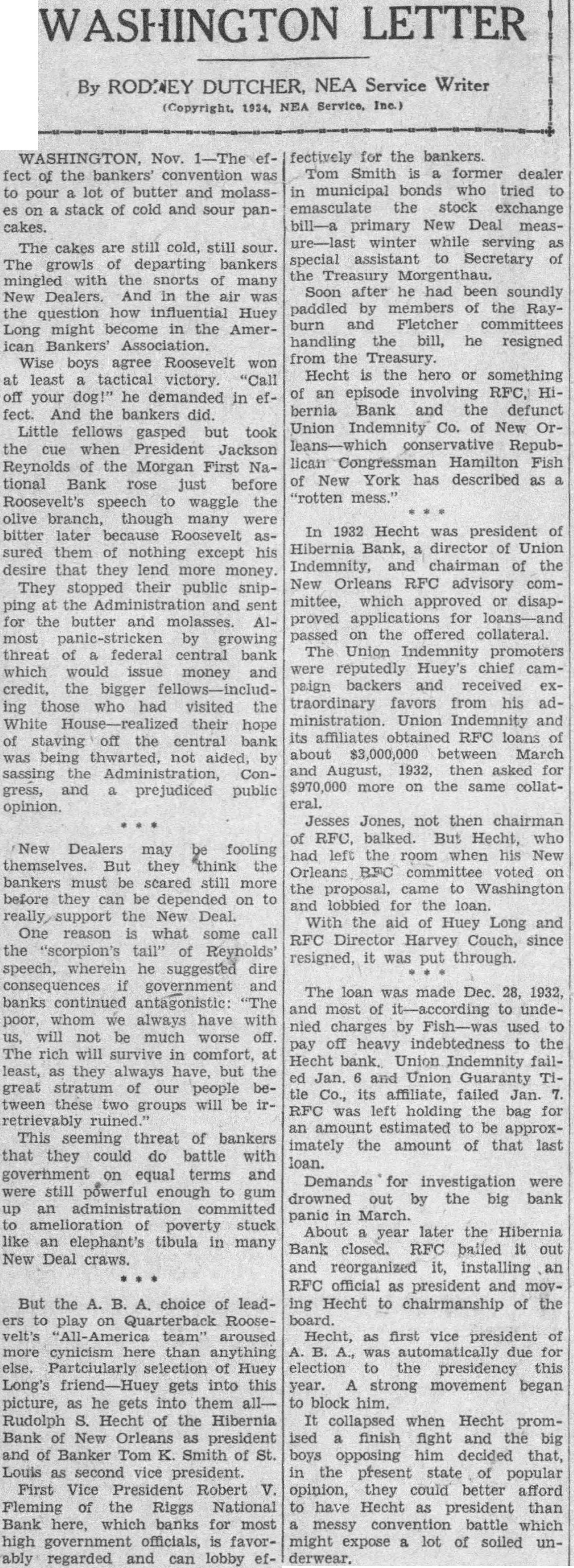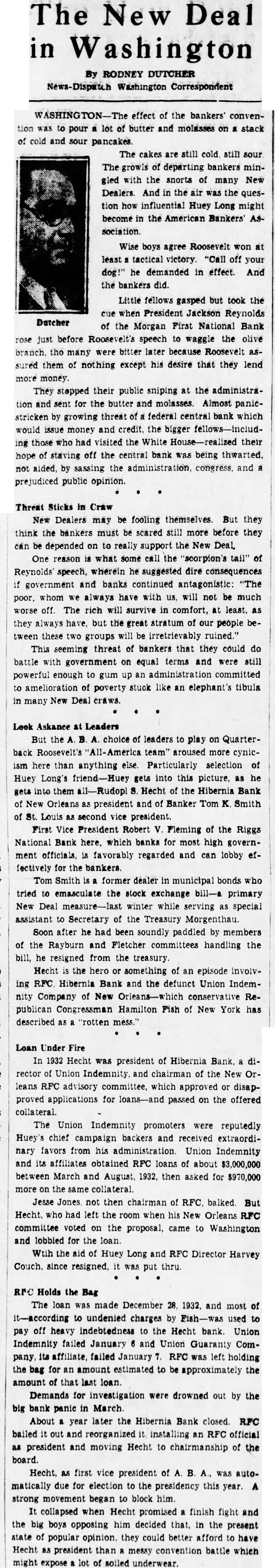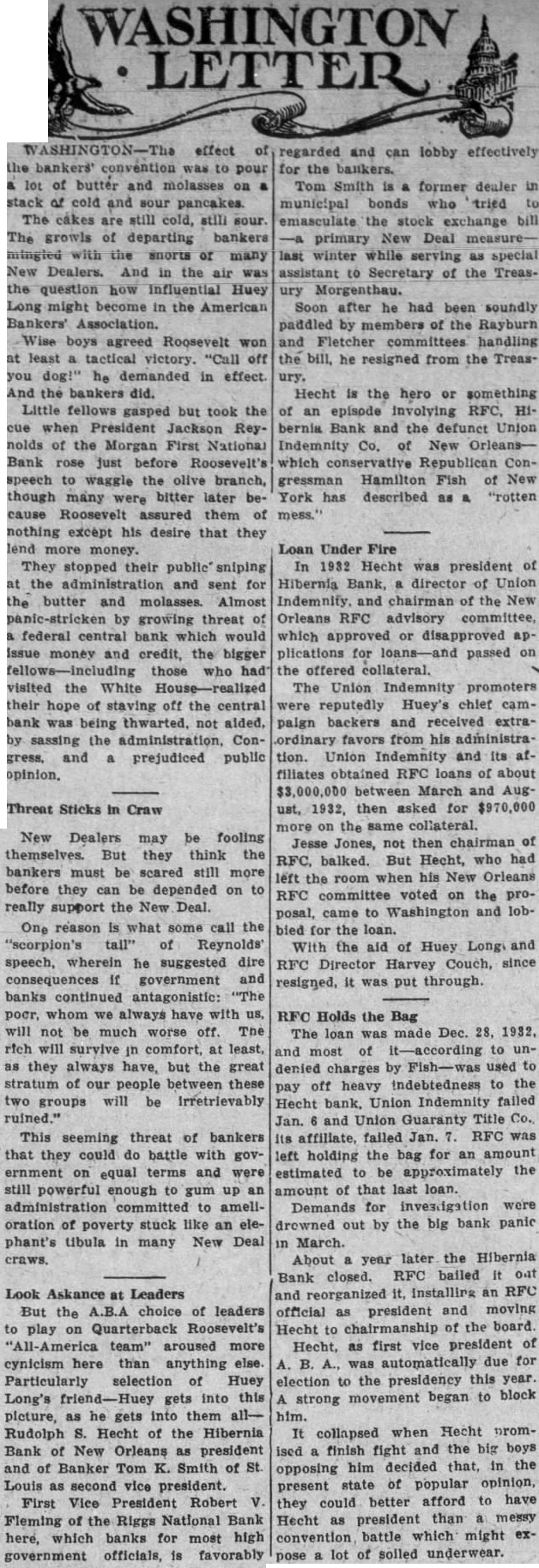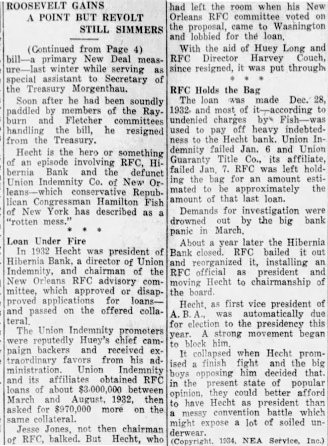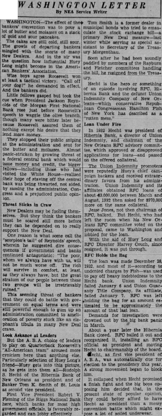Louisiana Neros Fiddle While Nation's Business Halts two milleniums, has fiddled Rome burned. But the great historian, Tacitus, us that Nero has been defamed. Instead of fiddling, thousands citizens were being burned out house and home, the Emperor Nero threw open the common people the imperial Campus that the might protected and ordered rushed to them they might be fed. By his energetic conduct, Tacitus tells that Nero proved himself not only the friend the lover of his people. That happened Rome nineteen hundred years ago under the reign of an ambitious, revelling, pagan emperor. But what would the Tacitus, say today if he could take look at the wild of High Hat Oscar Allen and his and banking associates in the state of Louisiana. Like every good citizen, he would puppet Huey Long, looked down upon figurehead Louisiana's mansion, staging most tragic onslaught upon the common people that has ever been perpetrated in the history of the state. And that tragedy enacted under mask of gaiety that turns the lurid light of Nero's reign into an incandescent glow that would make the brilliant Mazda blush for shame High Hat Oscar Allen, jokingly called "Governor" of great democratic state the greatest republic that has ever been conceived in the mind of raises the upon the most scandalous official revelry and of the good. Kingfish Huey Long, known home as votestealing, politician, and throughout the clown, buffoon, and sensational blatonist, joins hands with his hat dummy governor to the utter amazement of starving and distressed Louisianians home These and other Louisiana officials who participated in the mad melee of selfish against the many, their true colors. Already had they lost confidence, and now they fail to command the decent respect of the people the state Louisiana. They are little fish in the great sea of democracy. Were only for their actions, they could be and ignored. But, while the good men do often interred with their bones, the evil that they do them. The that Huey Long, through his High Hat Governor, and his banking associates, has done to the people of the state and the nation that must not only the instant but the incessant of lover of the people and the people's rights. Think High Hat Allen holiday the banks of Louisiana the first March, and immediately boarding train for Washington quest the glee an inaugural ball. Think the satin, silk, and velvet dressed ladies of Louisiana's political life mad whirl of intoxicating dance music, bedecked in costly diamonds showered with pricely orchids while those home groaned beneath load of an unexpected bank Think the officialdom of the state of Louisiana bowed down before the of hilarity when Louisiana leading the sad spectacle national crisis. Think of Attorney General Porterie far away from home Louisiana mesh business legal confusion. Think Treasurer engaging Washington celebrations when his duty to look after the state funds at home with banking suspended the people's money tied up. Think of Alice Lee Grosjean, supervisor public accounts, far away from the state with banks closed and public paralyzed. Think of the uniformed staff of "Governor" Hat Allen waltzing the strains of carefree music while children weeped in hunger wailed despair. Think the veterans of the World War depositing from the United on the first March in Louisiana banks to be told on the second of High Hat had issued his banking holiday, that they could nickel against each dollar on the third of the month. And while boys at home were eating doughnuts and coffee because their legitimate money had been tied up by the banks, Louisiana's political ladies, in crying, me around again, Willie," to the uniformed staff of High Hat brigade. Think the school teachers of Louisiana who went without pay because the fraternity shut down on city and state official checks while highest officials thrilled in the vain glory of Washington Think the clamping down of the scanty pittance that is being dispensed by the Welfare enough to feed able bodied man, nothing of his wife and children. Think of that pittance being by the bankers, under the proclamation of dancing High Hat while infants sucked their thumbs older children cried to sleep. New Orleans and Louisiana hungry, but the on. With banking, business, manufacturing, shipping, and commerce in general halted, woe, want, tribulation, anguish yes, nation-wide hell followed the wake of the mad doings of Louisiana bankers and Louisiana Shameful as is, Louisiana must assume the blame for having led the motley parade the crisis. the sad Indemnity failure and Bank by as it tottered to fall-a three-day banking holiday declared by the dancing opening of the New Orleans bank second day of the three-day holiday with bait to the public to start new accounts that would be payable by check in reclosing the banks the third day the three-day holiday because of the national crisis demanding quick action by President Roosevelt and Congress to avert complete collapse of the financial structure of the United States. Remember, had there been no Huey Long, the Wrecker, there would have been Louisiana Highway had there been wrecked Highway Commission, there would have been no Union Indemrity failure fraud; had there been no Union Indemnity failure and Representative Fish of New York could not have hurt the Hibernia Bank accusing Rudolph Hecht of being party this collosal there been the Bank, Uncle could diverted millions the hungry and the footsore; had the not been called in desperation to save the Hibernia Bank, upon there would have been no nation-wide loss of confidence in New Orleans and Louisiana banks caused and prompted the three-day farcical state holiday; had there been no three-day holiday farce, Louisiana have helped stem the tide banking stabilization instead of leading the way for bank closings that led to the national crisis. Radolph Hecht been called the Bad Boy of Bankdom. Together the Wrecker, through their dummy High Hat Oscar, with