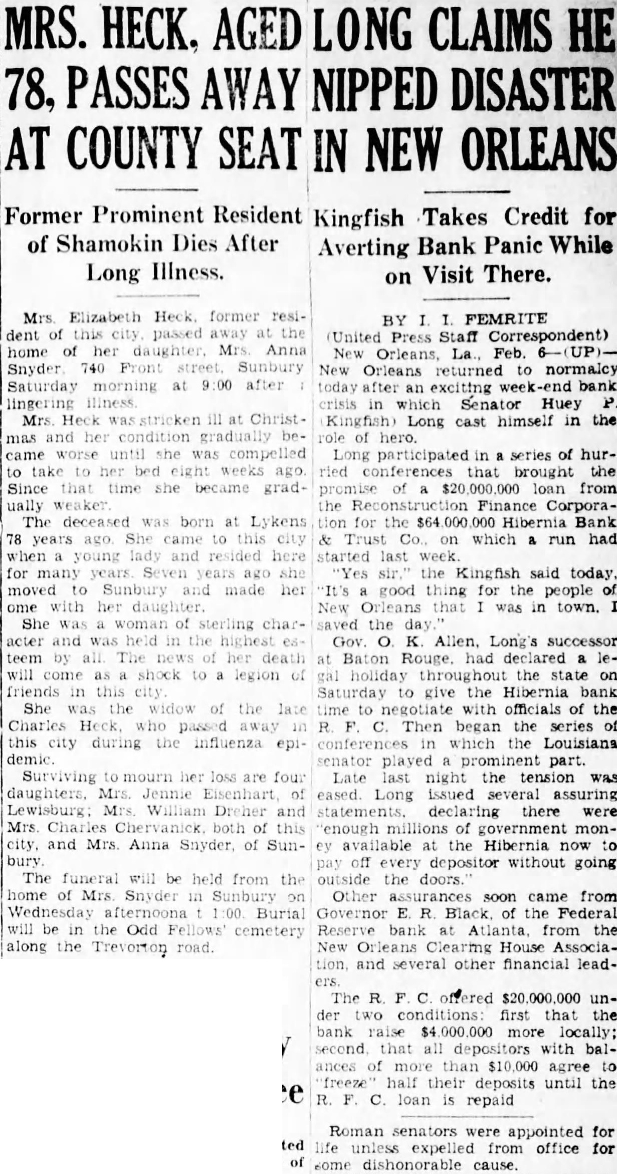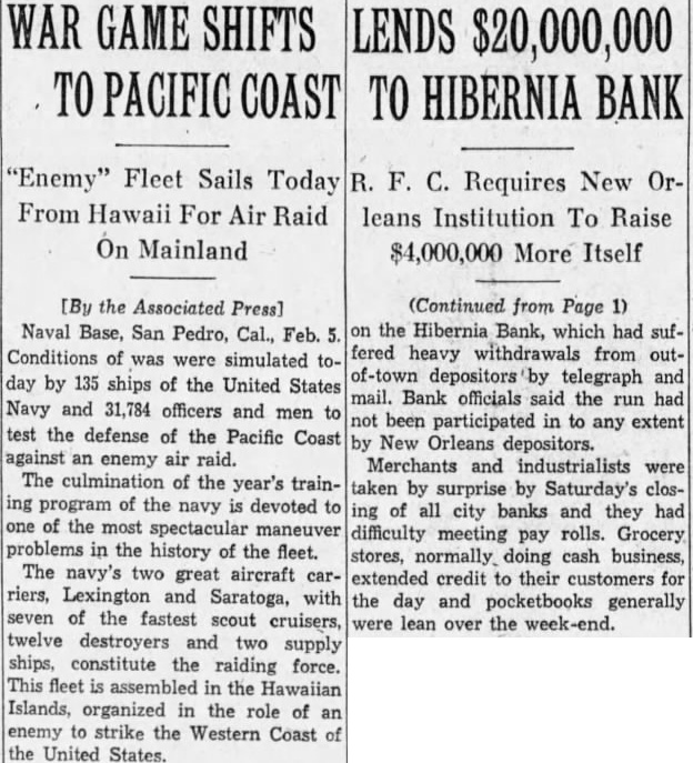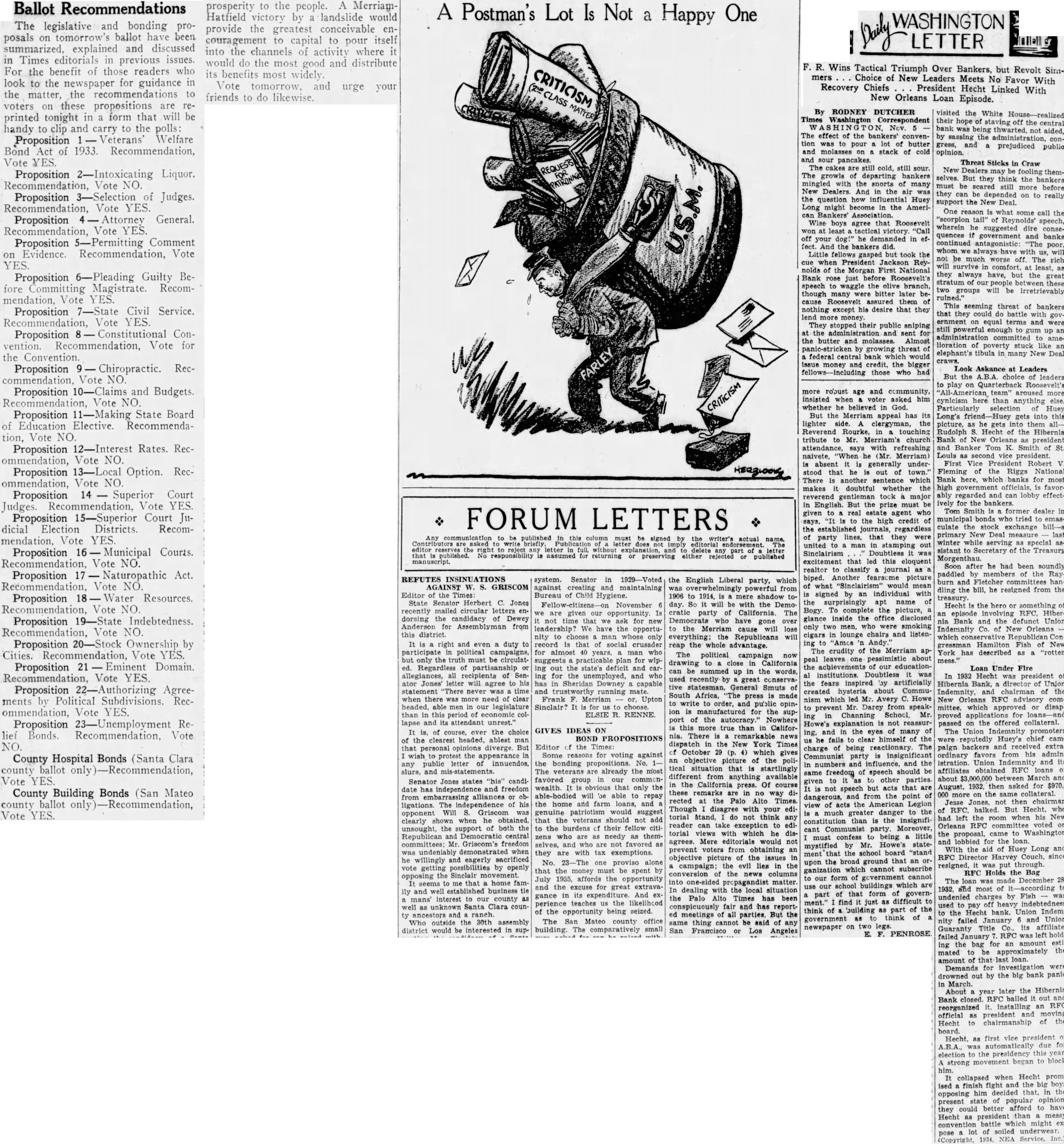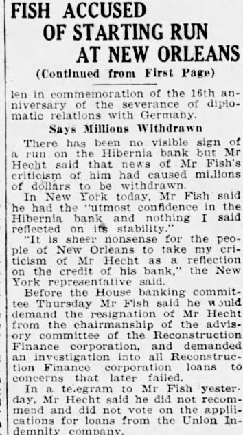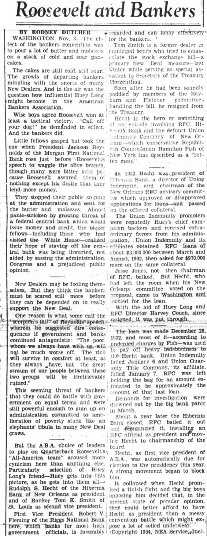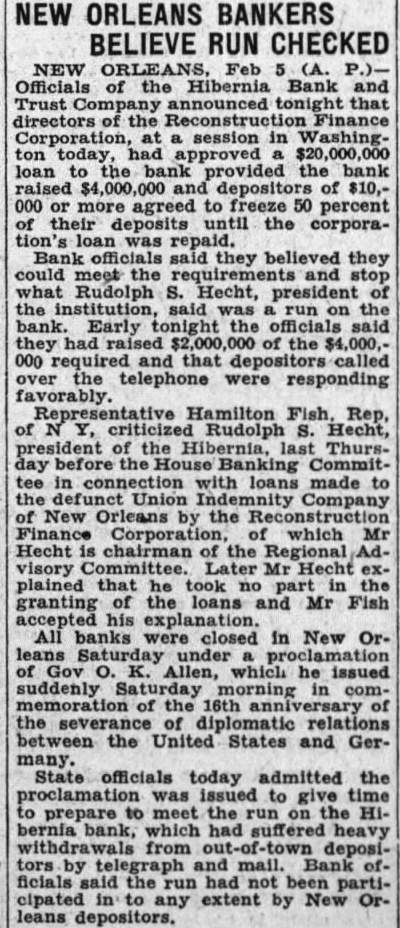 Louisiana Neros Fiddle While Nation's Business Halts two milleniums, has fiddled Rome burned. But the great historian, Tacitus, us that Nero has been defamed. Instead of fiddling, thousands citizens were being burned out house and home, the Emperor Nero threw open the common people the imperial Campus that the might protected and ordered rushed to them they might be fed. By his energetic conduct, Tacitus tells that Nero proved himself not only the friend the lover of his people. That happened Rome nineteen hundred years ago under the reign of an ambitious, revelling, pagan emperor. But what would the Tacitus, say today if he could take look at the wild of High Hat Oscar Allen and his and banking associates in the state of Louisiana. Like every good citizen, he would puppet Huey Long, looked down upon figurehead Louisiana's mansion, staging most tragic onslaught upon the common people that has ever been perpetrated in the history of the state. And that tragedy enacted under mask of gaiety that turns the lurid light of Nero's reign into an incandescent glow that would make the brilliant Mazda blush for shame High Hat Oscar Allen, jokingly called "Governor" of great democratic state the greatest republic that has ever been conceived in the mind of raises the upon the most scandalous official revelry and of the good. Kingfish Huey Long, known home as votestealing, politician, and throughout the clown, buffoon, and sensational blatonist, joins hands with his hat dummy governor to the utter amazement of starving and distressed Louisianians home These and other Louisiana officials who participated in the mad melee of selfish against the many, their true colors. Already had they lost confidence, and now they fail to command the decent respect of the people the state Louisiana. They are little fish in the great sea of democracy. Were only for their actions, they could be and ignored. But, while the good men do often interred with their bones, the evil that they do them. The that Huey Long, through his High Hat Governor, and his banking associates, has done to the people of the state and the nation that must not only the instant but the incessant of lover of the people and the people's rights. Think High Hat Allen holiday the banks of Louisiana the first March, and immediately boarding train for Washington quest the glee an inaugural ball. Think the satin, silk, and velvet dressed ladies of Louisiana's political life mad whirl of intoxicating dance music, bedecked in costly diamonds showered with pricely orchids while those home groaned beneath load of an unexpected bank Think the officialdom of the state of Louisiana bowed down before the of hilarity when Louisiana leading the sad spectacle national crisis. Think of Attorney General Porterie far away from home Louisiana mesh business legal confusion. Think Treasurer engaging Washington celebrations when his duty to look after the state funds at home with banking suspended the people's money tied up. Think of Alice Lee Grosjean, supervisor public accounts, far away from the state with banks closed and public paralyzed. Think of the uniformed staff of "Governor" Hat Allen waltzing the strains of carefree music while children weeped in hunger wailed despair. Think the veterans of the World War depositing from the United on the first March in Louisiana banks to be told on the second of High Hat had issued his banking holiday, that they could nickel against each dollar on the third of the month. And while boys at home were eating doughnuts and coffee because their legitimate money had been tied up by the banks, Louisiana's political ladies, in crying, me around again, Willie," to the uniformed staff of High Hat brigade. Think the school teachers of Louisiana who went without pay because the fraternity shut down on city and state official checks while highest officials thrilled in the vain glory of Washington Think the clamping down of the scanty pittance that is being dispensed by the Welfare enough to feed able bodied man, nothing of his wife and children. Think of that pittance being by the bankers, under the proclamation of dancing High Hat while infants sucked their thumbs older children cried to sleep. New Orleans and Louisiana hungry, but the on. With banking, business, manufacturing, shipping, and commerce in general halted, woe, want, tribulation, anguish yes, nation-wide hell followed the wake of the mad doings of Louisiana bankers and Louisiana Shameful as is, Louisiana must assume the blame for having led the motley parade the crisis. the sad Indemnity failure and Bank by as it tottered to fall-a three-day banking holiday declared by the dancing opening of the New Orleans bank second day of the three-day holiday with bait to the public to start new accounts that would be payable by check in reclosing the banks the third day the three-day holiday because of the national crisis demanding quick action by President Roosevelt and Congress to avert complete collapse of the financial structure of the United States. Remember, had there been no Huey Long, the Wrecker, there would have been Louisiana Highway had there been wrecked Highway Commission, there would have been no Union Indemrity failure fraud; had there been no Union Indemnity failure and Representative Fish of New York could not have hurt the Hibernia Bank accusing Rudolph Hecht of being party this collosal there been the Bank, Uncle could diverted millions the hungry and the footsore; had the not been called in desperation to save the Hibernia Bank, upon there would have been no nation-wide loss of confidence in New Orleans and Louisiana banks caused and prompted the three-day farcical state holiday; had there been no three-day holiday farce, Louisiana have helped stem the tide banking stabilization instead of leading the way for bank closings that led to the national crisis. Radolph Hecht been called the Bad Boy of Bankdom. Together the Wrecker, through their dummy High Hat Oscar, with