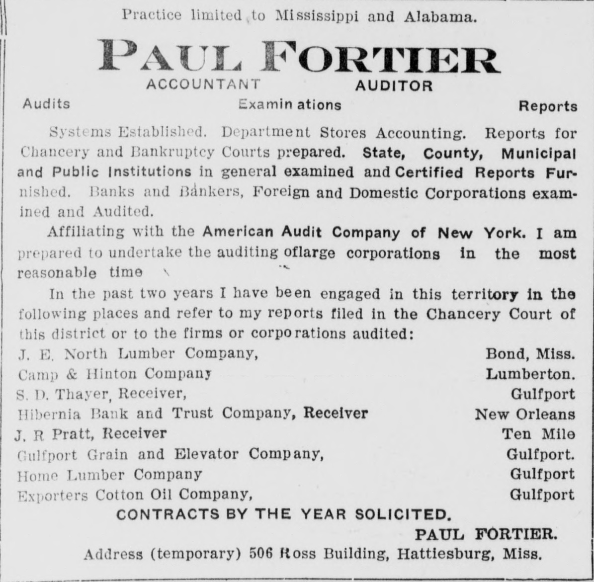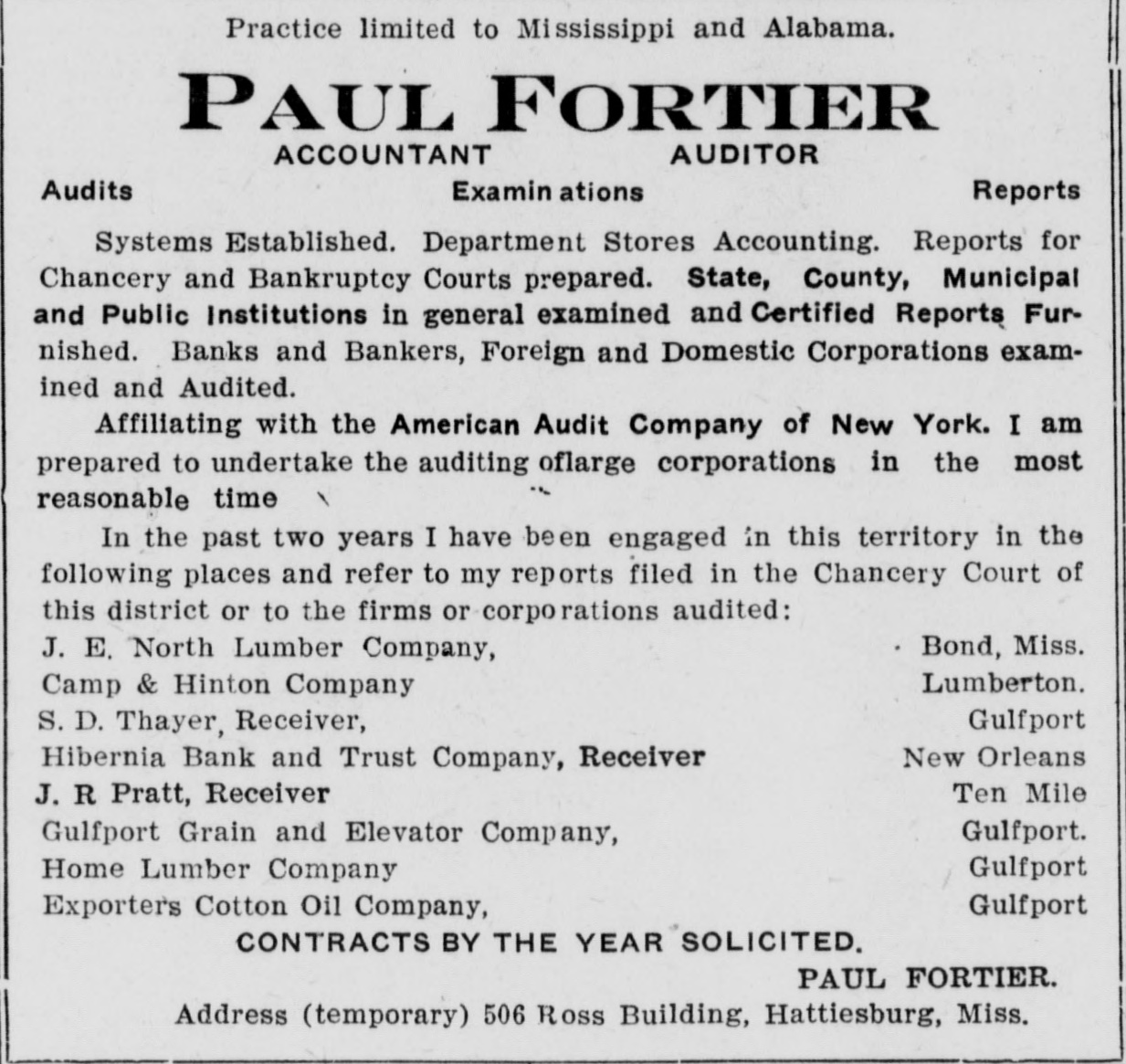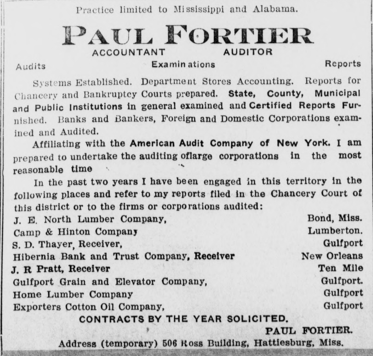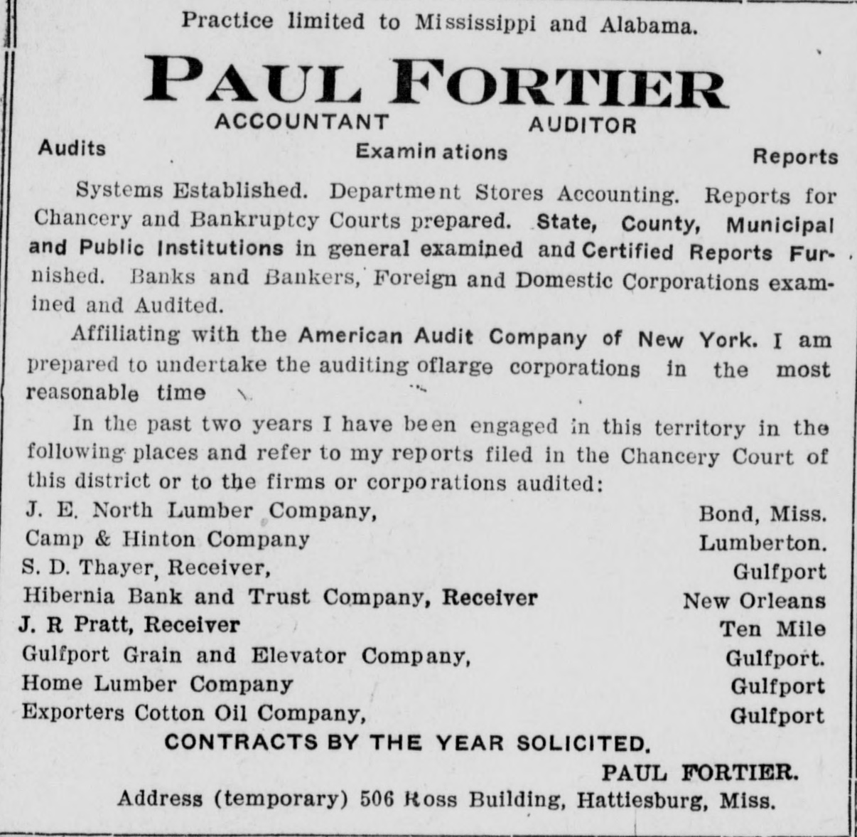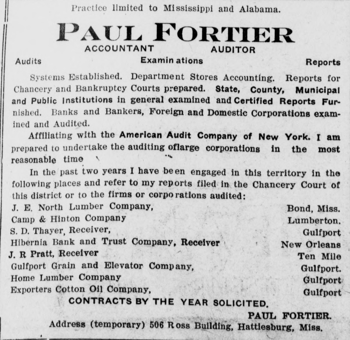 Practice limited to Mississippi and Alabama. # PAUL FORTIER ACCOUNTANT AUDITOR Audits Examinations Reports Systems Established. Department Stores Accounting. Reports for Chancery and Bankruptcy Courts prepared. State, County, Municipal and Public Institutions in general examined and Certified Reports Furnished. Banks and Bankers, Foreign and Domestic Corporations examined and Audited. Affiliating with the American Audit Company of New York. I am prepared to undertake the auditing of large corporations in the most reasonable time In the past two years I have been engaged in this territory in the following places and refer to my reports filed in the Chancery Court of this district or to the firms or corporations audited: J. E. North Lumber Company, Bond, Miss. Camp & Hinton Company Lumberton. S. D. Thayer, Receiver, Gulfport Hibernia Bank and Trust Company, Receiver New Orleans J. R Pratt, Receiver Ten Mile Gulfport Grain and Elevator Company, Gulfport. Home Lumber Company Gulfport Exporters Cotton Oil Company, Gulfport CONTRACTS BY THE YEAR SOLICITED. PAUL FORTIER. Address (temporary) 506 Ross Building, Hattiesburg, Miss.