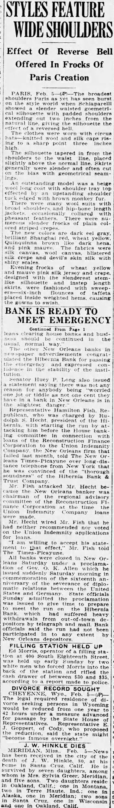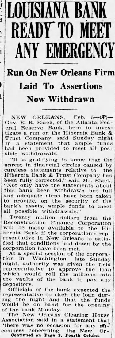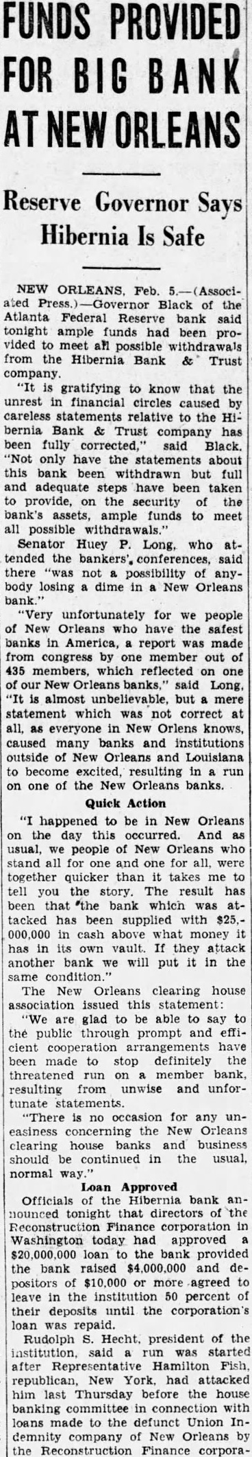 NEW Feb ated Black of the Atlanta Federal Reserve bank said tonight ample funds had been provided meet all possible withdrawals from the Hibernia Bank Trust company. "It is gratifying to know that the unrest in financial circles caused careless statements relative to the Hibernia Bank Trust company has been fully corrected, said Black. "Not only have the statements about this bank withdrawn but full and adequate steps have been taken to provide, on the security of the bank's assets, ample funds to meet all possible Senator Huey Long, who attended the bankers', conferences, said there "was not possibility anybody losing dime in New Orleans bank.' Very unfortunately for we people of New Orleans who have the safest banks in America, report was made from congress by one member out of 435 members, which reflected on one of New Orleans said Long. almost unbelievable, but mere statement which was not correct at all, everyone in New Orlens knows, caused many banks and institutions outside of New Orleans and Louisiana to become excited, resulting in run one of the New Orleans banks.