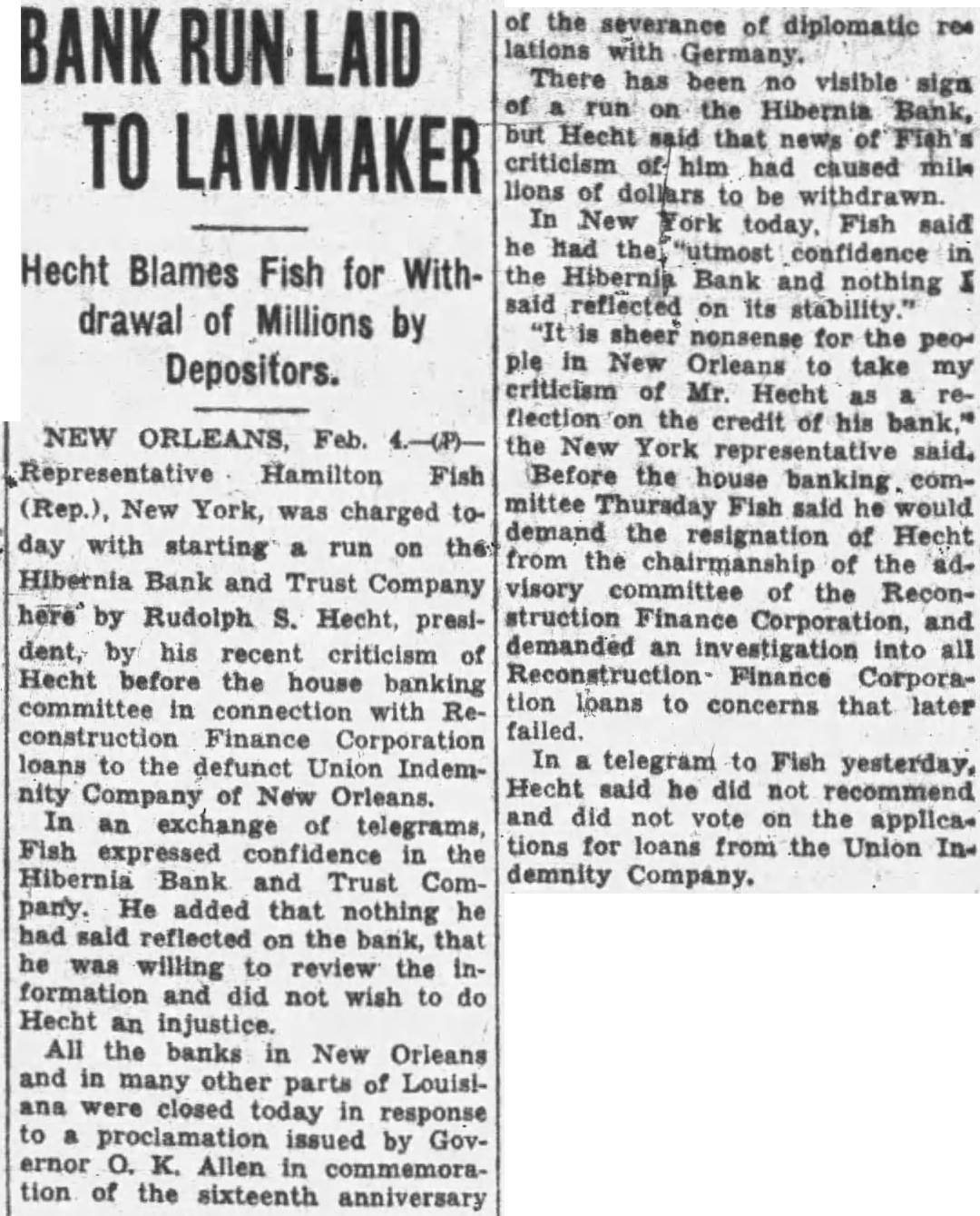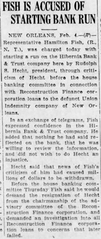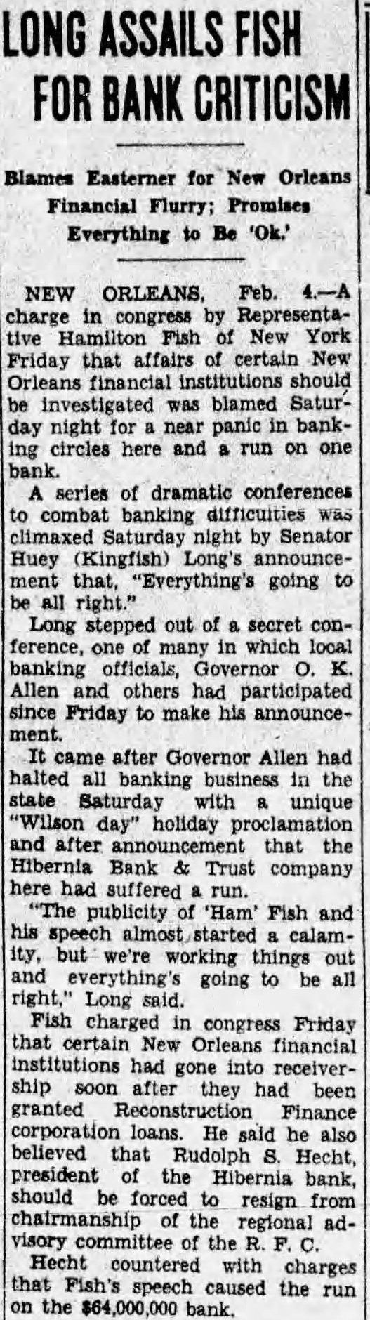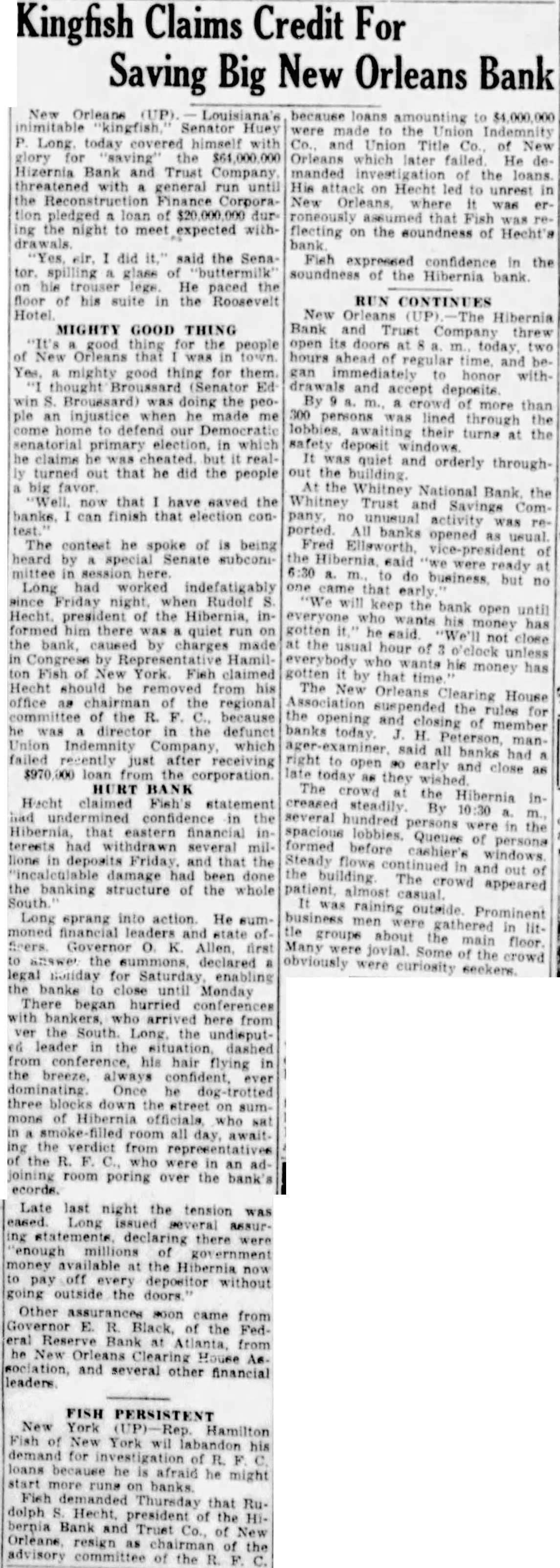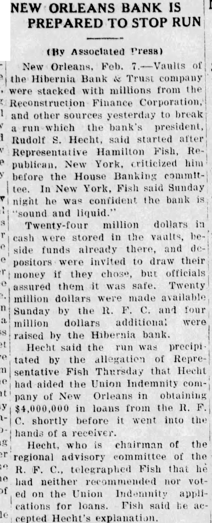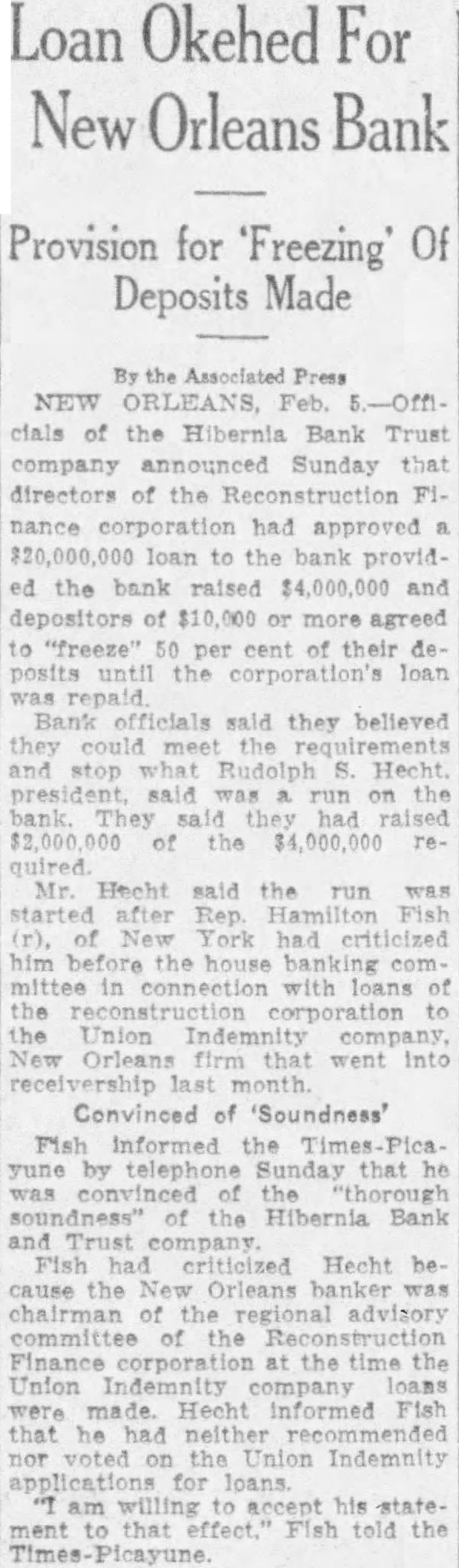 Quick Action happened to be in New Orleans the day this occurred. And usual, we people of New Orleans who stand all for one and one for were together quicker than takes me tell you the story. The result has been that "the bank which was attacked has been supplied with $25,000,000 in cash above what money has in its vault. If they attack another bank we will put in the same The New Orleans clearing house association issued this statement: glad to able to to the public through prompt and efficient cooperation arrangements been made to stop definitely the threatened run on member bank, resulting from unwise and unfortunate statements. "There is no occasion for any uneasiness concerning the New Orleans clearing house banks and business should be continued in the usual, normal Loan Approved Officials the Hibernia bank announced tonight that directors the Reconstruction Finance corporation in Washington today had approved loan the bank provided the bank raised $4,000,000 and depositors of $10,000 or more agreed leave the institution 50 percent of their deposits until the corporation's repaid. Rudolph Hecht. president of the institution, said started after Representative Hamilton Fish republican, New York, had attacked him last Thursday before the house banking committee connection with loans made to the defunct Union Indemnity company of New Orleans by the Reconstruction Finance corpora-