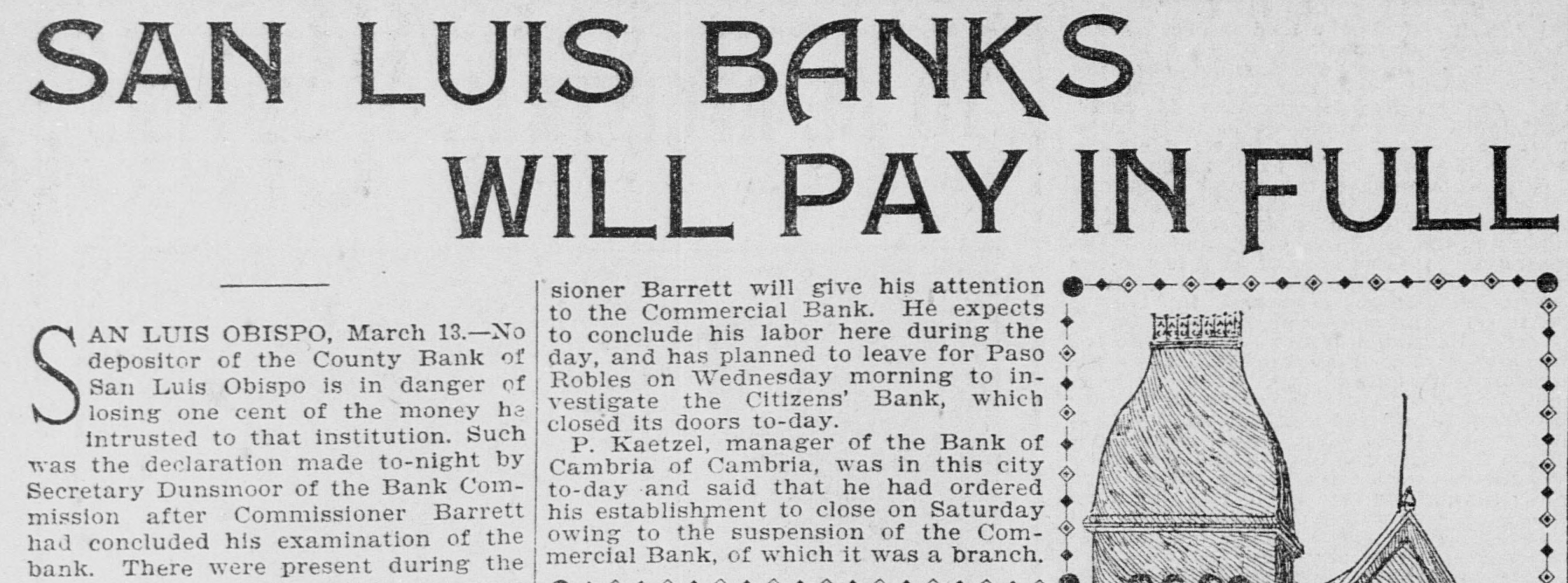 SAN LUIS BANKS WILL PAY IN FULL sioner Barrett will give his attention to the Commercial Bank. He expects to conclude his labor here during the AN LUIS OBISPO, March 13.-No day, and has planned to leave for Paso depositor of the County Bank of Robles on Wednesday morning to inSan Luis Obispo is in danger of vestigate the Citizens' Bank, which losing one cent of the money he S closed its doors to-day. intrusted to that institution. Such P. Kaetzel, manager of the Bank of was the declaration made to-night by Cambria of Cambria, was in this city to-day and said that he had ordered Secretary Dunsmoor of the Bank Comhis establishment to close on Saturday mission after Commissioner Barrett owing to the suspension of the Comhad concluded his examination of the mercial Bank, of which it was a branch. bank. There were present during the