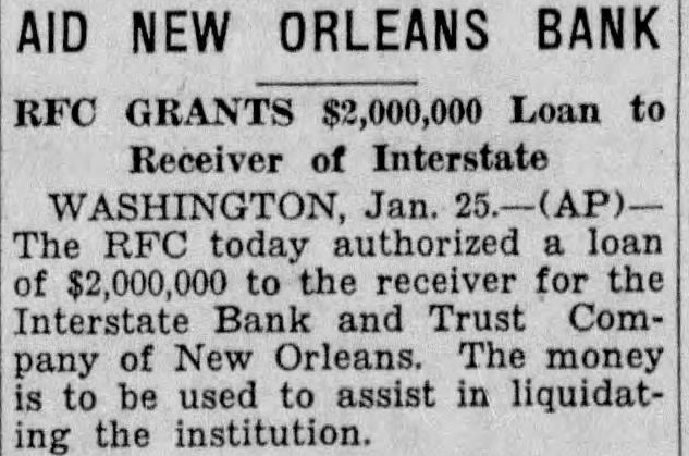 AID NEW ORLEANS BANK RFC GRANTS $2,000,000 Loan Receiver Interstate Jan. The RFC today authorized $2,000,000 receiver Interstate Bank Trust ComNew Orleans. The money be used to assist in liquidatthe institution.