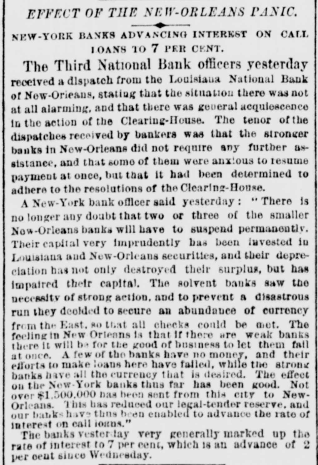 EFFECT OF THE NEW-ORLEANS PANIC. NEW-YORK BANKS ADVANCING INTEREST ON CALL LOANS TO 7 PER CENT. The Third National Bank officers yesterday received a dispatch from the Louisiana National Bank of New-Orieans, stating that the situation there was not at all alarming, and that there was general acquiescence in the action of the Clearing-House. The tenor of the dispatches received by bankers was that the stronger banks in New-Orleans did not require any further assistance, and that some of them were anxious to resume payment at once, but that it had been determined to adhere to the resolutions of the Clearing-House. A New-York bank officer said yesterday : "There is no longer any doubt that two or three of the smaller Now-Orleans banks will have to suspend permanently. Their capital very imprudently has been invested in Louisiana and New-Orleans securities, and their depreciation has not only destroyed their surplus, but has impaired their capital. The solvent banks saw the necessity of strong action. and to prevent a disastrous run they decided to secure an abundance of currency from the East. 80 that all checks could be met. The feeling in New Orteans is that If there are weak banks there it will be for the good of business to let them fail at once. A few of the banks have no money, and their efforts to make loans here have failed, while the strong banks have all the currency that is desired. The effect on the Now-York banks thus far has been good. Not over $1,500,000 has beon sent from this city to NewOrleans. This has reduced our legal-tender reserve, and our banks have thns been enabled to advance the rate of interest on call loans." The banks vesterday very generally marked up the rate of interest to 7 per cent, which 18 an advance of 2 per cent since Wednesday.