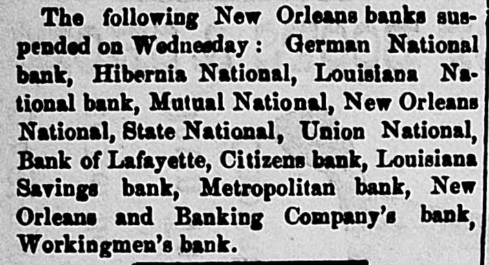 The following New Orleans banks suspended on Wednesday: German National bank, Hibernia National, Louisiana National bank, Mutual National, New Orleans National, State National, Union National, Bank of Lafayette, Citizens bank, Louisiana Savings bank, Metropolitan bank, New Orleans and Banking Company's bank, Workingmen's bank.