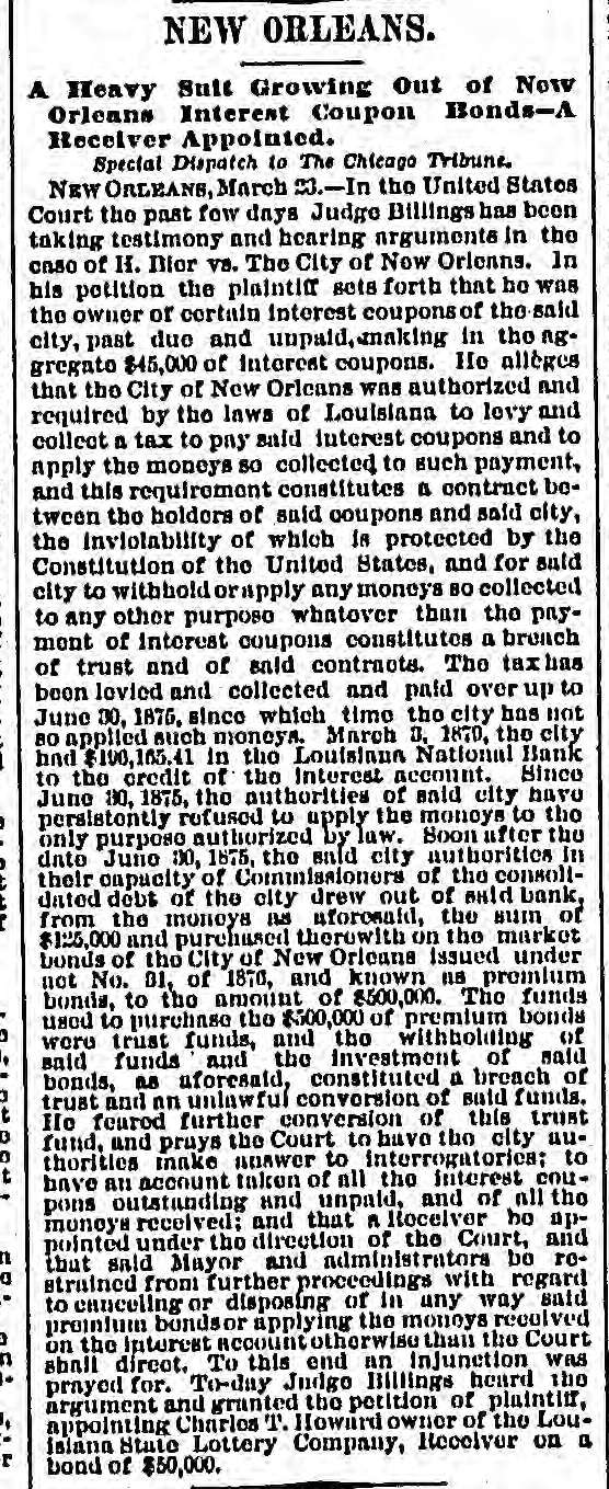 NEW ORLEANS. A Heavy Suit Growing Out of Now Orleans Interest Coupon Bonds-A Receiver Appointed. Special Dispatch to The Chicago Tribune. NEW ORLEANS, March 23.-In the United States Court the past few days Judge Billings has been taking testimony and hearing arguments In the caso of H. Bior vs. The City of Now Orlenns. In his potition the plaintiff sets forth that he was the owner of certain interest coupons of the said city, past due and unpaid, making in the ng. gregato $45,000 of interest coupons. He alleges that the City of New Orlcans was authorized and required by the laws of Louisiana to levy and collect a tax to pay said interest coupons and to apply the moneys so collected to such payment, and this requirement constitutes a contract between the holders of said coupons and said city, the inviolability of which in protected by the Constitution of the United States, and for said city to withhold orapply any moneys BO collected to any other purpose whatover than the paymont of interest coupons constitutes a breach of trust and of said contracts. The tax has been lovied and collected and paid over up to June 30, 1876, since which time the city has not 80 applied such moneys. March 3, 1870, the city and $100,165.41 in the Louisiana National Bank to the credit of the Interest account. Since June 30, 1875, the authorities of said city have persistently refused to apply the moneys to the only purpose authorized by law. Soon after the date June 30, 1675, the said city authorities In their capacity of Commissioners of the consoltdated debt of the city drew out of said bank, from the moneys as aforesaid, the sum of $125,000 and purchased therowith on the market bonds of the City of New Orleans issued under not No. 01, of 1870, and known ns premium bonds, to the amount of $500,000. The funds used to purchase the $500,000 of premium bonds were trust funds, and the withholding of said funds and the Investment of said bonds, as aforesaid, constituted a breach of trust and nn unlawful conversion of said funds. He feared further conversion of this trust 0 fund, and prays the Court to have the city authorities make nnswer to interrogatories; to have an account taken of all the interest coupons outstanding and unpaid, and of all the moneys received: and that A Receiver he appointed under the direction of the Court, and that said Mayor and administrators be re0 strained from further proceedings with regard to canceling or disposing of in any way said promium bondsor applying the moneys received on the interest account otherwise than the Court shall direct. To this end an injunction was prayed for. To-day Judge Billings heard the argument and granted the petition of plaintiff, appointing Charles T. Howard owner of the LouIslana State Lottery Company, Receiver on a r bond of $50,000.