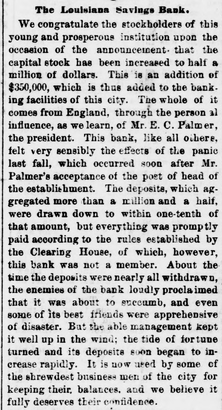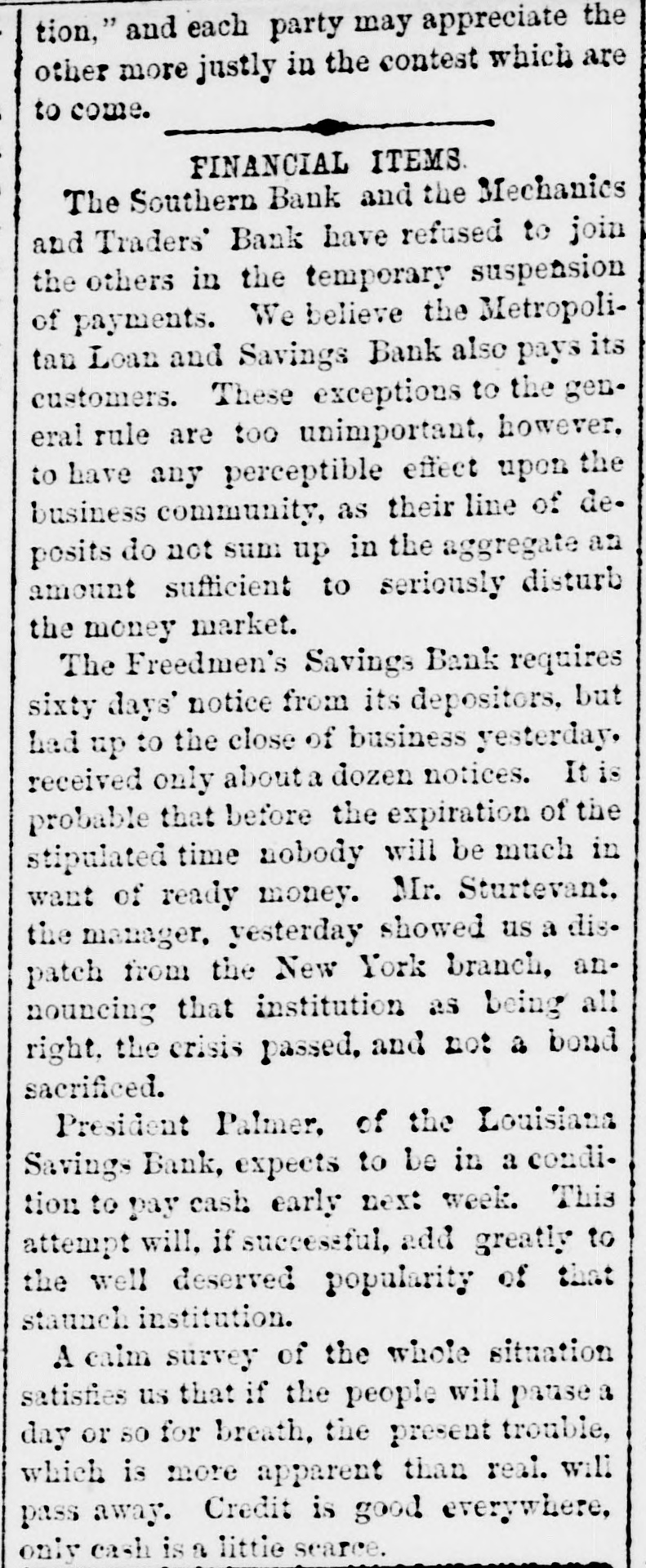 tion," and each party may appreciate the other more justly in the contest which are to come. FINANCIAL ITEMS The Southern Bank and the Mechanics and Traders' Bank have refused to join the others in the temporary suspension of payments. We believe the Metropolitan Loan and Savings Bank also pays its customers. These exceptions to the gen. eral rule are too unimportant, however. to have any perceptible effect upon the business community, as their line of de. posits do not sum up in the aggregate an amount sufficient to seriously disturb the money market. The Freedmen's Savings Bank requires sixty days' notice from its depositors, but had up to the close of business yesterday. received only abouta dozen notices. It is probable that before the expiration of the stipulated time nobody will be much in want of ready money. Mr. Sturtevant. the manager. yesterday showed us a dis. patch from the New York branch, an. nouncing that institution as being all right. the crisis passed, and not a bond sacrificed. President Palmer. of the Louisiana Savings Bank, expects to be in a condition to pay cash early nex: week. This attempt will. if successful, add greatly to the well deserved popularity of that staunch institution. A calm survey of the whole situation satisfies us that if the people will pause a day or so for breath. the present trouble, which is more apparent than real. will pass away. Credit is good everywhere, only cash is a little searce.