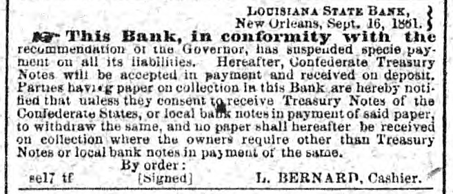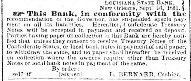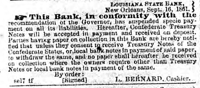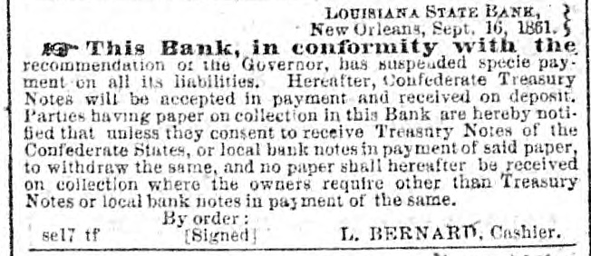 LOUISIANA STATE BANK, New Orleans, Sept. 16, 1861. This Bank, in conformity with the recummendation or the Governor, has suspended specie payment on all its liabilities. Hereafter, Confederate Treasury Notes will be accepted in payment and received on deposit. Parties having paper on collection in this Bank are hereby notified that unless they consent to receive Treasury Notes of the Confederate States, or local bank notes in payment of said paper, to withdraw the same, and no paper shall hereafter be received on collection where the owners require other than Treasury Notes or local bank notes in pay ment of the same. By order: sel7 if L. BERNARD, Cashier. (Signed]