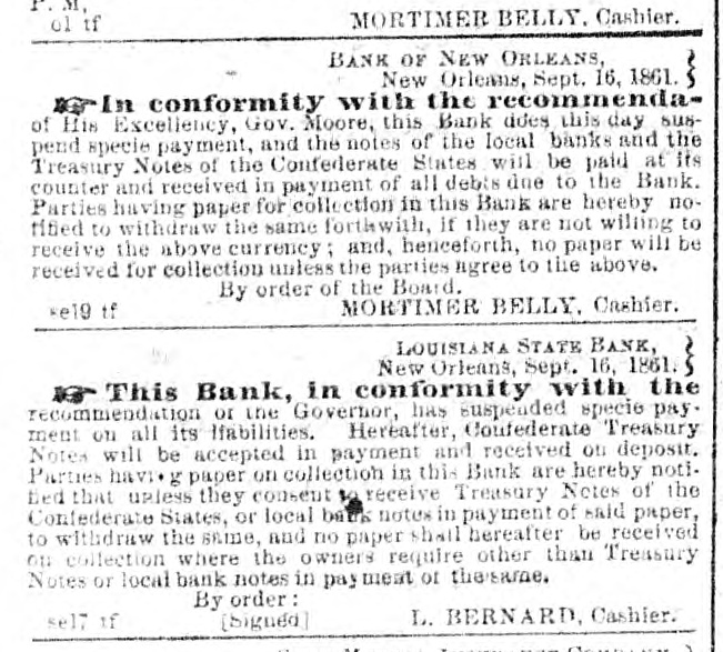 MORTIMER BELLY. Cashier. 01 if BANK OF NEW ORLEANS, } New Orleans. Sept. 16, 1861. In conformity with the recommendaof His Excellency, Gov. Moore, this Bank ddes this day suspend specie payment, and the notes of the local banks and the Treasury Notes of the Confederate States will be paid at its counter and received in payment of all debts due to the Bank. Parties having paper for collection in this Bank are hereby notified to withdraw the same forthwith, if they are not willing to receive the above currency: and, henceforth, no paper will be received for collection unless the parties agree to the above. By order of the Board. MORTIMER BELLY. Cashier. se19 LOUISIANA STATE BANK, New Orleans, Sept. 16, 1861. This Bank, in conformity with the recommendation or the Governor, has suspended specie pay. ment on all its liabilities. Hereafter, Confederate Treasury Notes will be accepted in payment and received on deposit. Parties having paper on collection in this Bank are hereby notiBed that unless they consent receive Treasury Notes of the Confederate States, or local bath notes in payment of said paper, to withdraw the same, and no paper shall hereafter be received ou collection where the owners require other than Treasury Notes or local bank notes in pay meat of therearne. By order L. BERNARD, Cashier. sel7 if (Signed
