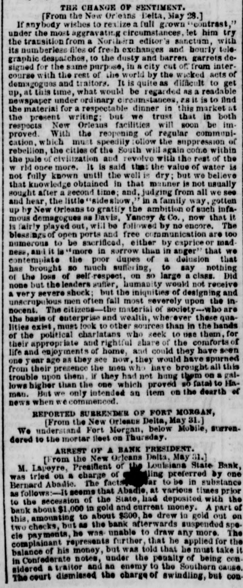 THE CHANGE OF SENTIMENT. (From the New Orleans Delta, May 28.] If anybody wishes to rex: ize a full grown "contrast," under the most aggravating circumstances. let him try the transition from a Northern editor's sanctum, with its numberless files of fresh exchanges and bourly telegraphic despatches, to the dusty and barren garrets designed for the same purpose, in a city cut off from intercourse with the rest of the world by the wicked acts of demagogues and traitors. It is quite as difficult to get up, at this time, what would be regarded as a readable newspaper under ordinary circumstances, 28 it is to find the material for a respectable dinner in this market at the present writing: but we trust that in both respects New Orleans facilities will soon be improved. With the reopening of regular communication, which must speedily follow the suppression of rebellion, the cities of the South will again cofne within the pale of civilization and revolve with the rest of the W rid once more. It is said that the value of water is not fully known until the well is dry; but we believe that knowledge obtained in that manner is not usually sought after a second time; and, judging from all we see and hear, the little "Bideshow, in a family way, gotten up by New Orleans to gratify the ambition of such infa. mous demagogues as Davis, Yancey & Co., now that it is fairly played out, will be followed by no encore. The blessings of open ports and free communication are too numerous to be sacrificed, either by caprice or mad. ness, and it is "more in sorrow than in anger" that we contemplate the poor dupes of a dolusion that has brought so much suffering, to say nothing of the loss of self-respect, on so large a class. Did none but the leaders suffer, humanity would not receive a very severe sheck; but the iniquities of designing and unscrupulous men often fall most severely upon the innocent. The citizens-the material of society-who are the basis of enterprise and wealth, wherever these qualities exist, must look to other sources than in the hands of the political charlatans who seek to use them, for their appropriate and rightful share of the comforts of life and enjoyments of home, and could they have seen one year age as they see now, they would have spurned from their presence the men who have brought all this trouble upon them, if they had not hung them on a gallows higher than the one which proved so fatal to Haman. But we only intended an item on the dearth of news when we commenced. REPORTED SUBRENDER OF FORT MORGAN, [From the New Orleans Delta, May 31.] We understand Fort Morgan, below Mobile, surrendered 10 the mortar fleet on Thursday. ARREST OF A BANK PRESIDENT. From the New Oricans Delta, May 31.] M. Lapoyre, President or the Louisiana State Bank, was tried on a charge of ling preferred by one Bernard Abadie. The facts Jar to be in substance as follows:-It seems that Abadie, at various times prior to the secession of the State, had deposited with the bank about $1,000 in gold and current money. A part of this, amounting to about $300, he drew in gold out on two checks, but as the bank afterwards suspended spocie payments, he was unable to draw any more. The complainant represents further, that he applied for the balance of his money, but was told that he must take it in Confederate notes, under the penalty of being con sidered a traitor and an enomy to the Southern cause. The court dismissed the charge of swindling, but con