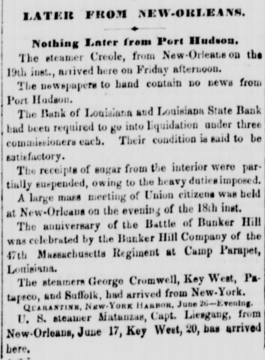 LATER FROM NEW-ORLEANS. Nothing Later from Port Hudson. The steamer Creole, from New-Orleans on the 19th inst., arrived here on Friday afternoon. The newspapers to hand contain no news from Port Hudson. The Bank of Louisiana and Louisiana State Bank had been required to go into liquidation under three commissioners each. Their condition is said to be satisfactory. The receipts of sugar from the interior were partially suspended, owing to the heavy dutiesimposed. A large mass meeting of Union citizens was held at New-Orleans on the evening of the 18th inst. The anniversary of the Battle of Bunker Hill was celebrated by the Bunker Hill Company of the 47th Massachusetts Regiment at Camp Parapet, Louisiana. The steamers George Cromwell, Key West, Patapsco, and Suffolk, had arrived from New-York. QUARANTINE, New-York HARBOR, June 26-Evening. U. S. steamer Matanzas, Capt. Liesgang, from New-Orleans, June 17, Key West, 20, has arrived here.