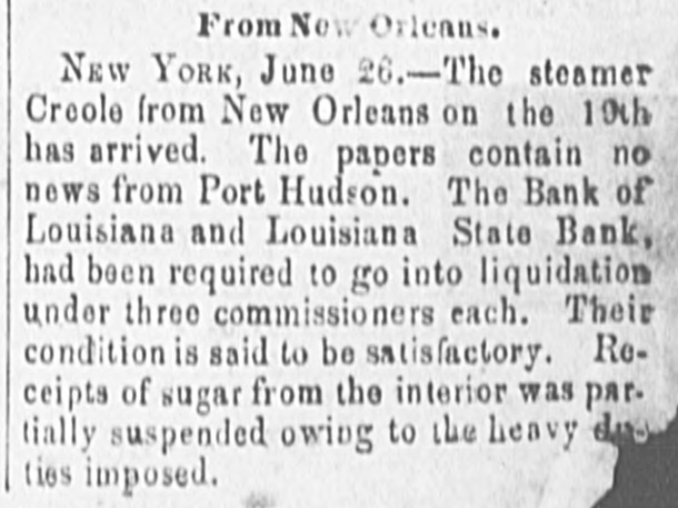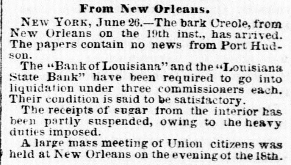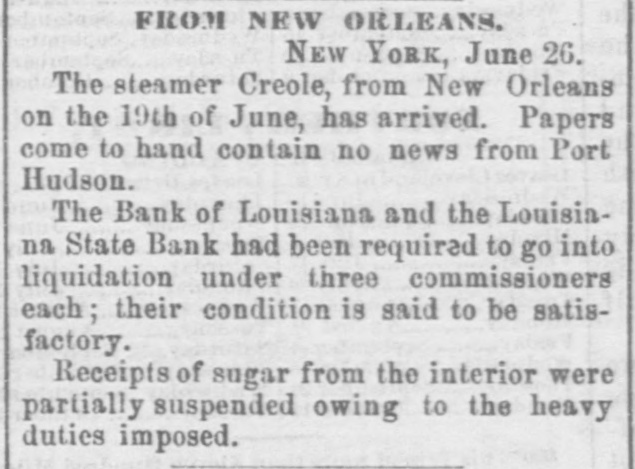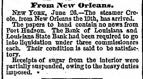 FROM NEW ORLEANS. NEW YORK, June 26. The steamer Creole, from New Orleans on the 19th of June, has arrived. Papers come to hand contain no news from Port Hudson. The Bank of Louisiana and the Louisiana State Bank had been required to go into liquidation under three commissioners each; their condition is said to be satisfactory. Receipts of sugar from the interior were partially suspended owing to the heavy duties imposed.