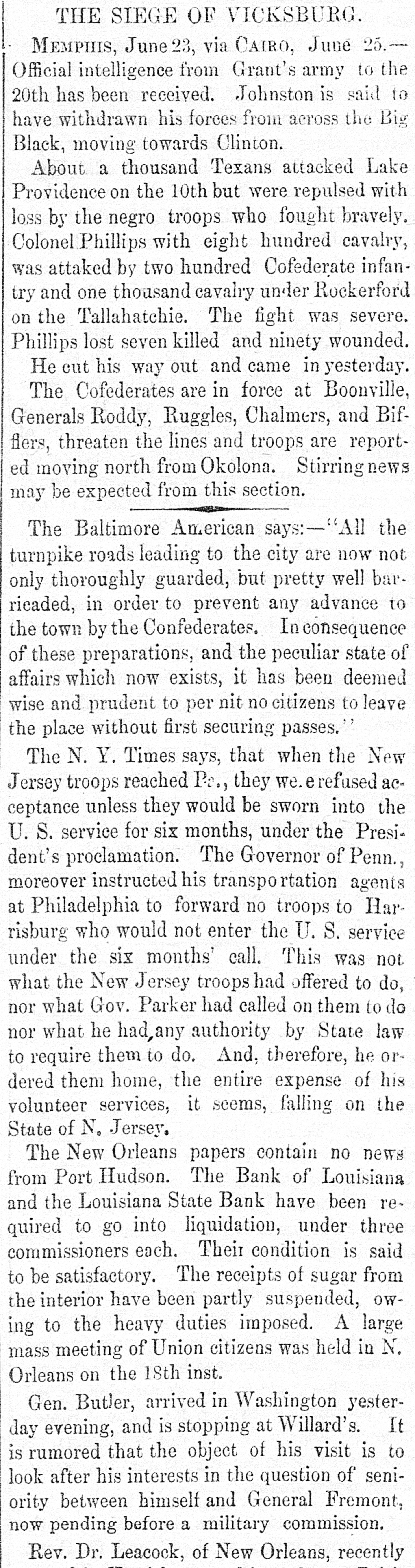 THE SIEGE OF VICKSBURG. MEMPHIS, June 23, via CAIRO, June 25.---Official intelligence from Grant's army to the 20th has been received. Johnston is said to have withdrawn his forces from across the Big Black, moving towards Clinton. About a thousand Texans attacked Lake Providence on the 10th but were repulsed with loss by the negro troops who fought bravely. Colonel Phillips with eight hundred cavalry, was attaked by two hundred Cofederate infantry and one thousand cavalry under Rockerford on the Tallahatchie. The fight was severe. Phillips lost seven killed and ninety wounded. He cut his way out and came in yesterday. The Cofederates are in force at Boonville, Generals Roddy, Ruggles, Chalmers, and Biffiers, threaten the lines and troops are reported moving north from Okolona. Stirring news may be expected from this section. The Baltimore American says:-"All the turnpike roads leading to the city are now not only thoroughly guarded, but pretty well barricaded, in order to prevent any advance to the town by the Confederates. Inconsequence of these preparations, and the peculiar state of affairs which now exists, it has been deemed wise and prudent to per nit no citizens to leave the place without first securing passes." The N. Y. Times says, that when the New Jersey troops reached Po., they we. refused acceptance unless they would be sworn into the U. S. service for six months, under the President's proclamation. The Governor of Penn., moreover instructed his transportation agents at Philadelphia to forward no troops to Harrisburg who would not enter the U. S. service under the six months' call. This was not what the New Jersey troops had offered to do, nor what Gov. Parker had called on them to do nor what he had, any authority by State law to require them to do. And, therefore, he ordered them home, the entire expense of his volunteer services, it seems, falling on the State of N. Jersey. The New Orleans papers contain no news from Port Hudson. The Bank of Louisiana and the Louisiana State Bank have been required to go into liquidation, under three commissioners each. Their condition is said to be satisfactory. The receipts of sugar from the interior have been partly suspended, owing to the heavy duties imposed. A large mass meeting of Union citizens was held in N. Orleans on the 18th inst. Gen. Butler, arrived in Washington yesterday evening, and is stopping at Willard's. It is rumored that the object of his visit is to look after his interests in the question of seniority between himself and General Fremont, now pending before a military commission. Rev. Dr. Leacock, of New Orleans, recently