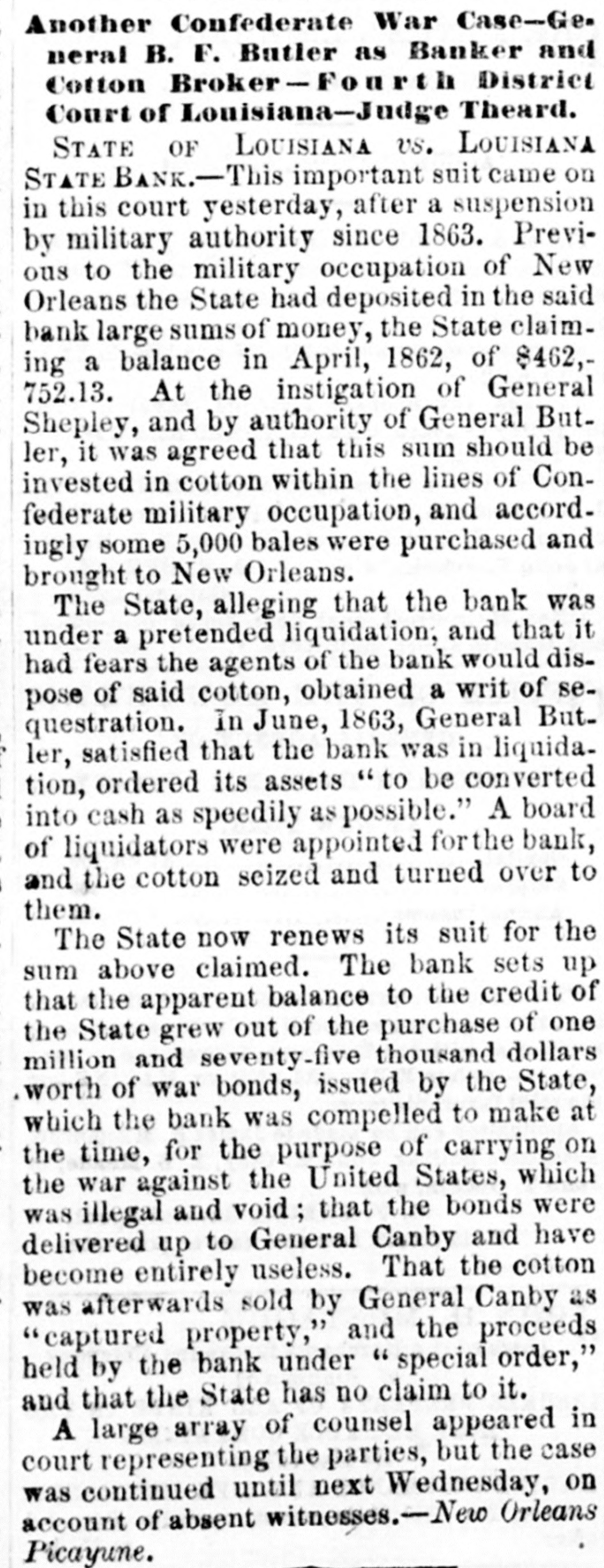 Another Confederate War Case-Ge. neral B. F. Batler as Banker and Cotton Broker-Fourth District Court of Louisiana-Judge Theard. STATE OF LOUISIANA vs. LOUISIANA STATE BANK.-This important suit came on in this court yesterday, after a suspension by military authority since 1863. Previous to the military occupation of New Orleans the State had deposited in the said bank large sums of money, the State claiming a balance in April, 1862, of $462,752.13. At the instigation of General Shepley, and by authority of General Butler, it was agreed that this sum should be invested in cotton within the lines of Confederate military occupation, and accordingly some 5,000 bales were purchased and brought to New Orleans. The State, alleging that the bank was under a pretended liquidation; and that it had fears the agents of the bank would dispose of said cotton, obtained a writ of sequestration. In June, 1863, General Butler, satisfied that the bank was in liquidation, ordered its assets "to be converted into cash as speedily as possible." A board of liquidators were appointed forthe bank, and the cotton seized and turned over to them. The State now renews its suit for the sum above claimed. The bank sets up that the apparent balance to the credit of the State grew out of the purchase of one million and seventy-five thousand dollars worth of war bonds, issued by the State, which the bank was compelled to make at the time, for the purpose of carrying on the war against the United States, which was illegal and void ; that the bonds were delivered up to General Canby and have become entirely useless. That the cotton was afterwards sold by General Canby as "captured property," and the proceeds held by the bank under "special order," and that the State has no claim to it. A large array of counsel appeared in court representing the parties, but the case was continued until next Wednesday, on account of absent witnesses.-New Orleans Picayune.