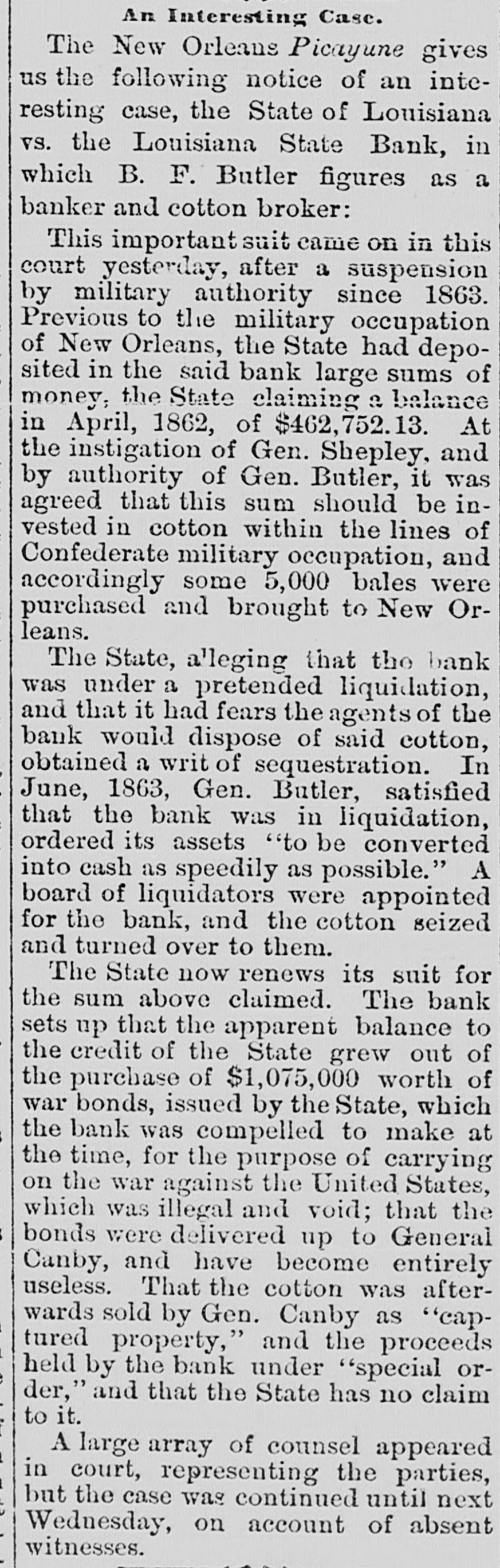 An Interesting Case. The New Orleans Picayune gives us the following notice of an interesting case, the State of Louisiana vs. the Louisiana State Bank, in which B. F. Butler figures as a banker and cotton broker: This important suit came on in this court yesterday, after a suspension by military authority since 1863. Previous to the military occupation of New Orleans, the State had deposited in the said bank large sums of money, the State claiming a balance in April, 1862, of $462,752.13. At the instigation of Gen. Shepley, and by authority of Gen. Butler, it was agreed that this sum should be invested in cotton within the lines of Confederate military occupation, and accordingly some 5,000 bales were purchased and brought to New Orleans. The State, alleging that the bank was under a pretended liquidation, and that it had fears the agents of the bank would dispose of said cotton, obtained a writ of sequestration. In June, 1863, Gen. Butler, satisfied that the bank was in liquidation, ordered its assets "to be converted into cash as speedily as possible." A board of liquidators were appointed for the bank, and the cotton seized and turned over to them. The State now renews its suit for the sum above claimed. The bank sets up that the apparent balance to the credit of the State grew out of the purchase of $1,075,000 worth of war bonds, issued by the State, which the bank was compelled to make at the time, for the purpose of carrying on the war against the United States, which was illegal and void; that the bonds were delivered up to General Canby, and have become entirely useless. That the cotton was afterwards sold by Gen. Canby as "captured property," and the proceeds held by the bank under "special order," and that the State has no claim to it. A large array of counsel appeared in court, representing the parties, but the case was continued until next Wednesday, on account of absent witnesses.